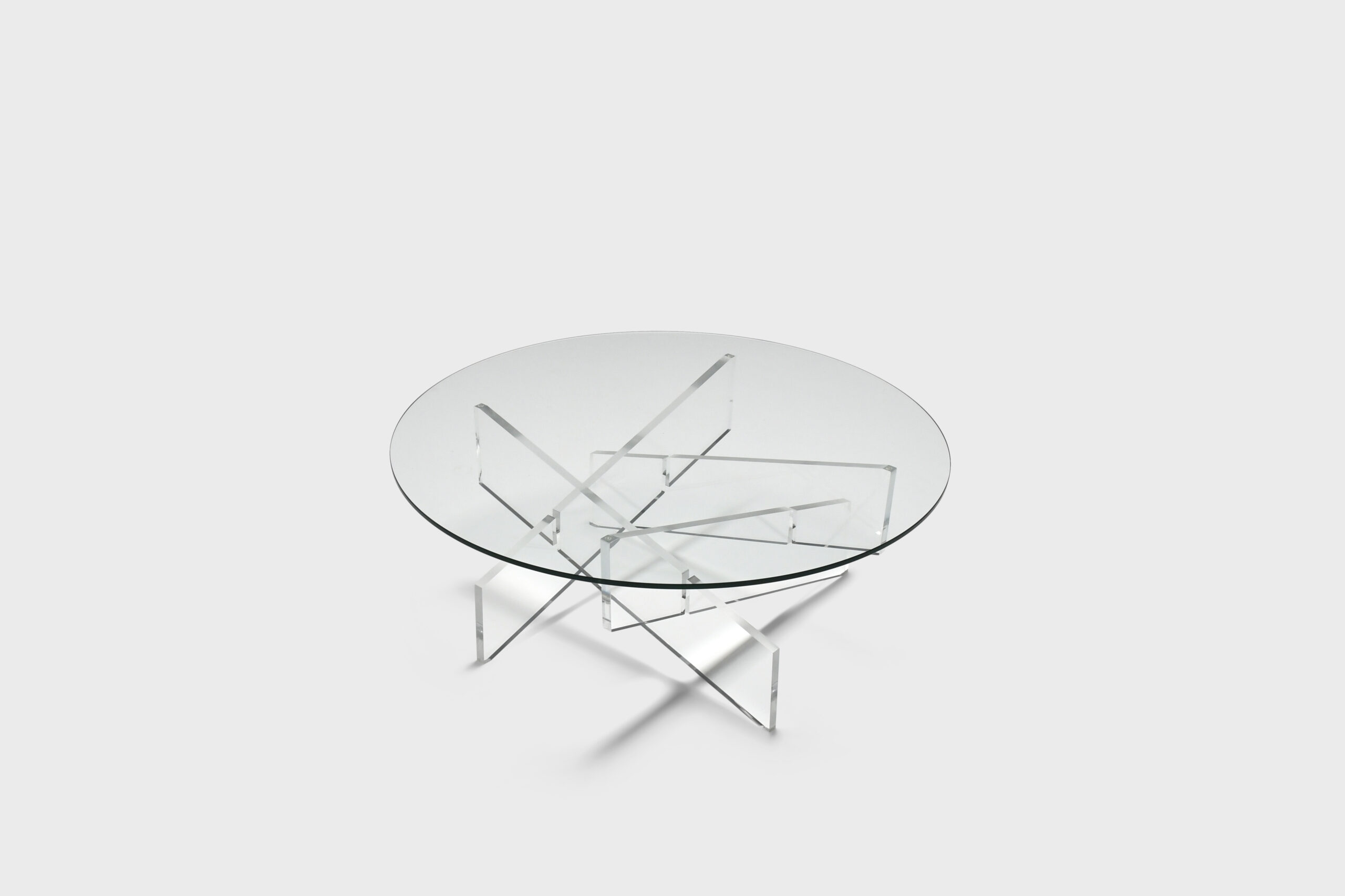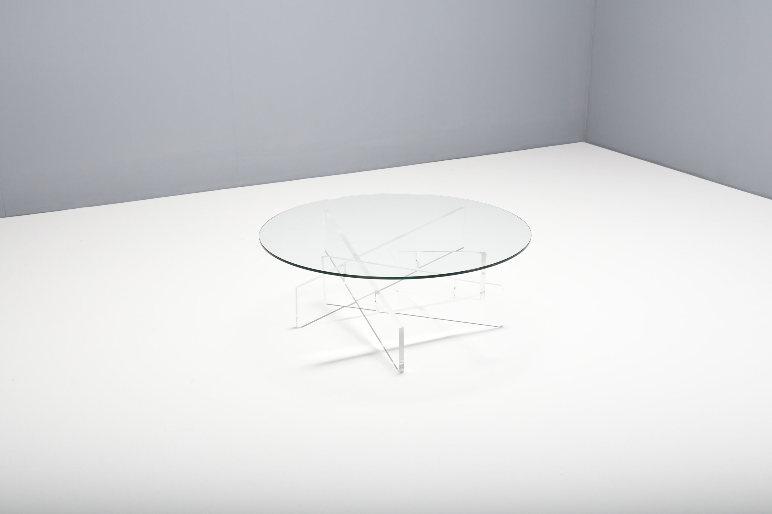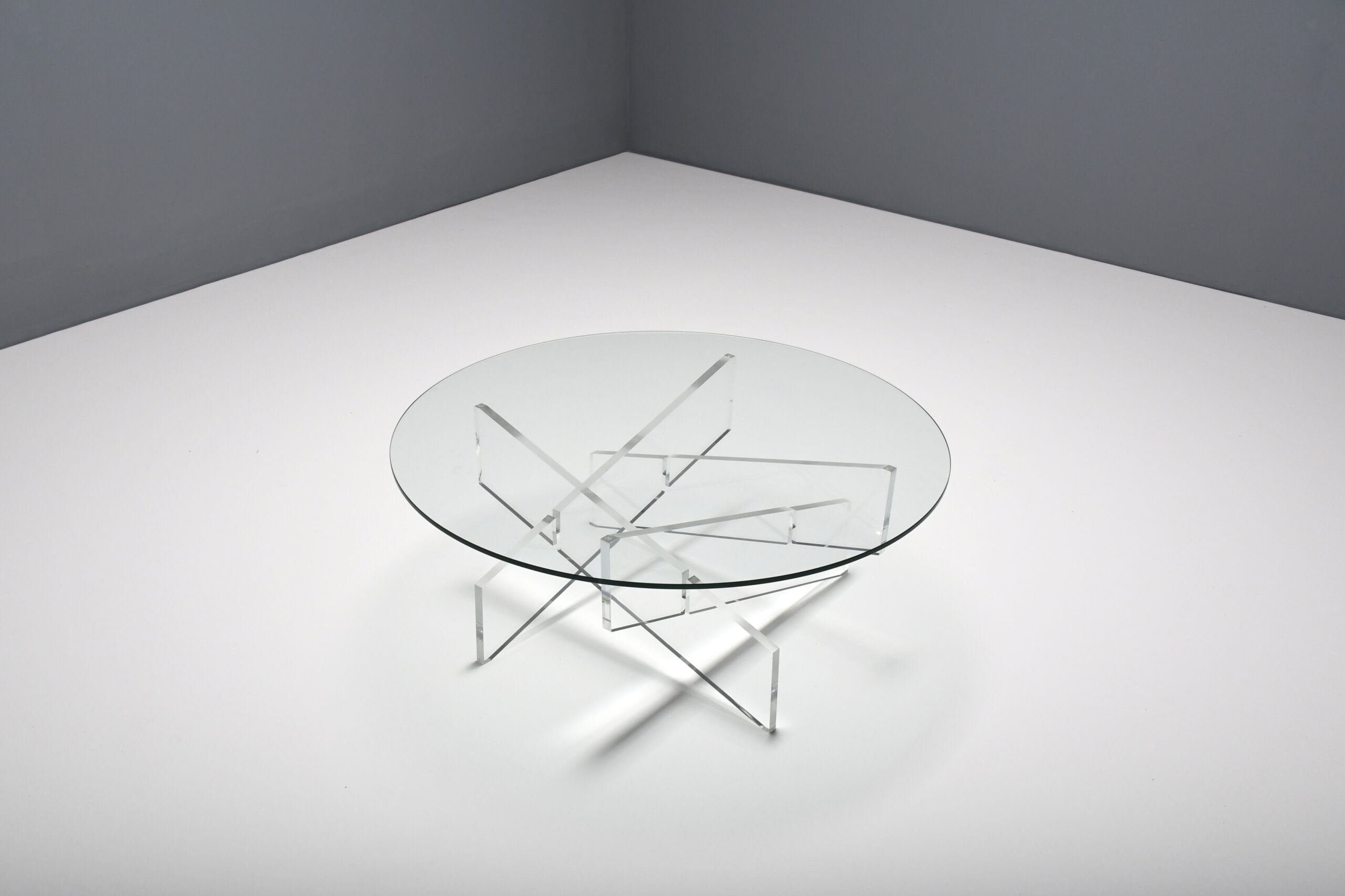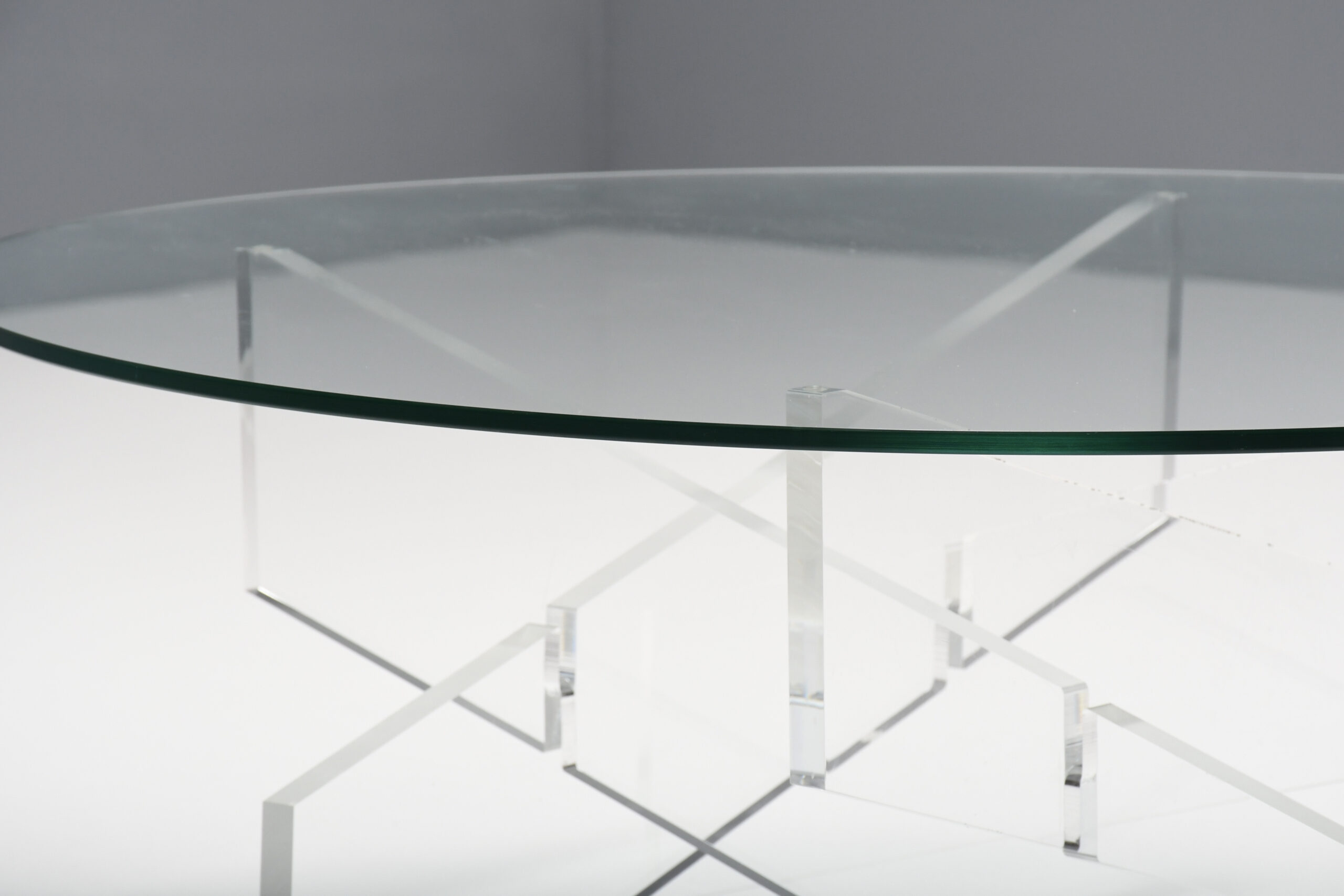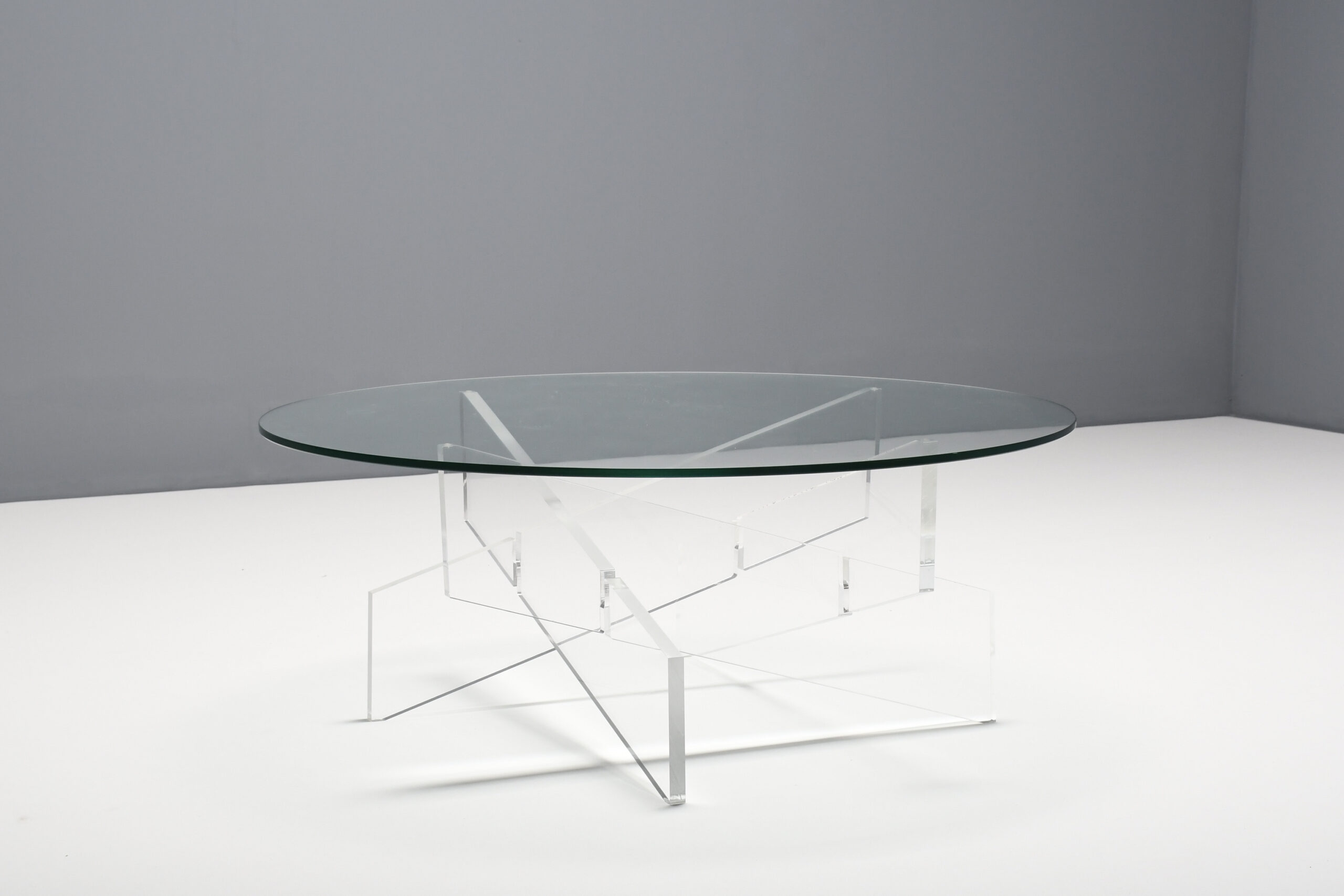 The table has a round glass top which is supported by a base formed by crossed lucite beams which give a beautiful effect.