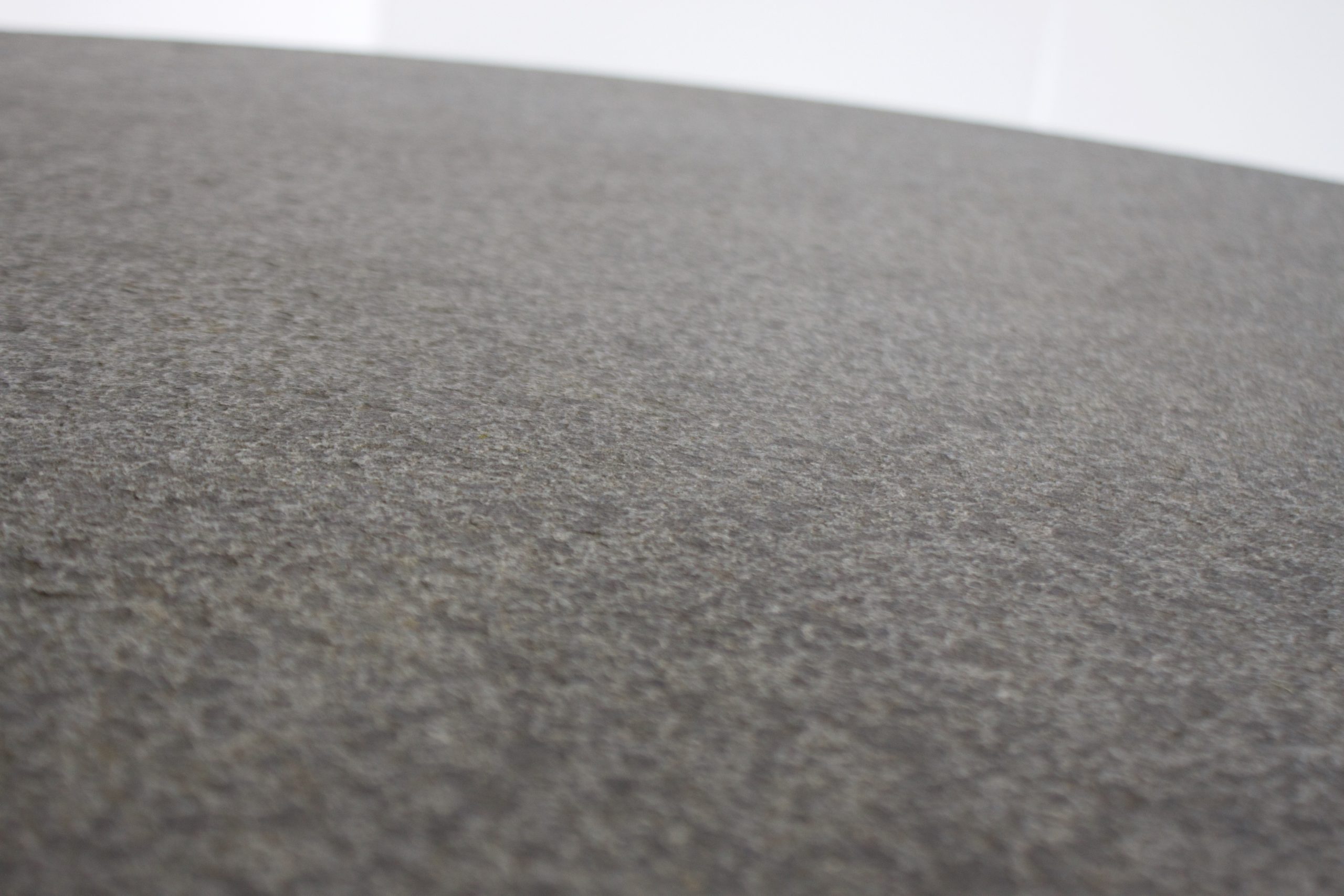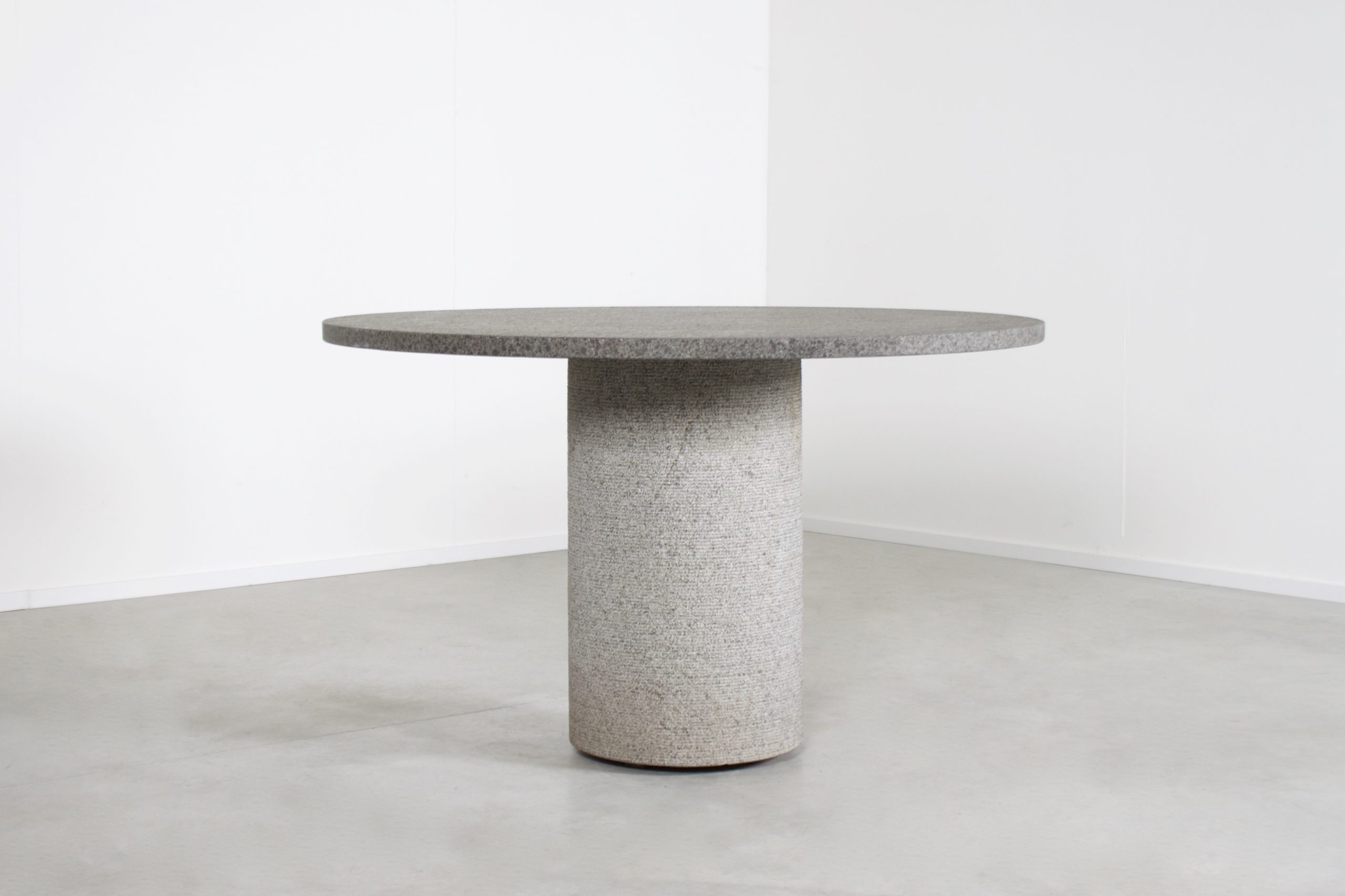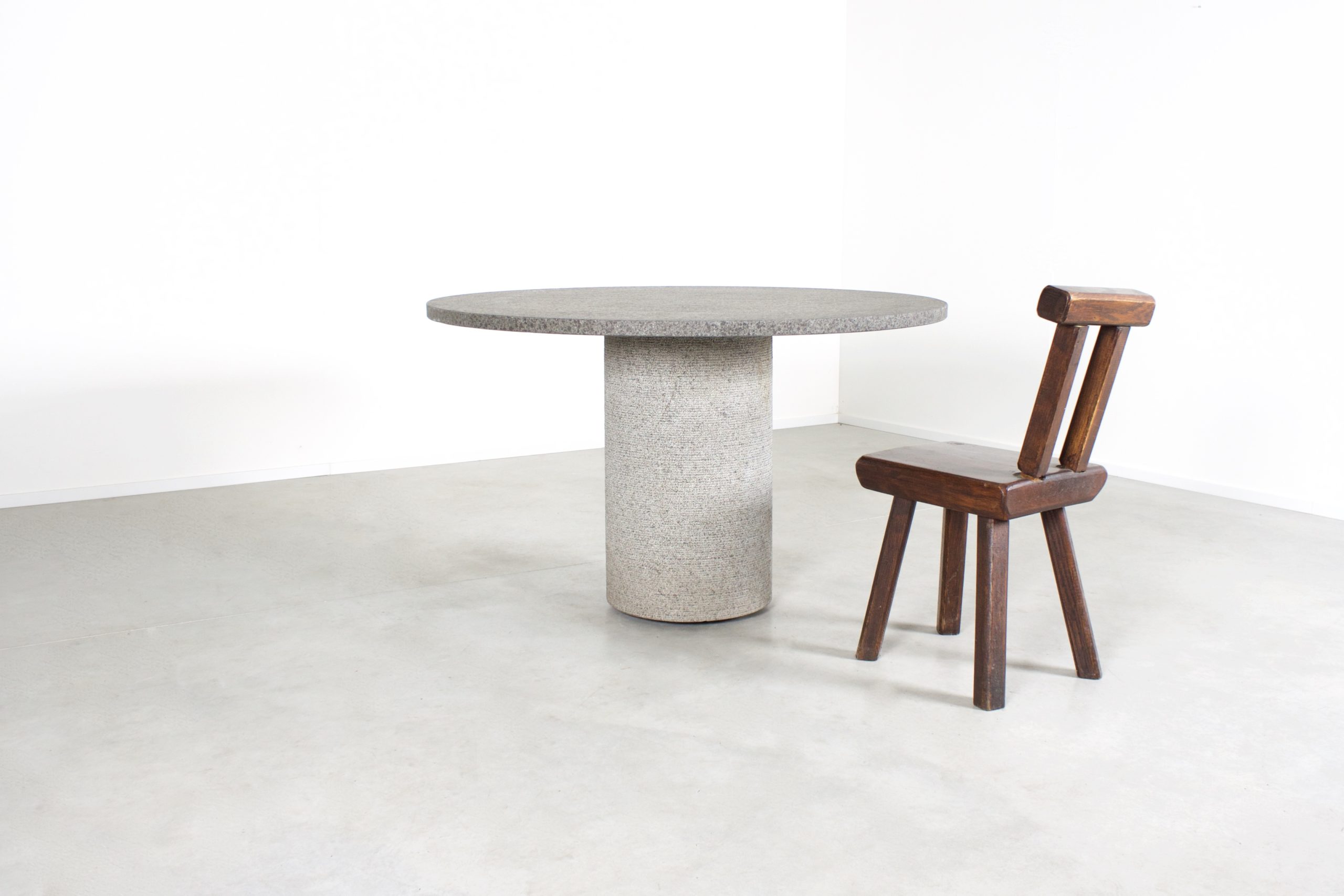Round center/dining table in very good condition. Made in Belgium in the 1970s. The table is made of Belgian bluestone which gives it an impressive Brutalist look. The bluestone has a beautiful rough structure which adds to the Brutalist character. The thick travertine top in variegated tones of black and grey, which balances perfectly and securely on the base by it’s own weight. Round pedestal base also made of bluestone. The table is in a beautiful condition and has no chips or cracks.