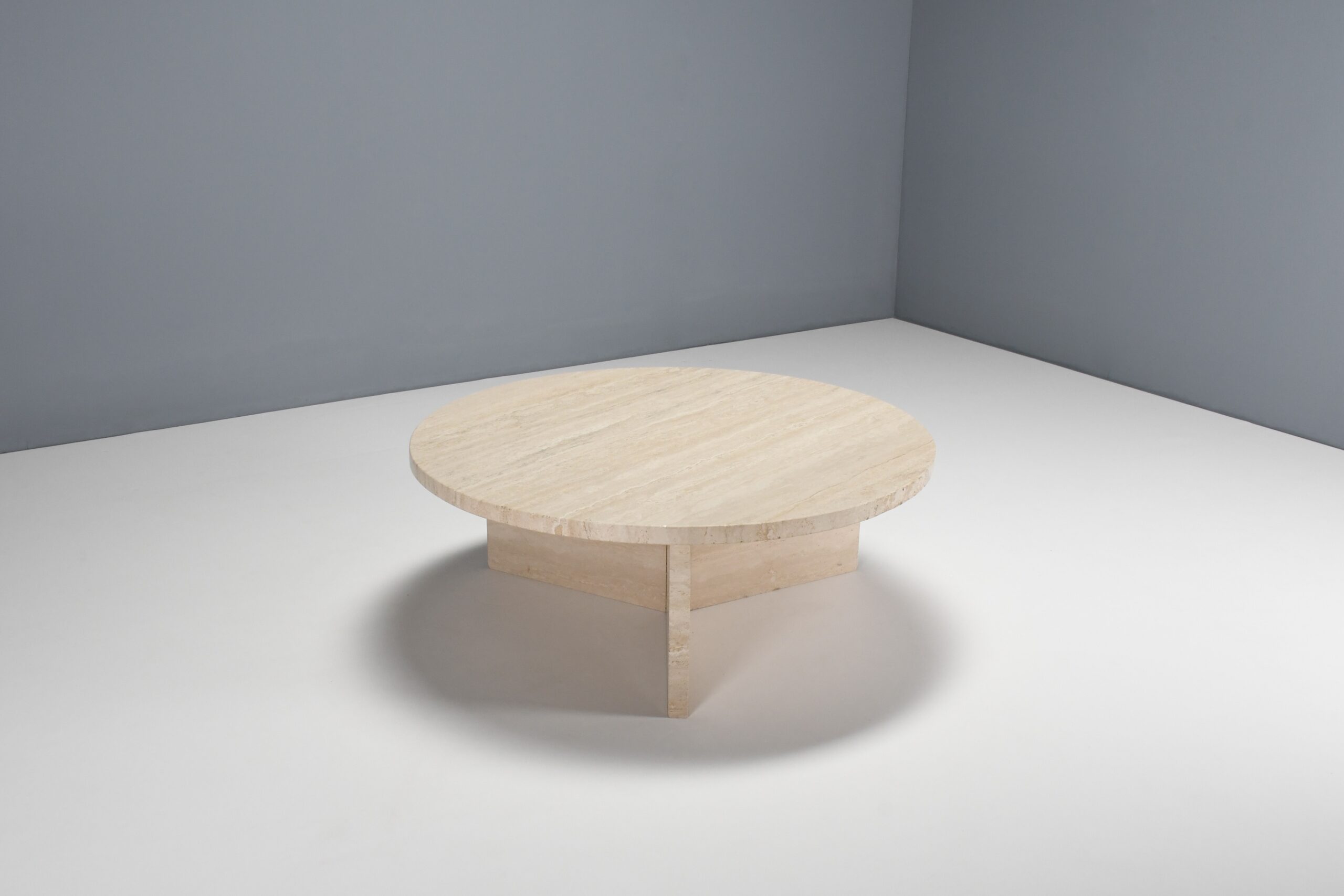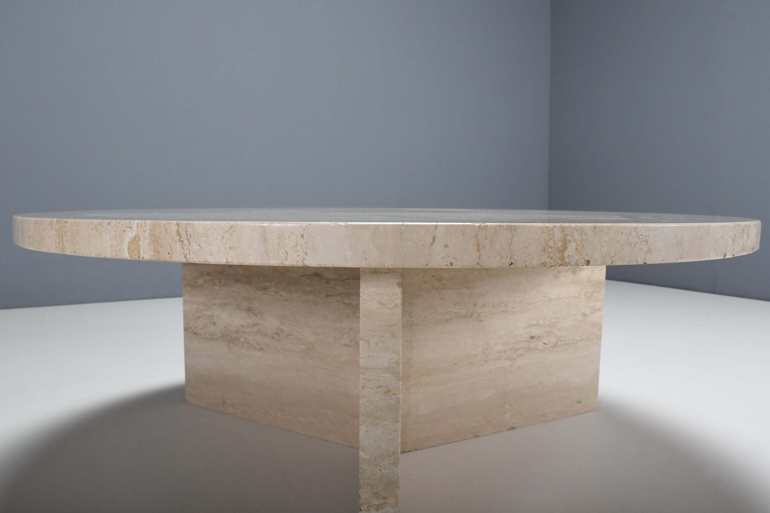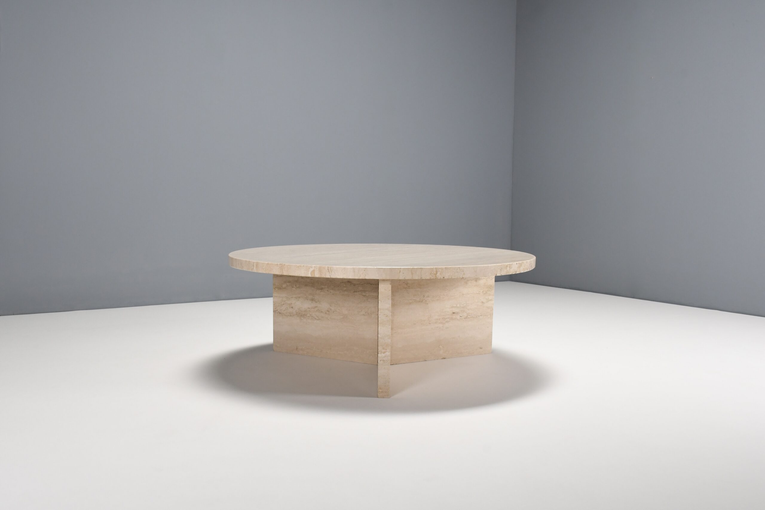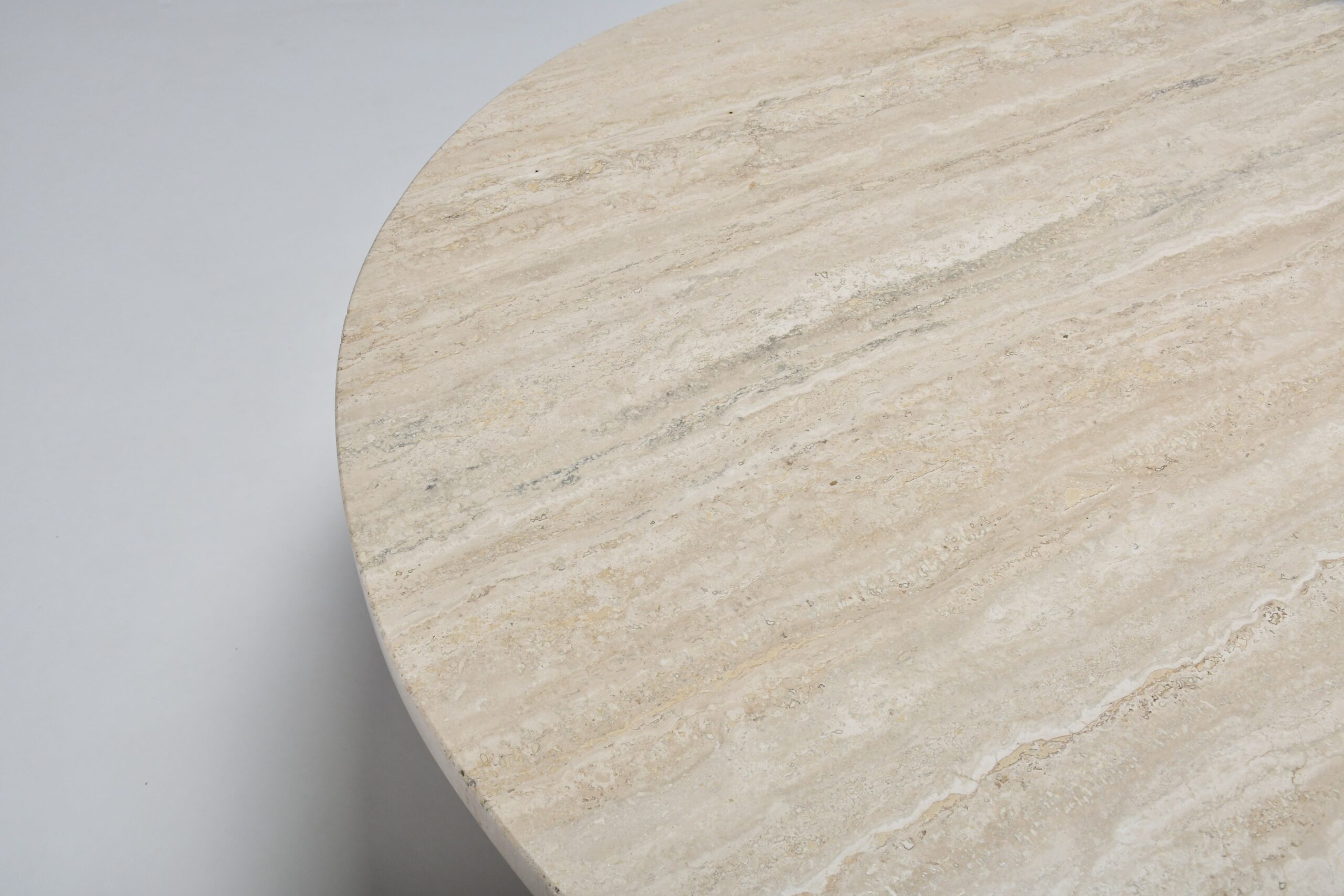 The table has a thick solid round travertine top.
