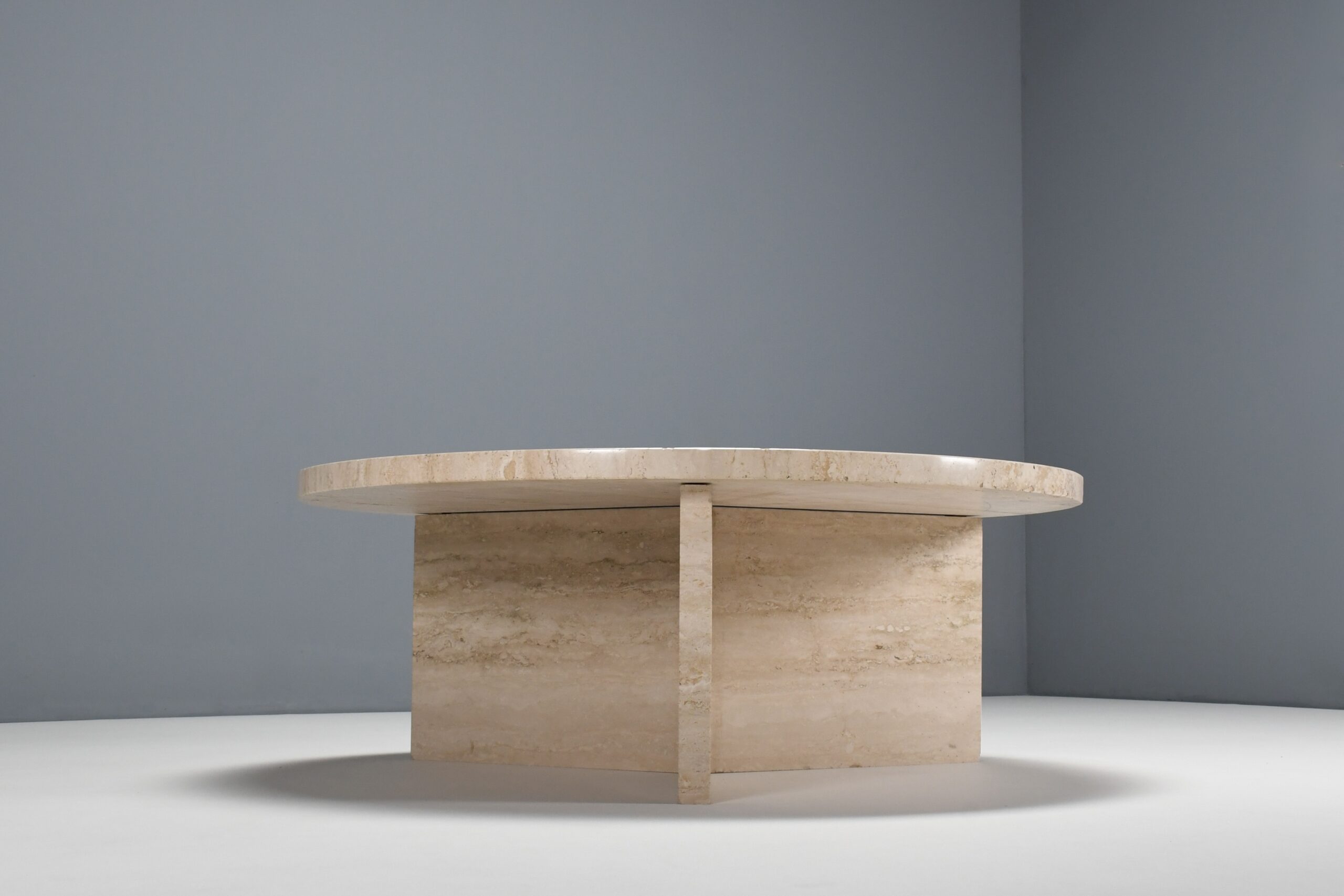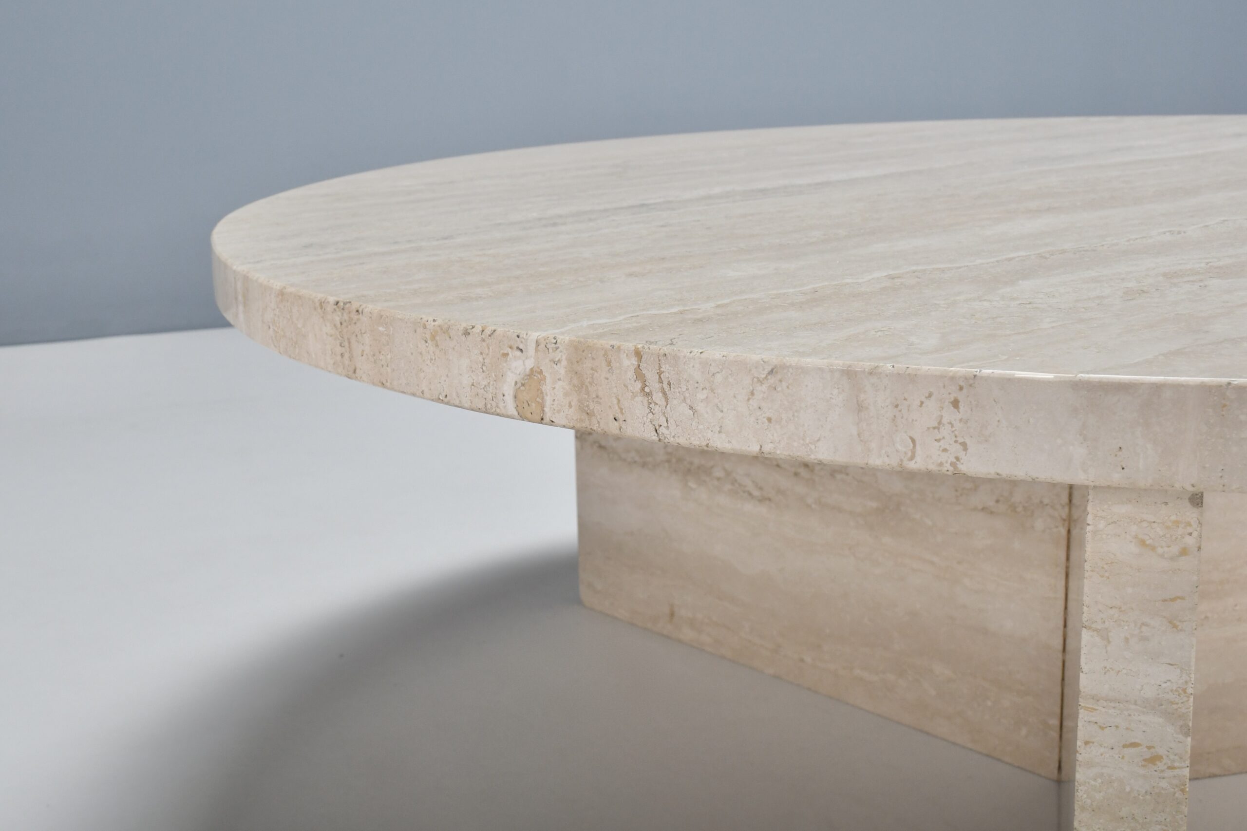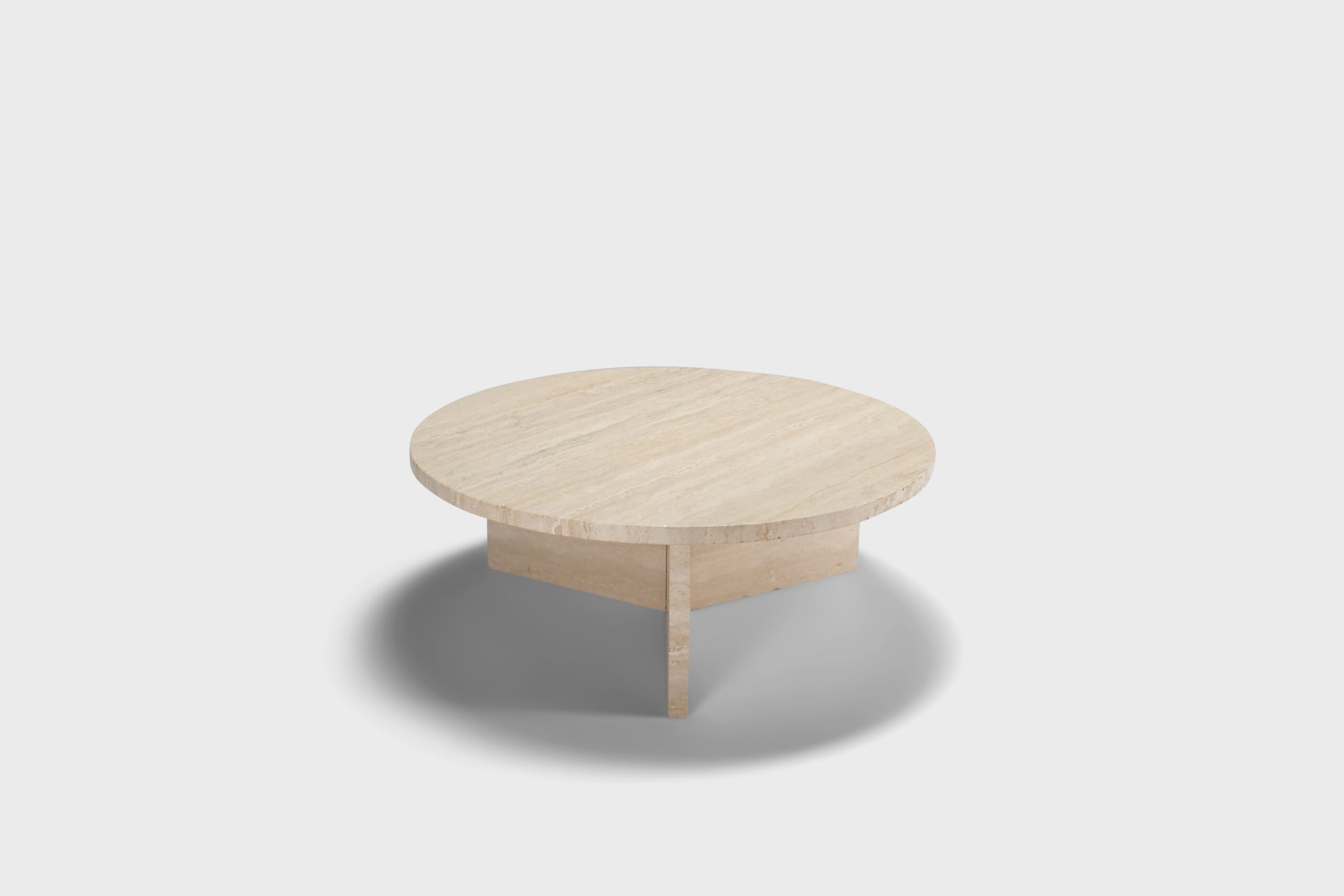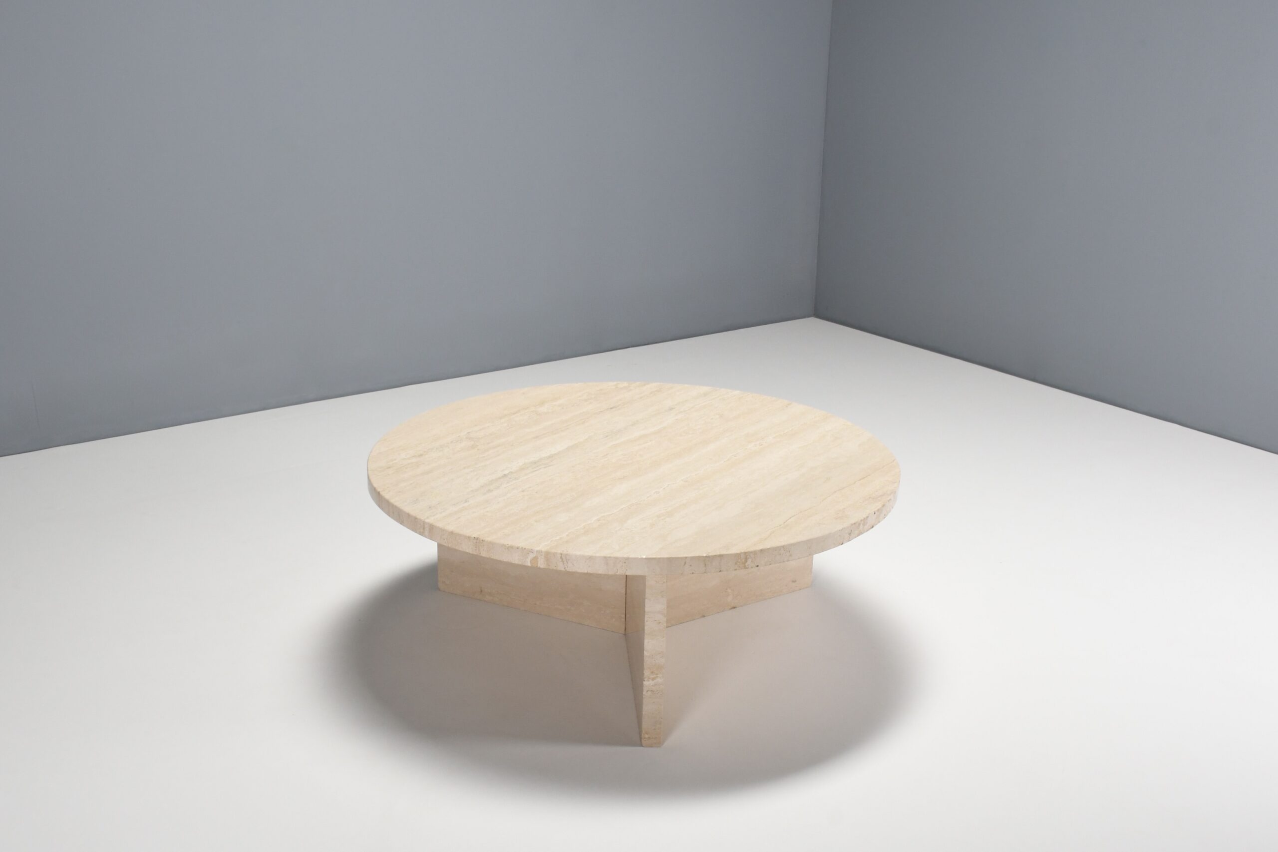 The table has a thick solid round travertine top.