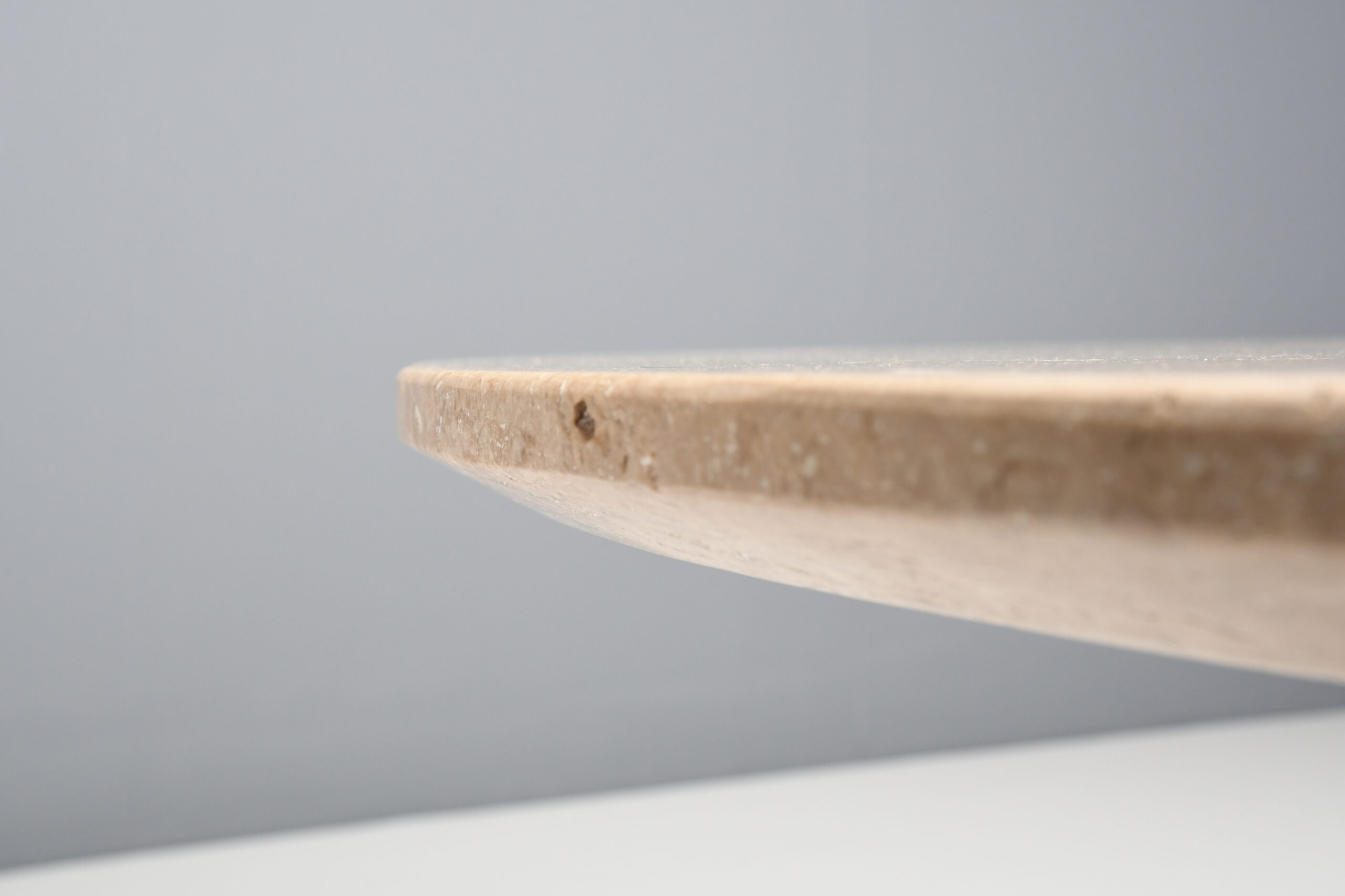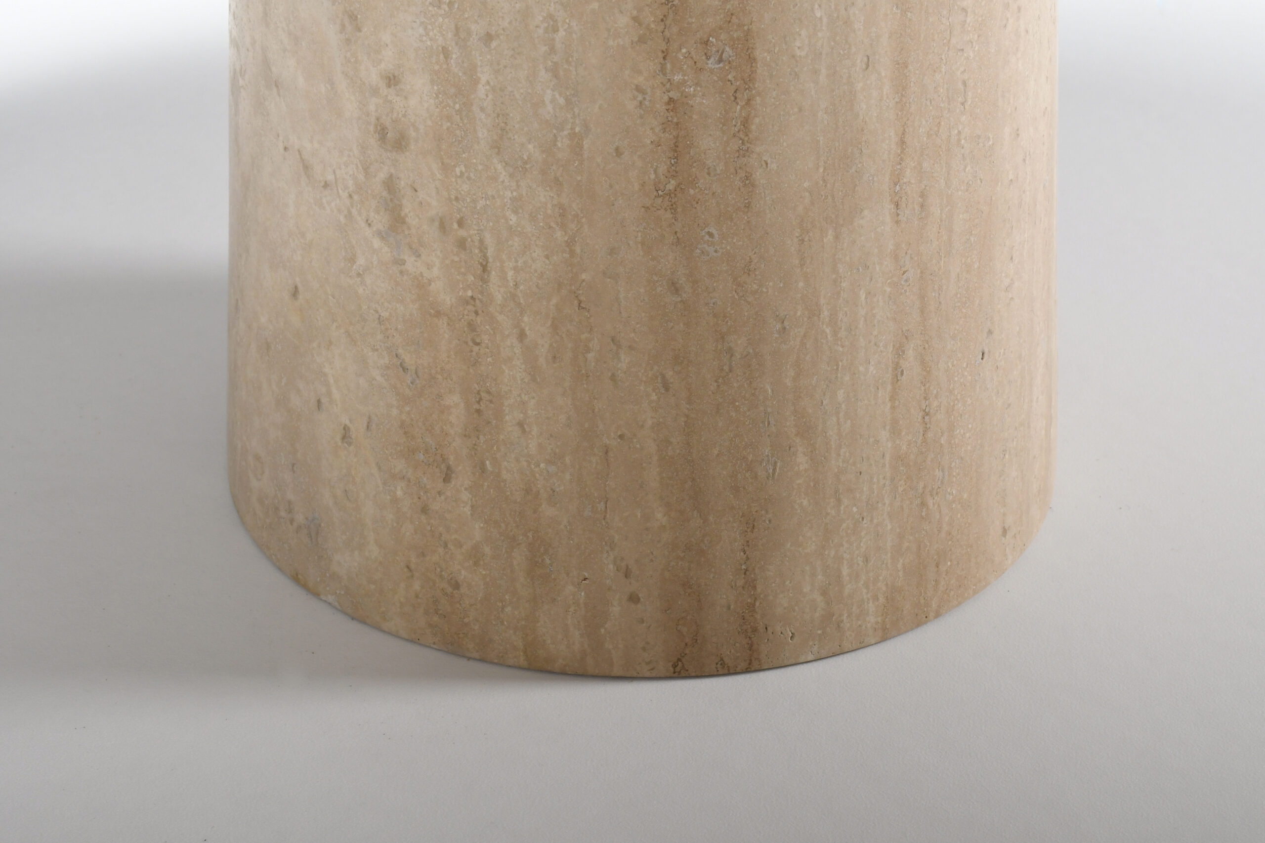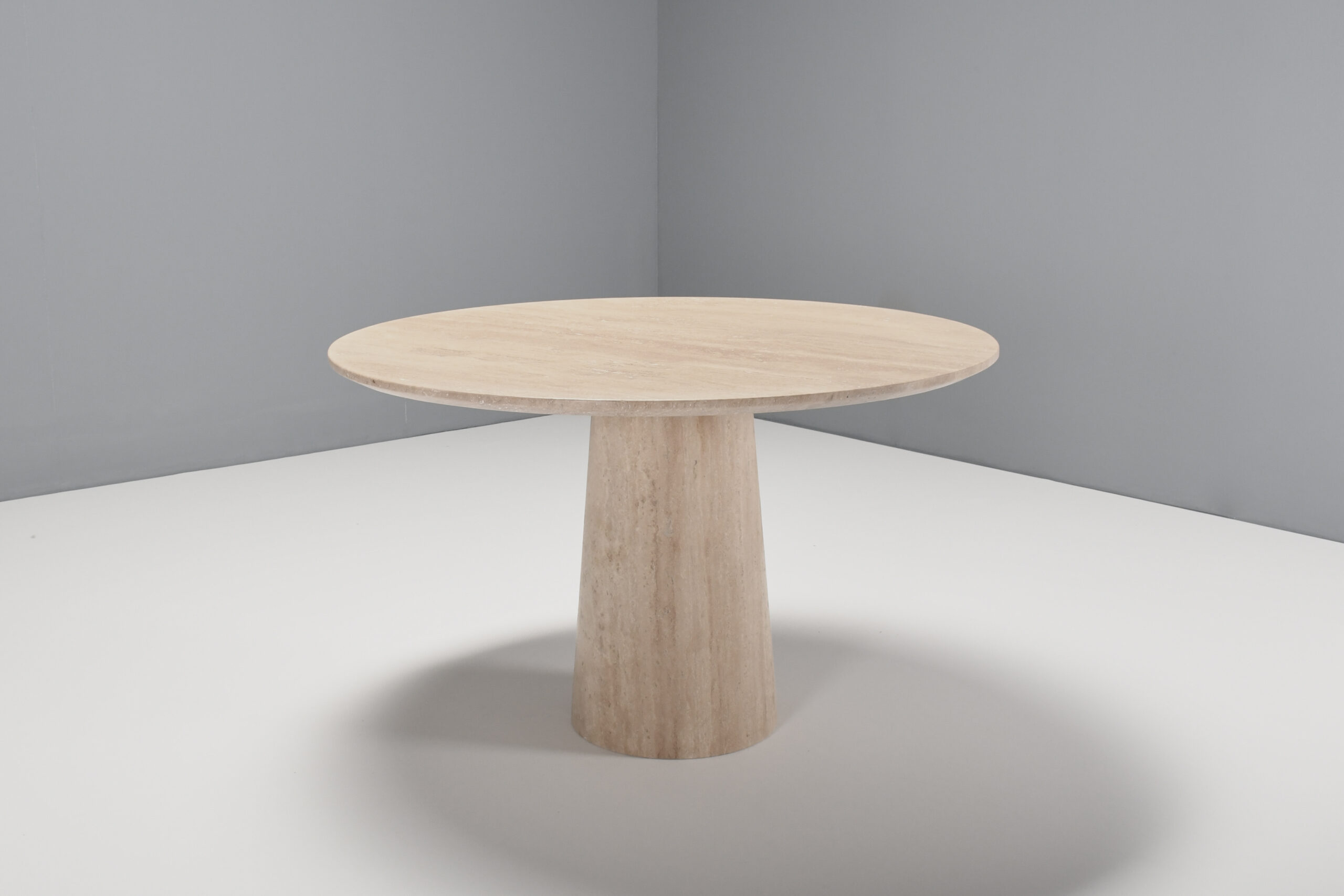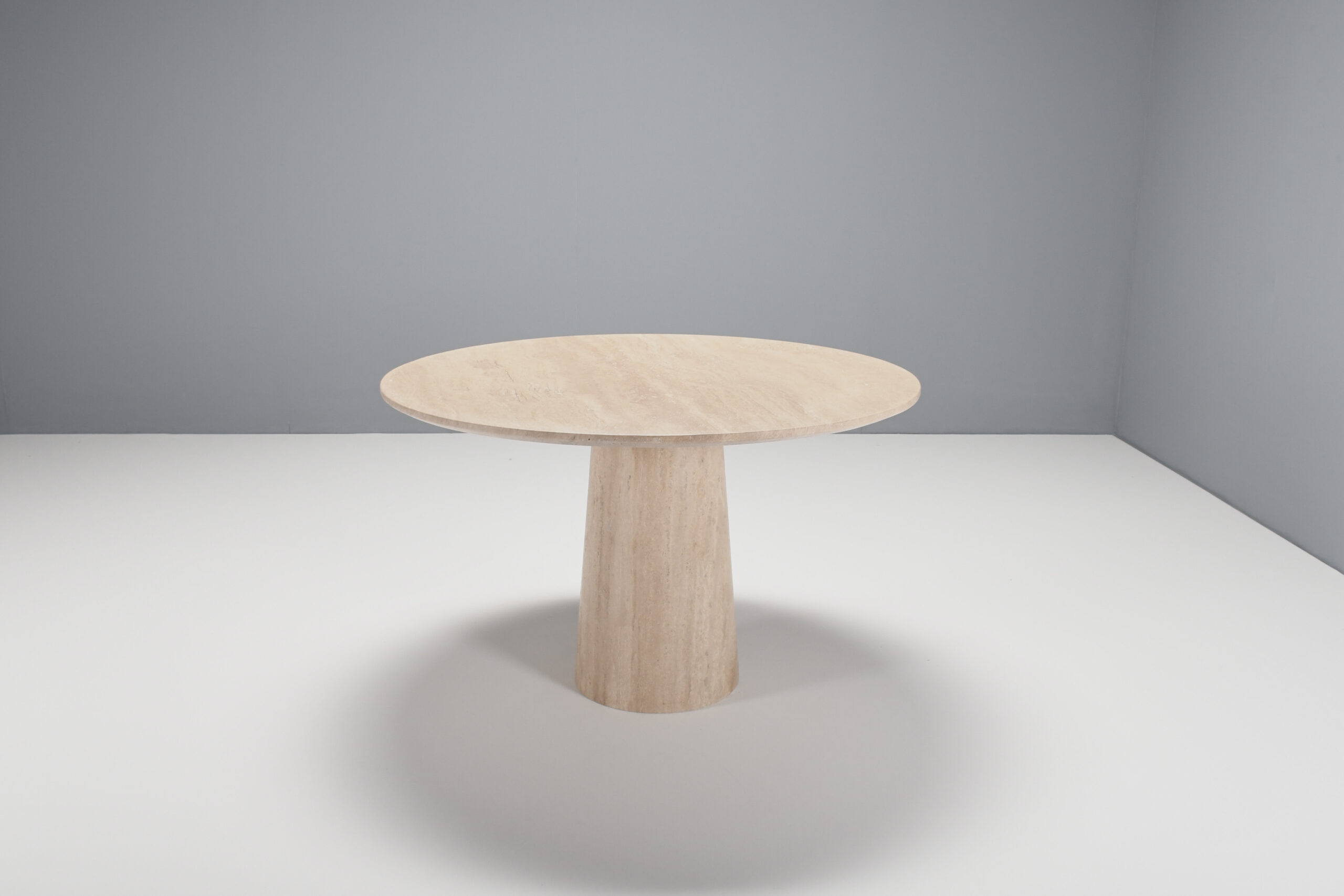 The top rests on a round, conical shaped pedestal base also made of travertine.