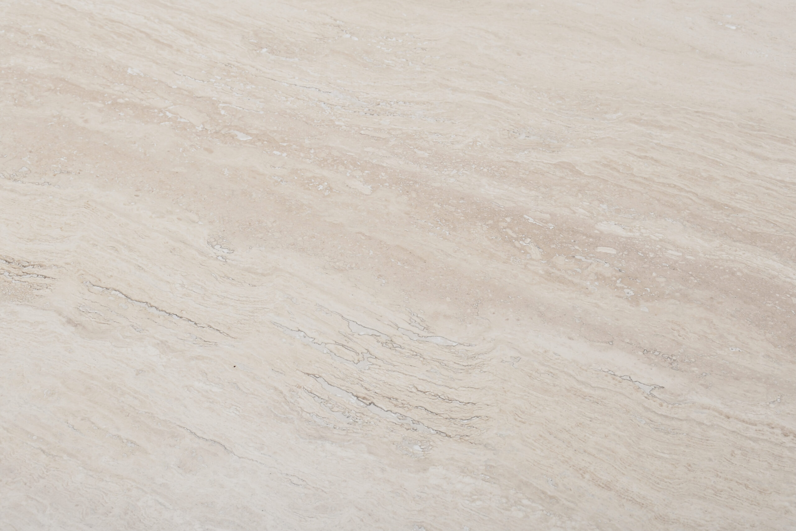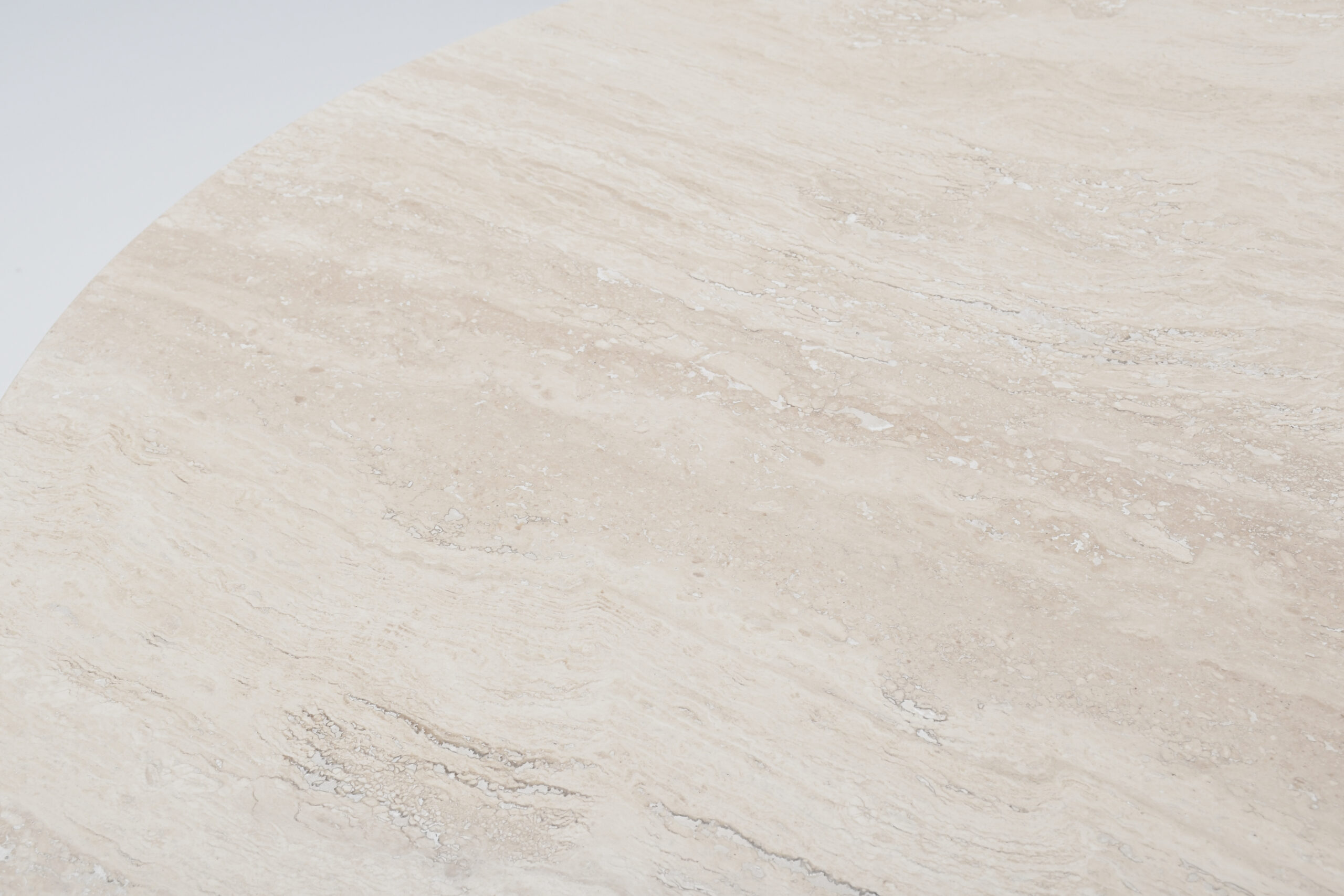 Thick travertine top in variegated tones of beige and brown.