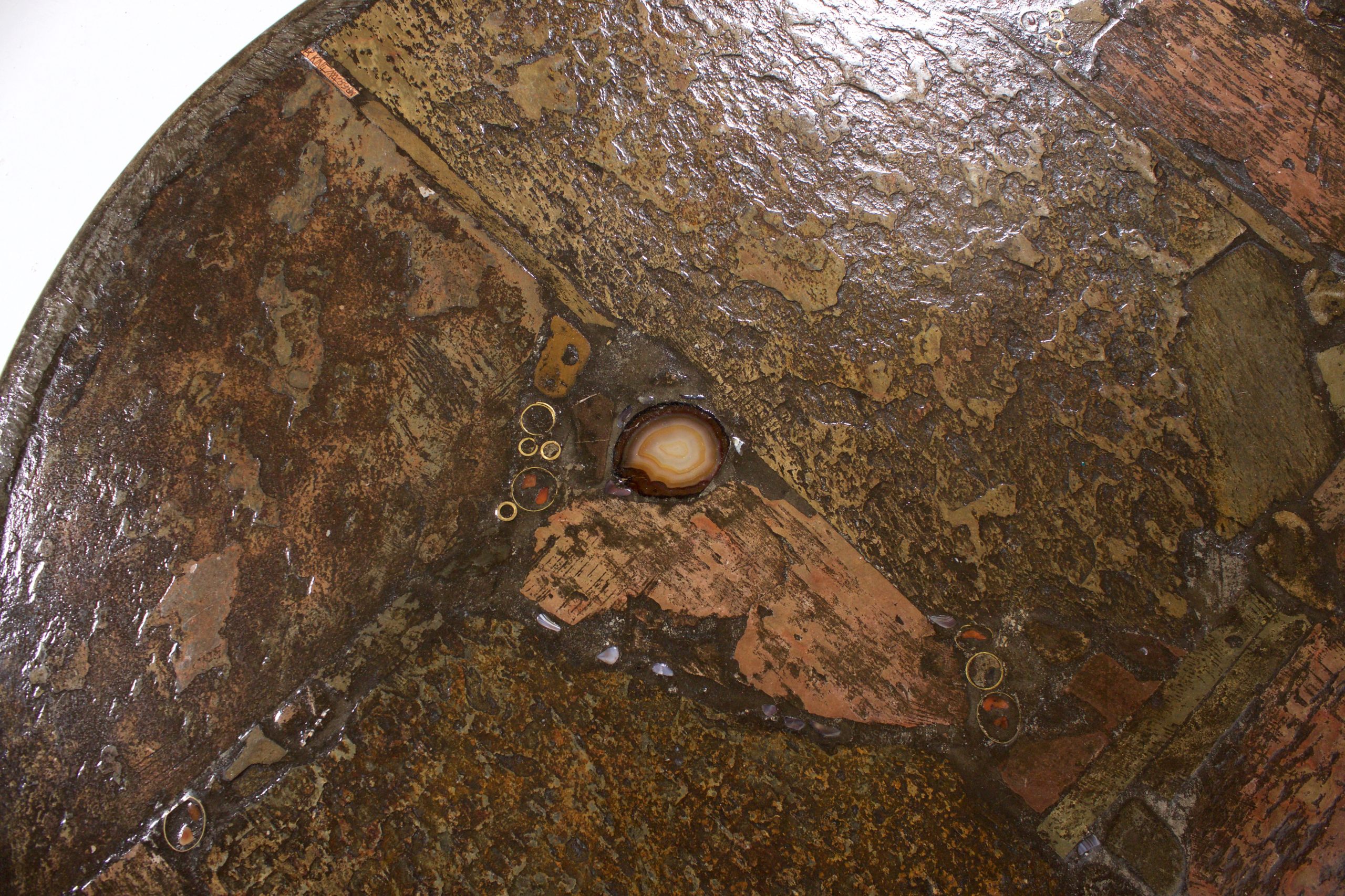 The tabletop is a mosaic of slate panels, colored stones, brass details and agate