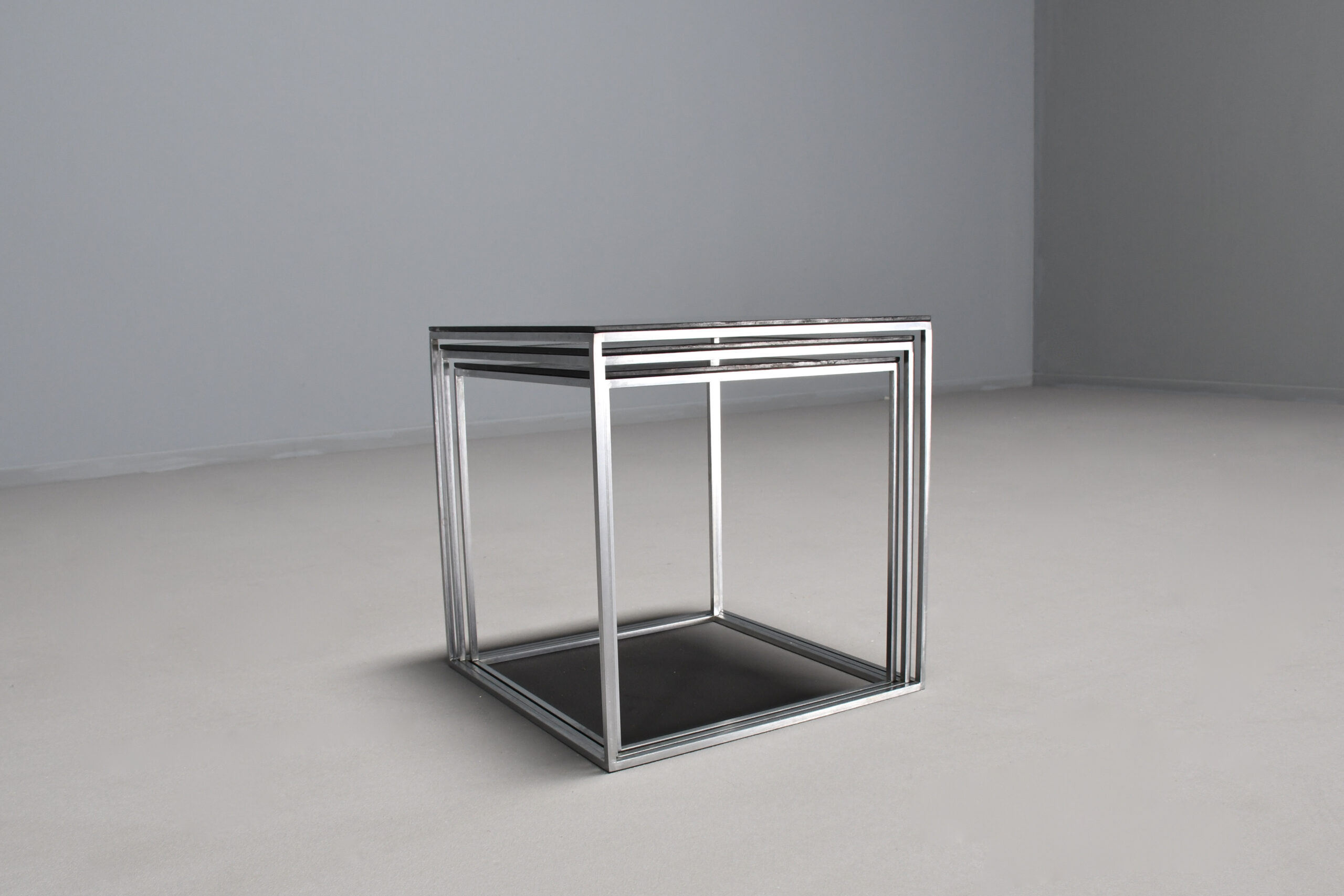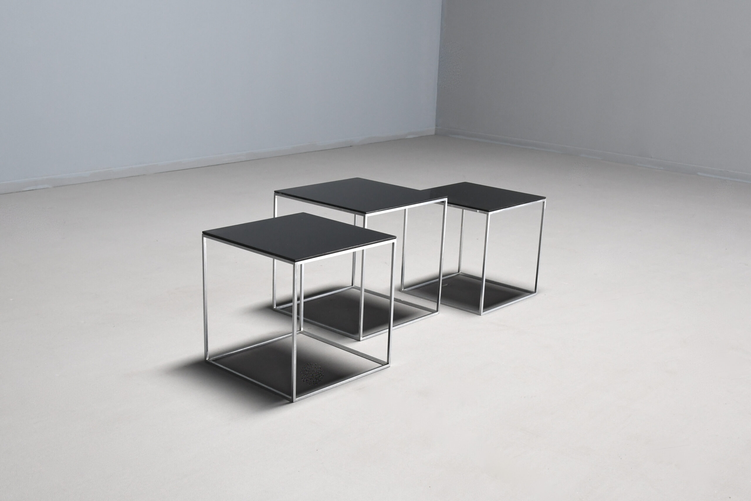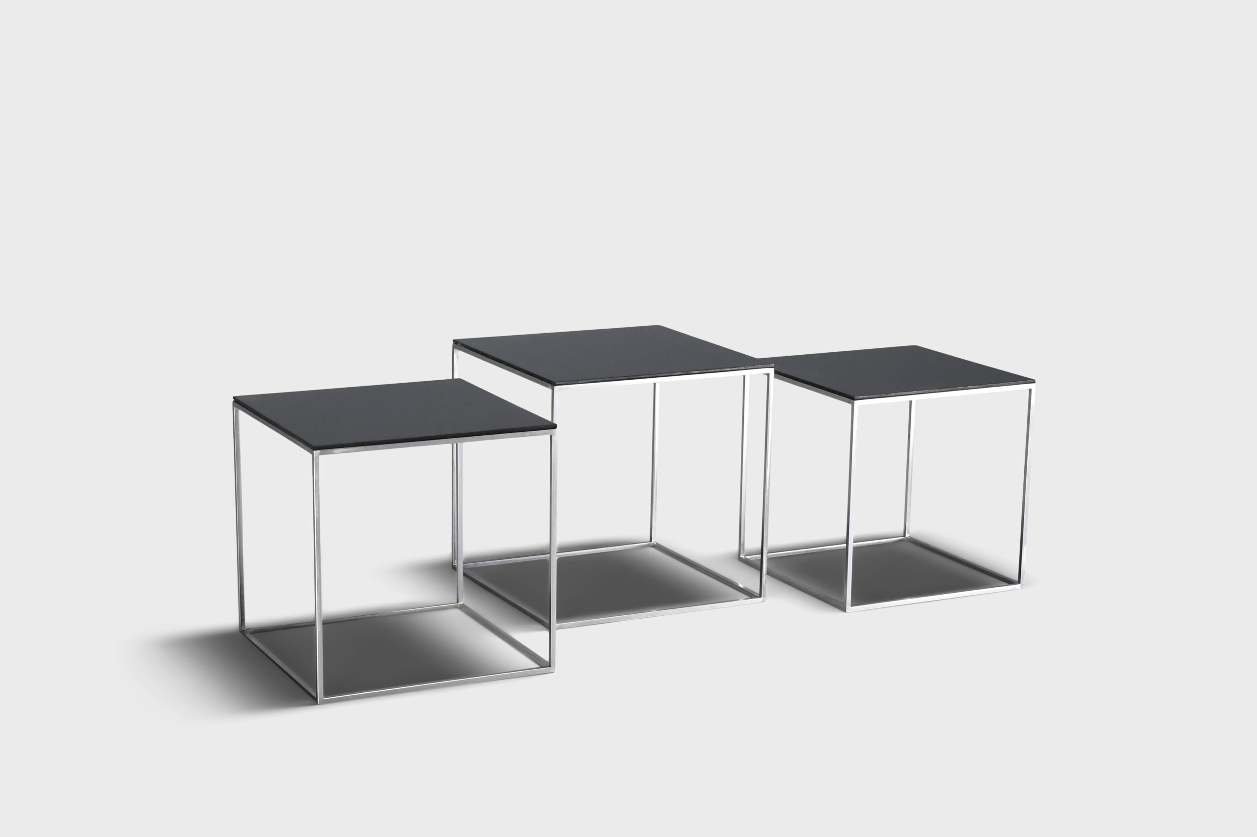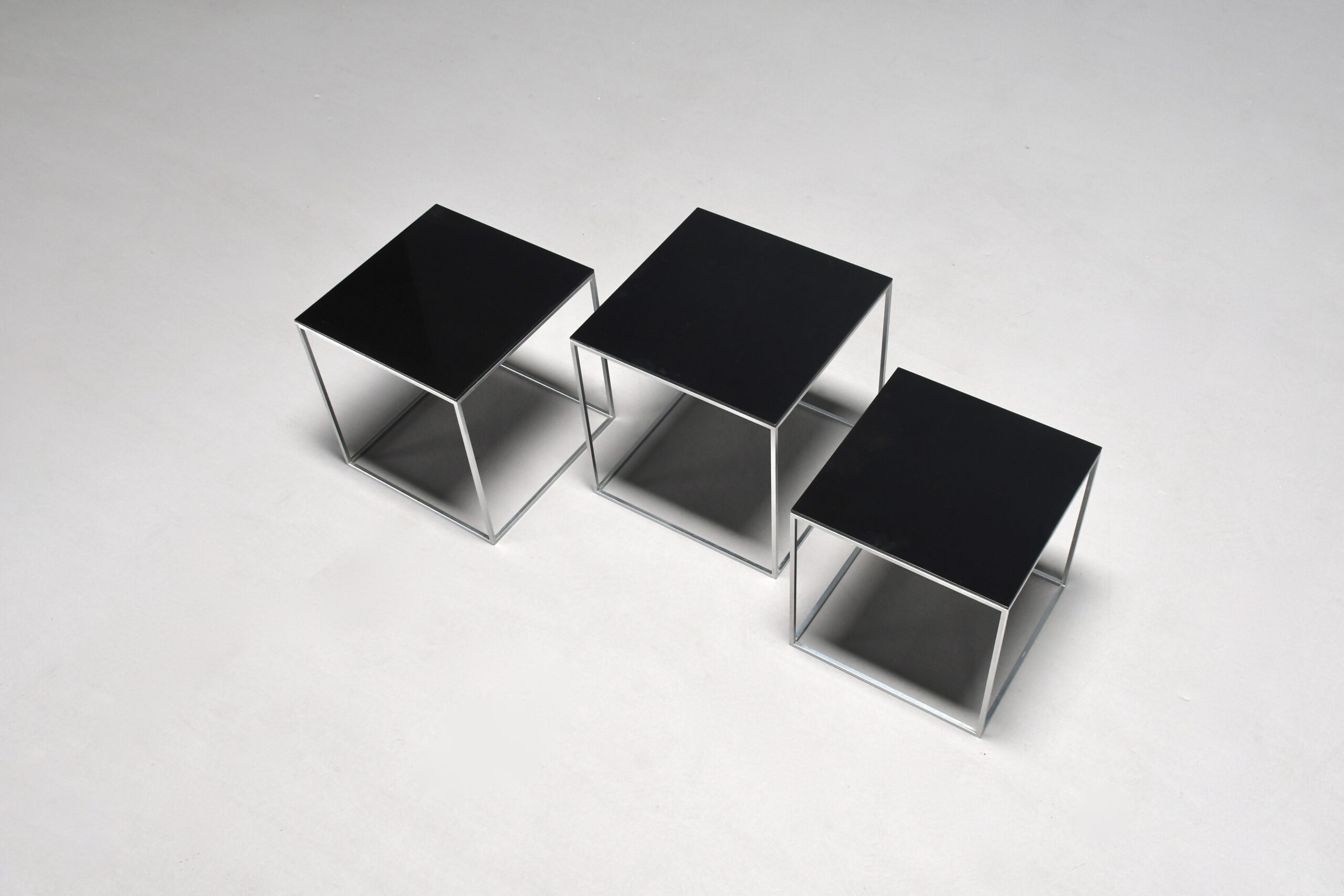 The minimalist shaped tables have a square steel frame with black polished acrylic top.