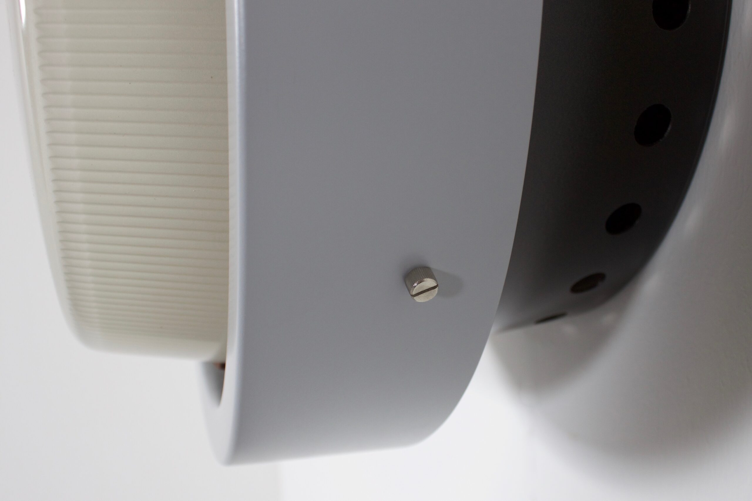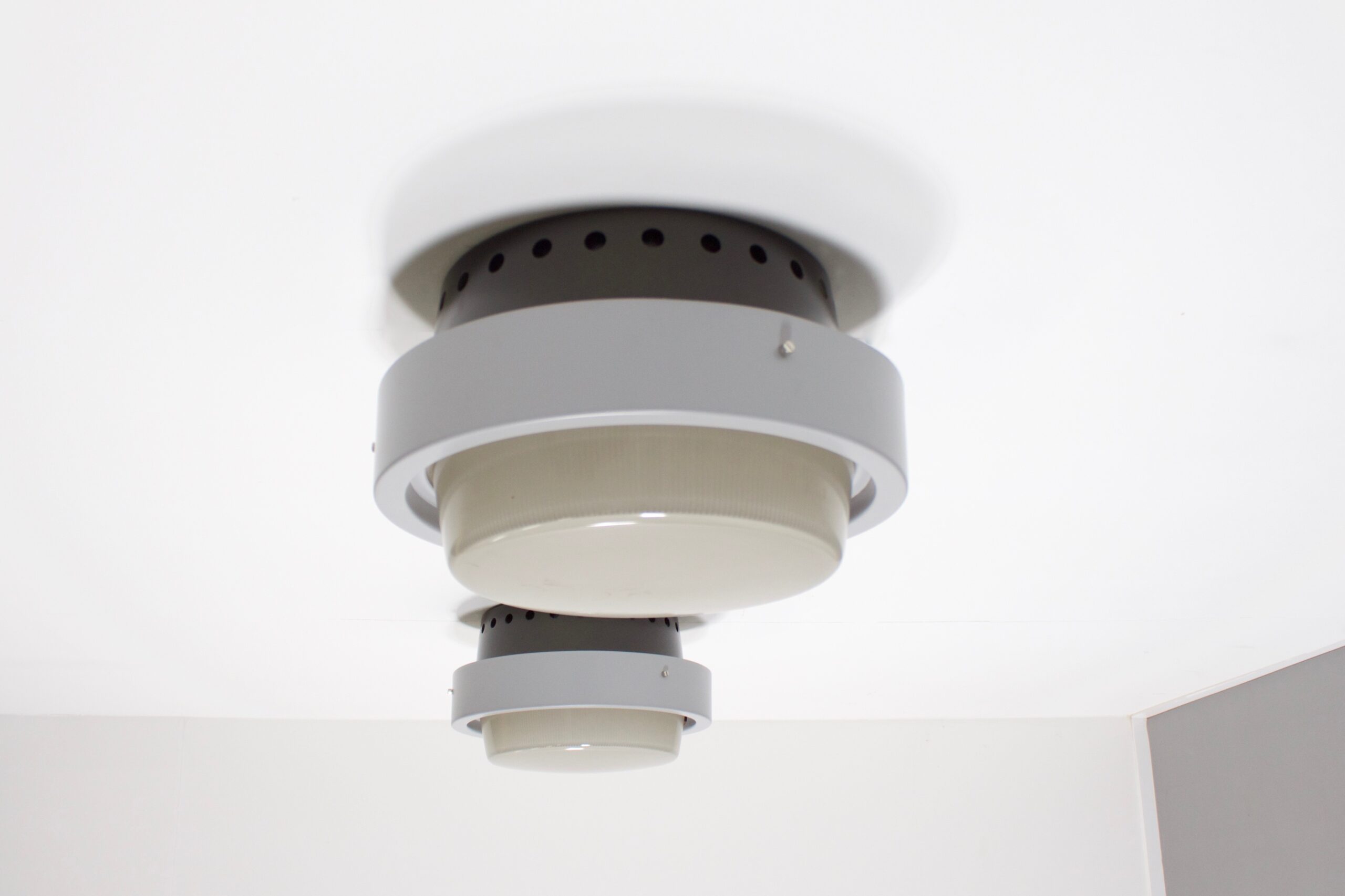 Very rare pair of 3009 flushmounts in excellent condition. Designed by Gino Sarfatti in 1953. Manufactured by Arteluce, Italy. These lamps are made of aluminum and glass. The top part is made of aluminum and is lacquered in a anthracite color on the outside and is lacquered white on the inside to improve reflection the light. The aluminum ring at the bottom is lacquered in a light grey color and is held in place by three grip screws. A glass diffuser rests in the bottom ring, it is made from very thick frosted and shaded glass which was handmade. Each lamp has three metal E27 sockets, rewired for US use. One of the two lamps still has the ‘Arteluce’ sticker on the back. Literature: Gino Sarfatti 1938-1973 selected works.
