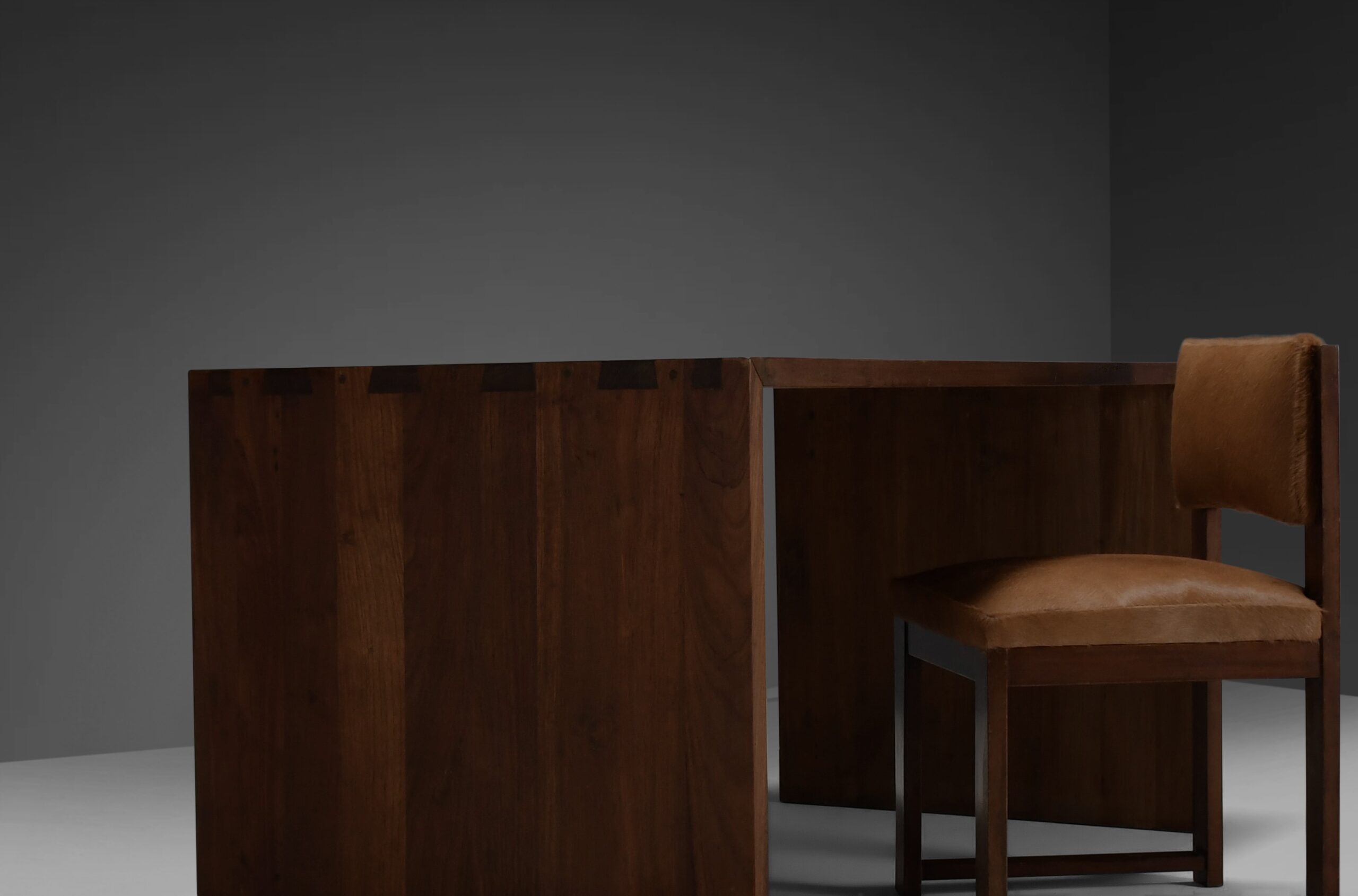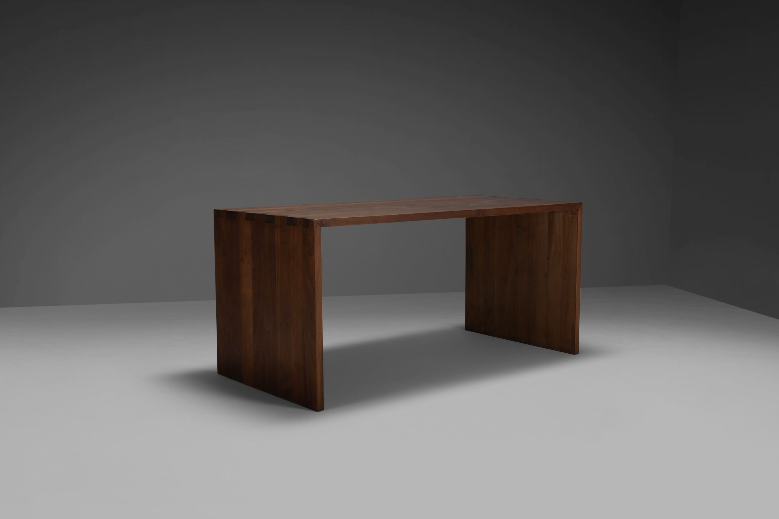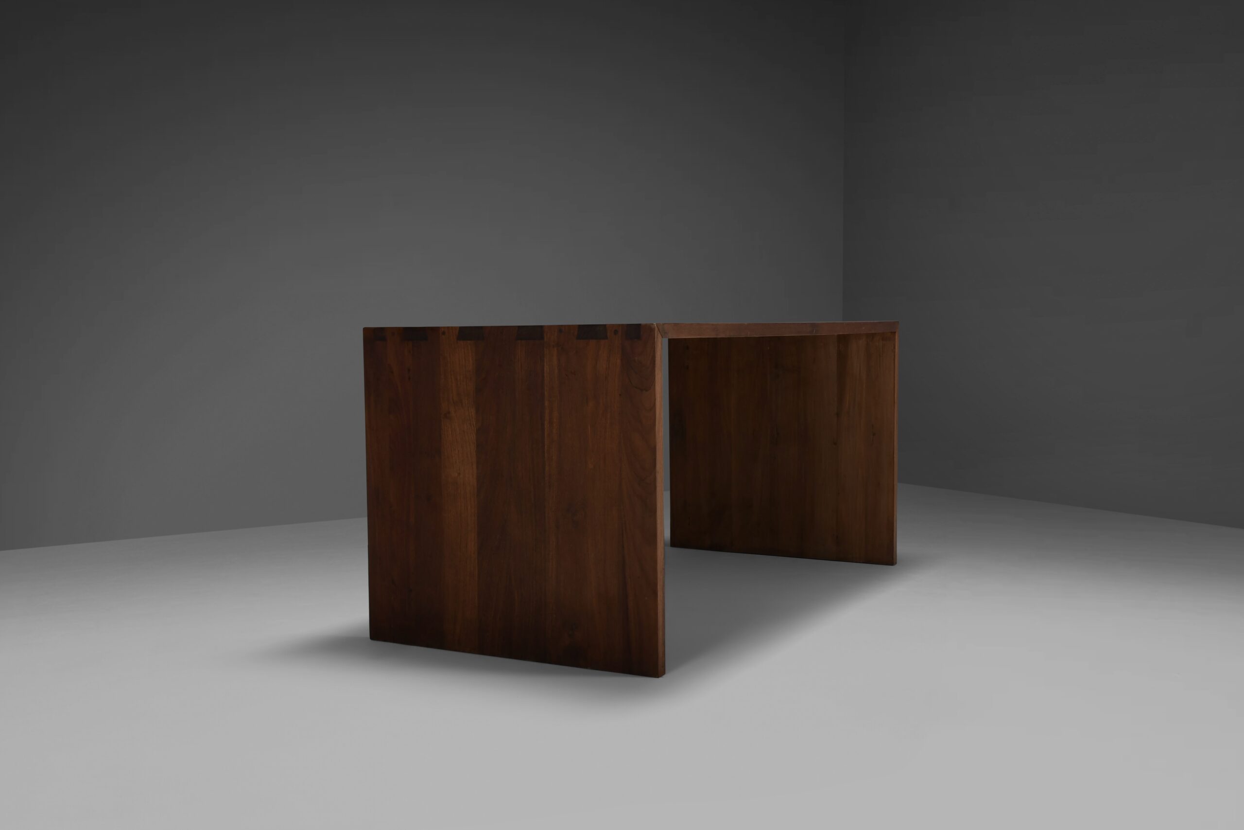 Rustic desk / table in very good original condition. This desk / Table is made from rustic solid teak wood which has a stunning woodgrain and patina. The sides are connected to the top with beautiful joints. Its reduced shape creates a raw simplicity. It is minimalist and pure, avoiding any non-sense and almost has Japanese design character.