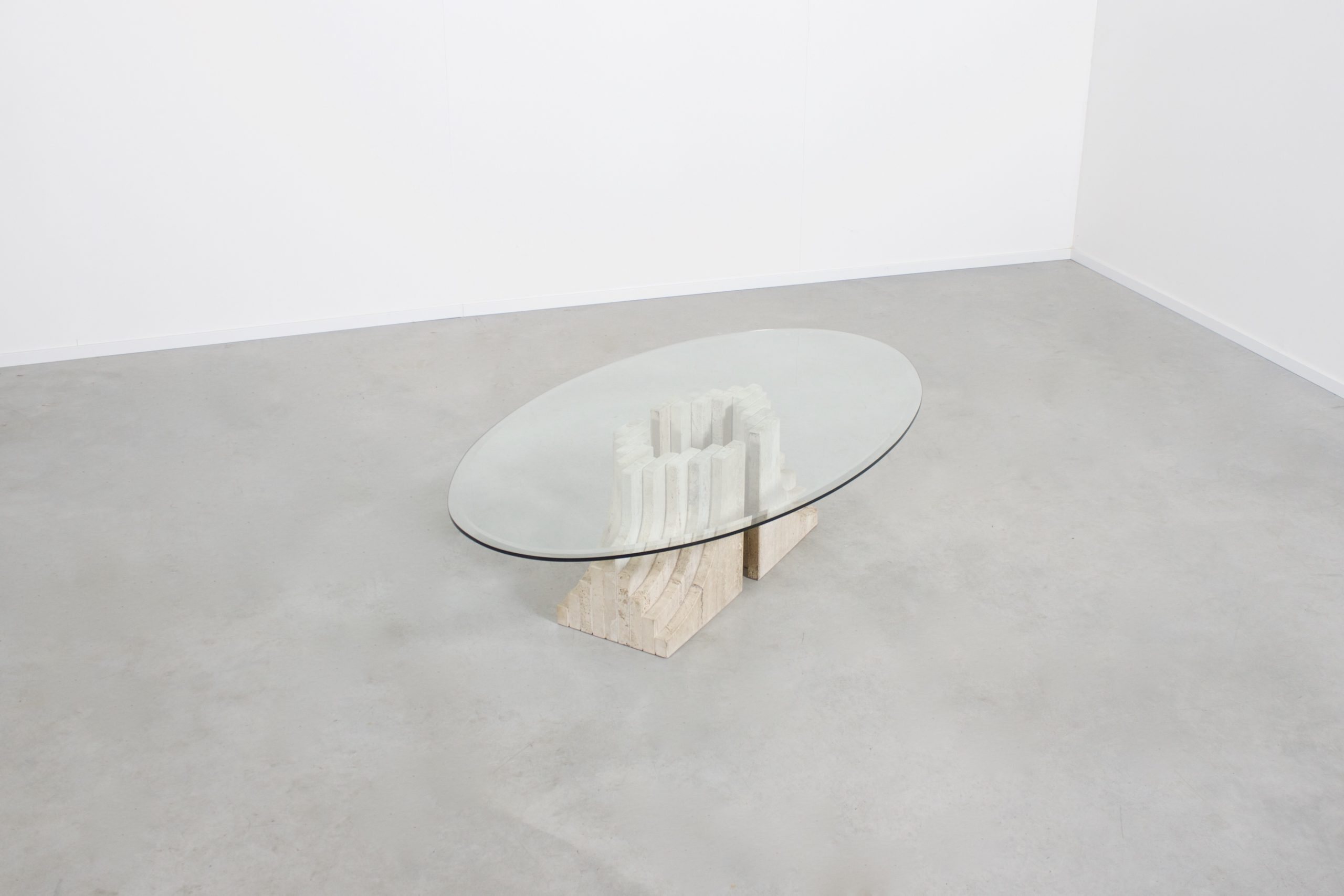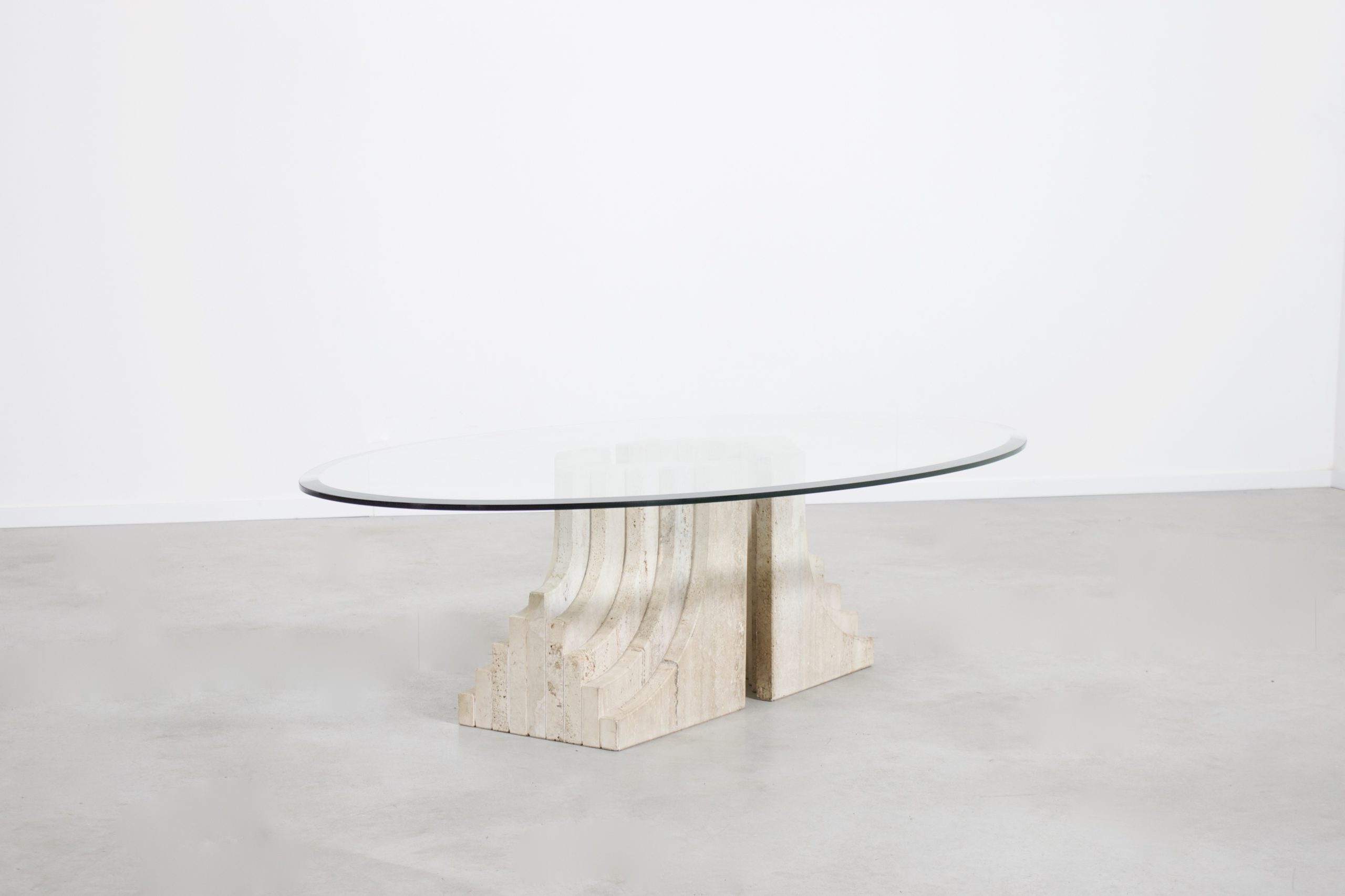 The table consists of two multi-layered travertine bases and an oval glass top.