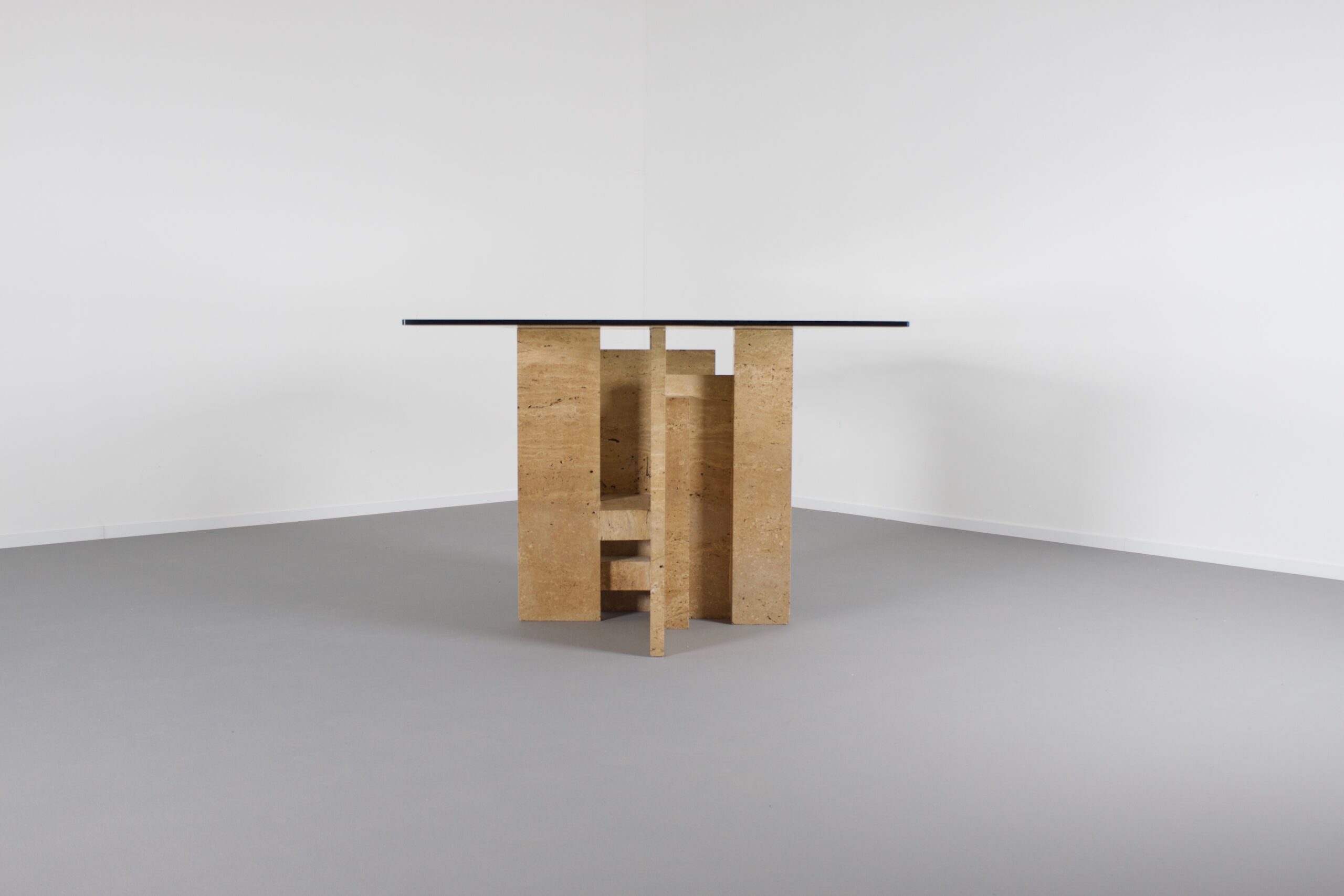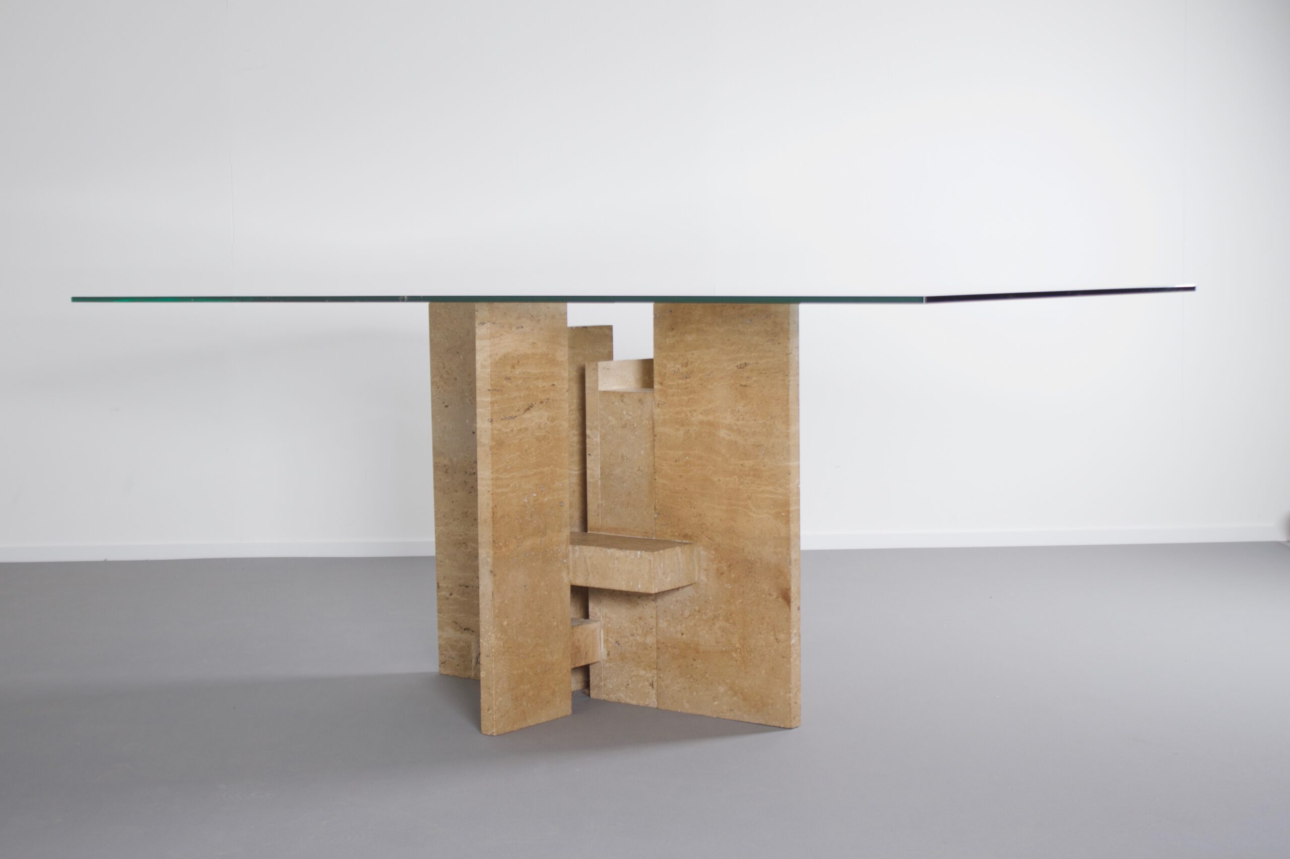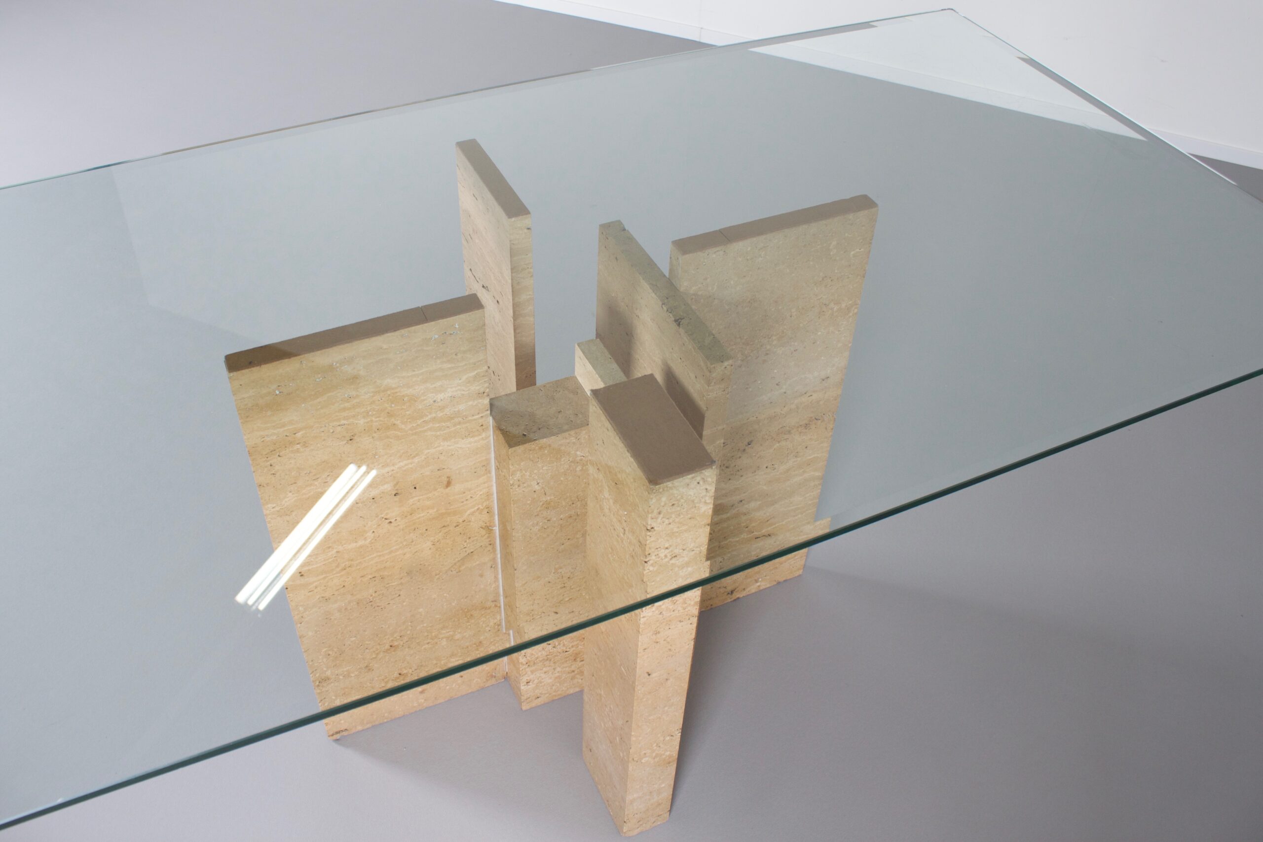 Impressive dining table by Studio Willy Ballez in very good condition. Designed in Belgium in the 1970s this sculptural table is a an example of postmodern design. The handmade abstract base is made from thick solid travertine slabs which are placed horizontally and vertically. The top is made of thick glass and gives a clear view on the impressive base.
