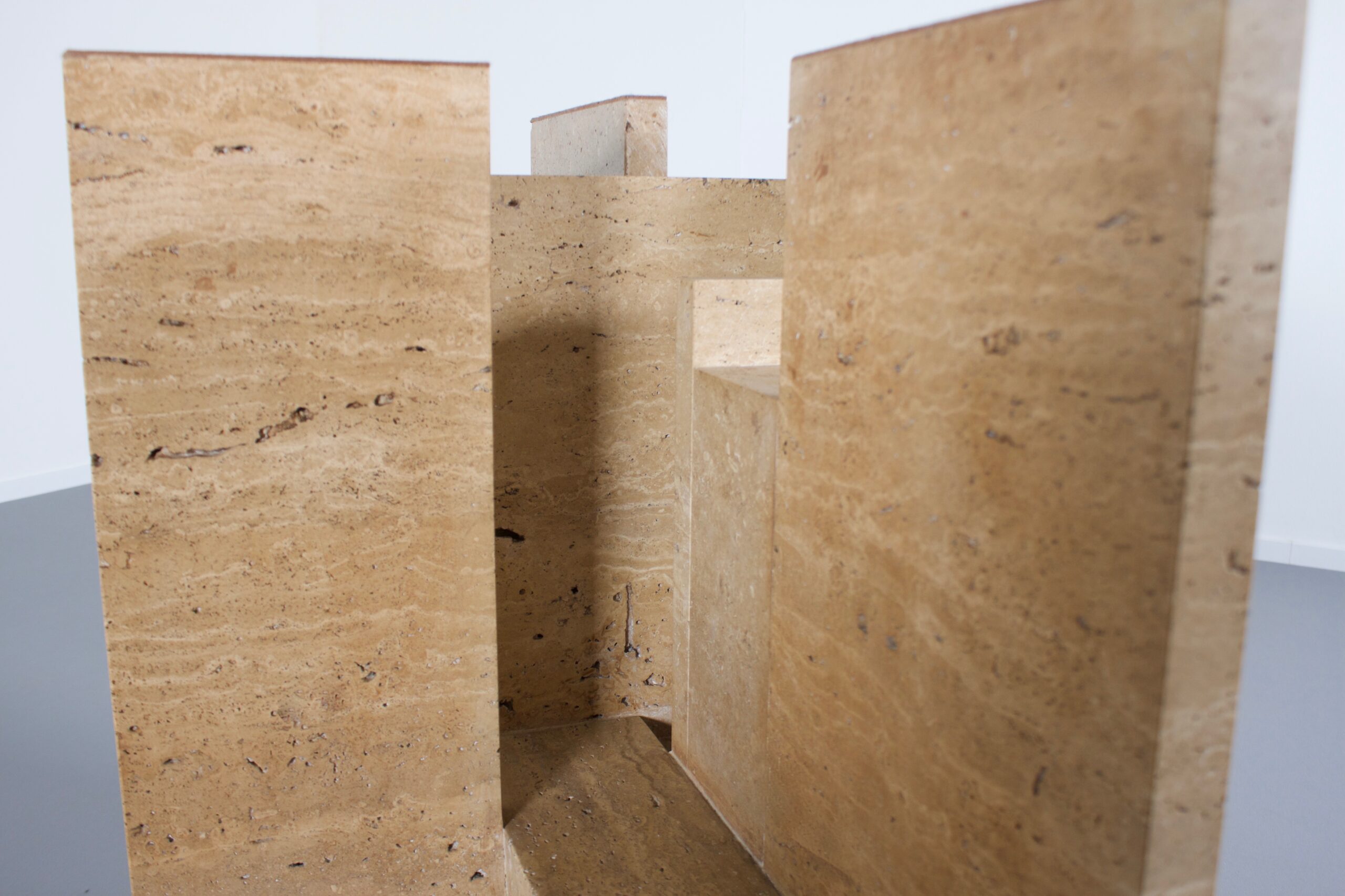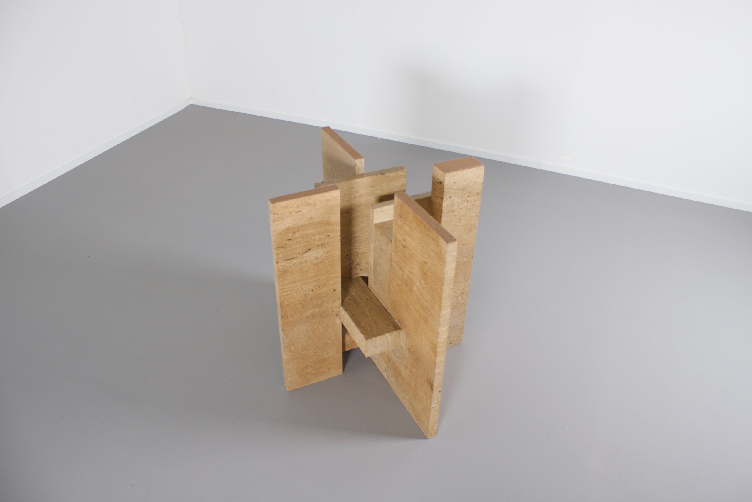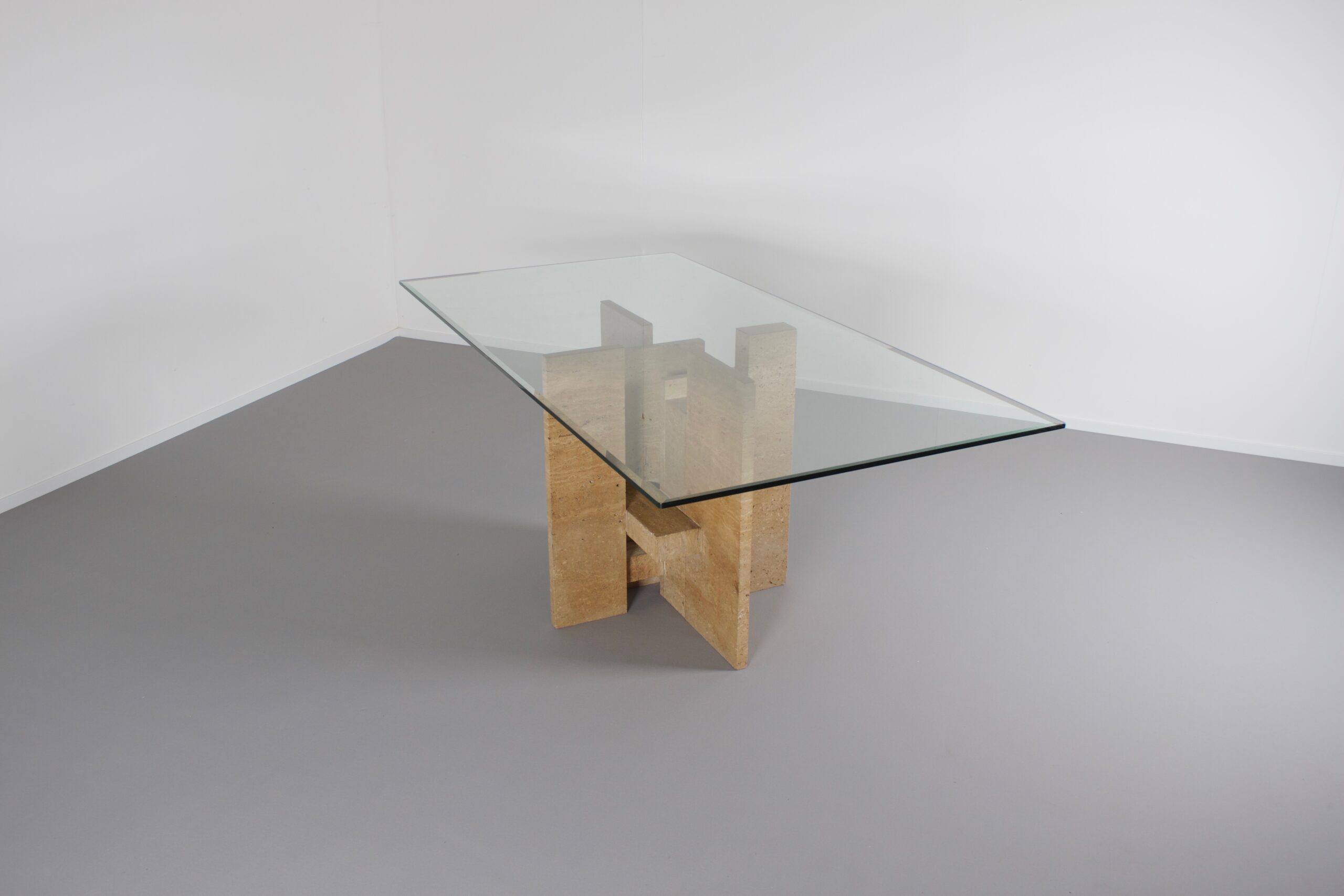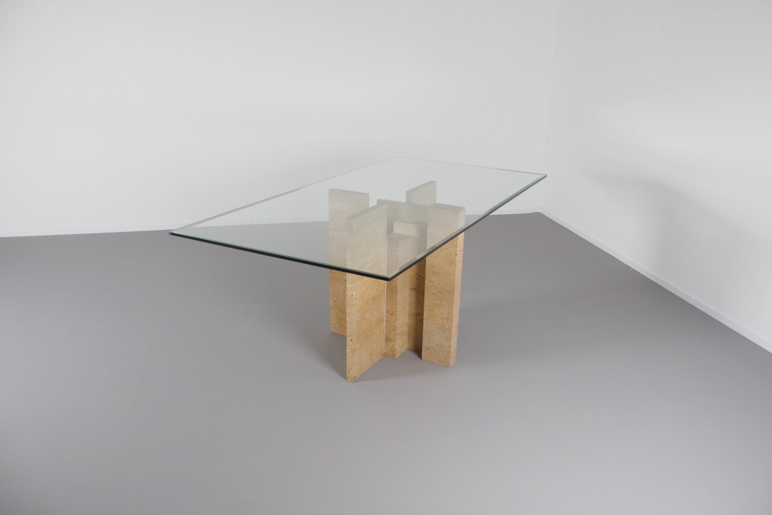 Impressive dining table by Studio Willy Ballez in very good condition. Designed in Belgium in the 1970s this sculptural table is a an example of postmodern design. The handmade abstract base is made from thick solid travertine slabs which are placed horizontally and vertically. The top is made of thick glass and gives a clear view on the impressive base.