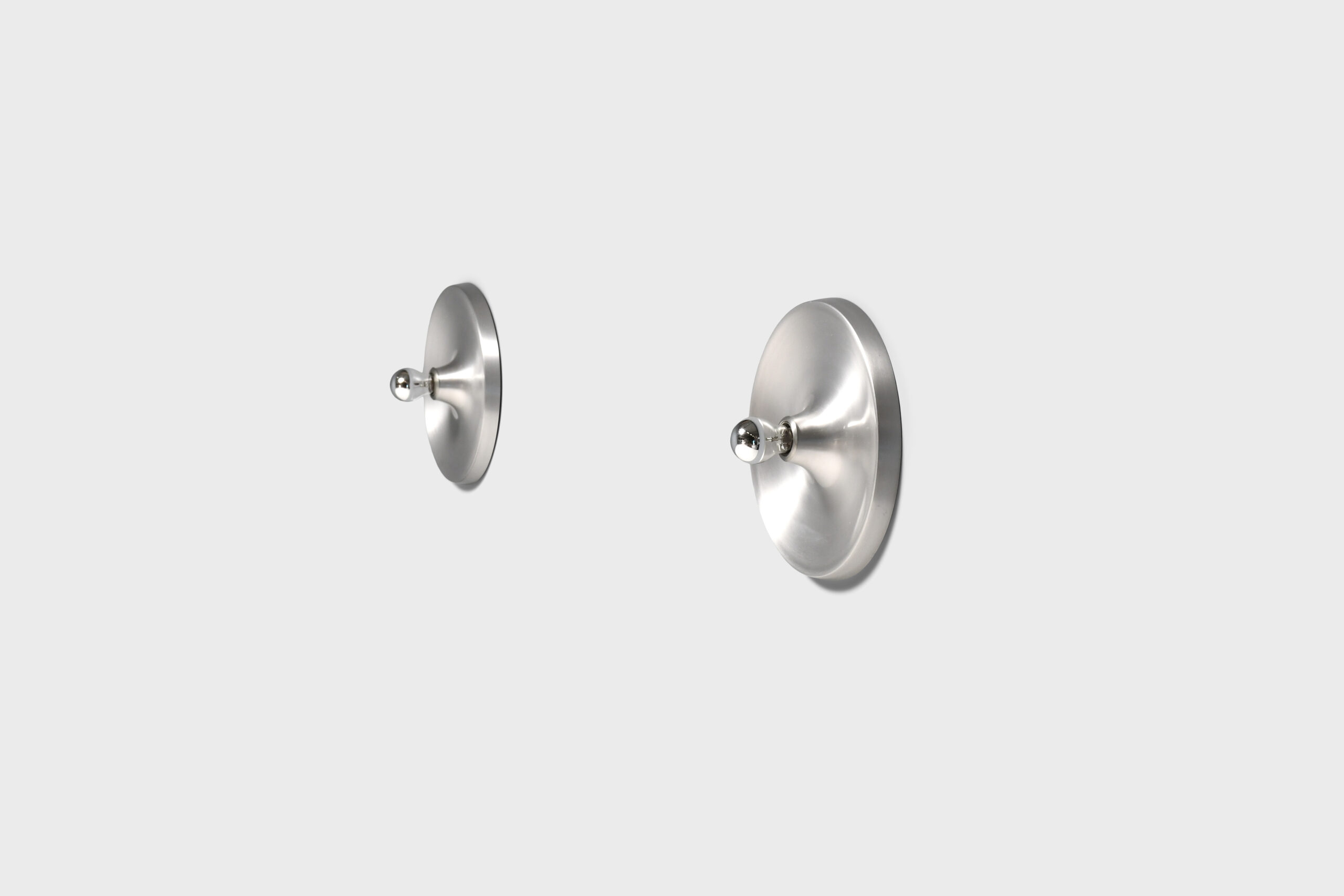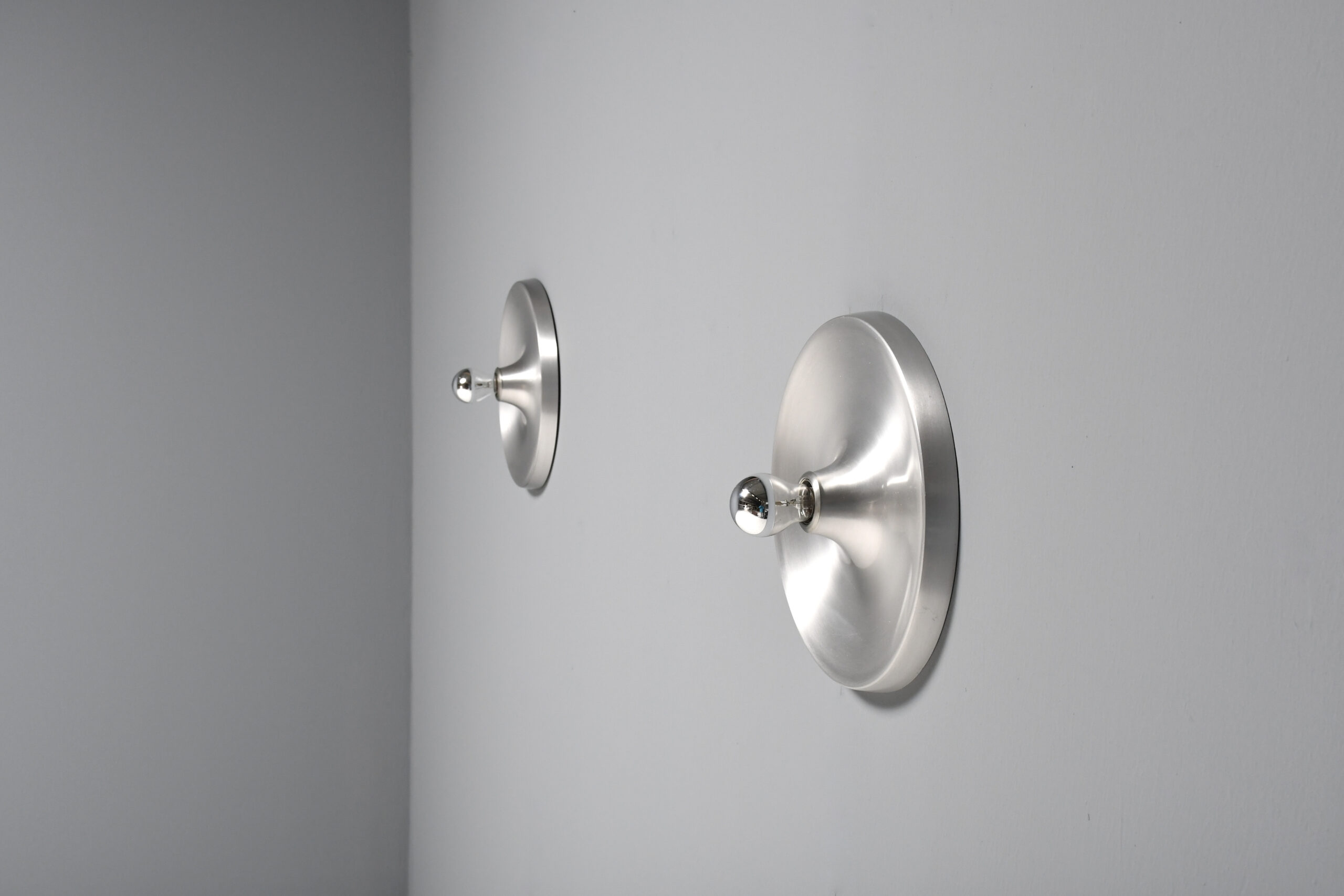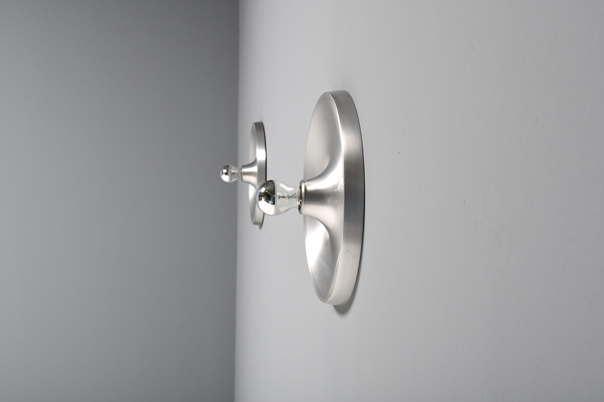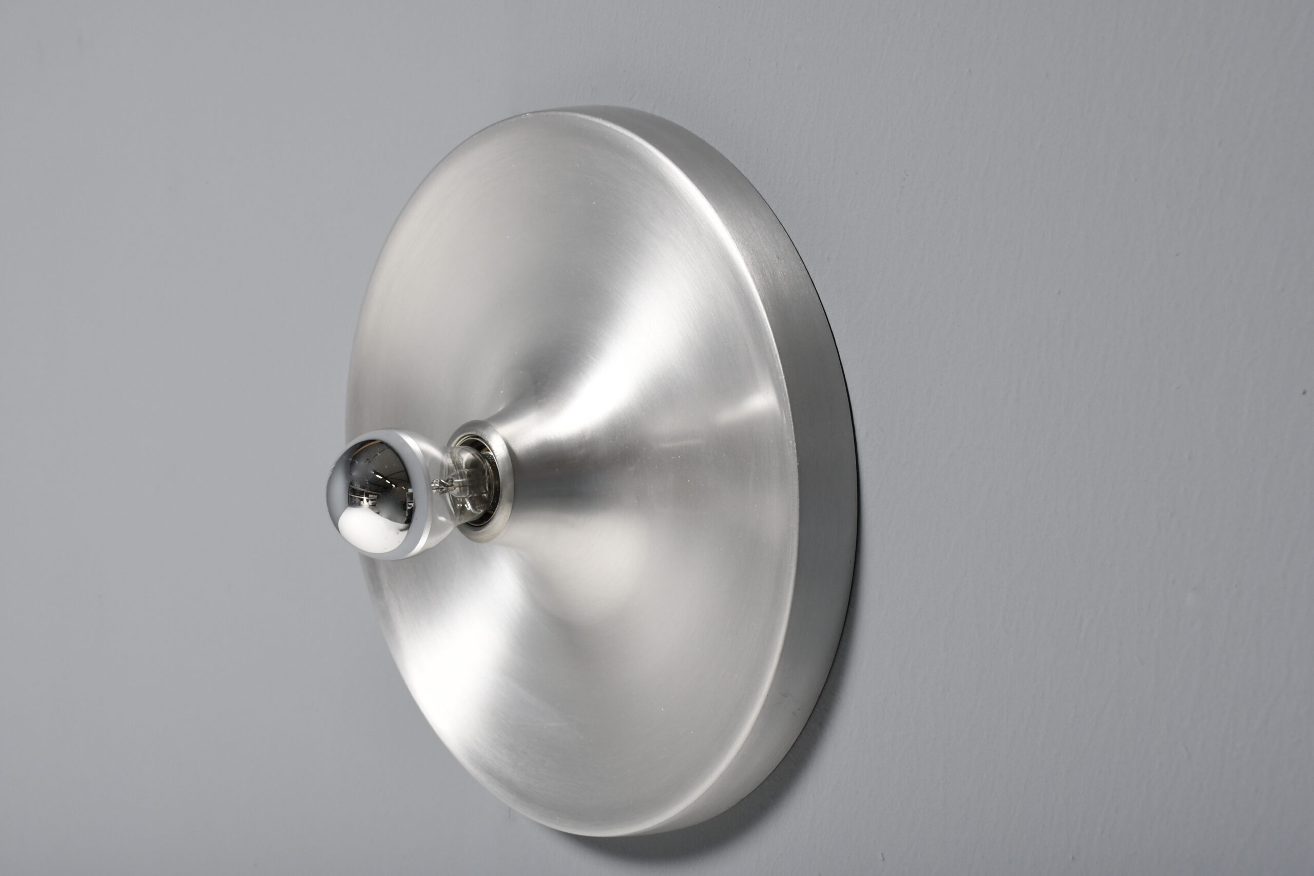 Aluminum sconces in very good condition. These lamps were used by Charlotte Perriand to decorate the apartments of Les Arcs Ski Resort in France. They are made of aluminum and when used with a mirrored lightbulb they generate a larger ‘clair-obscur’ effect. The lamps use one standard size bulb up to 100 watts. Complete with the original wall mount.