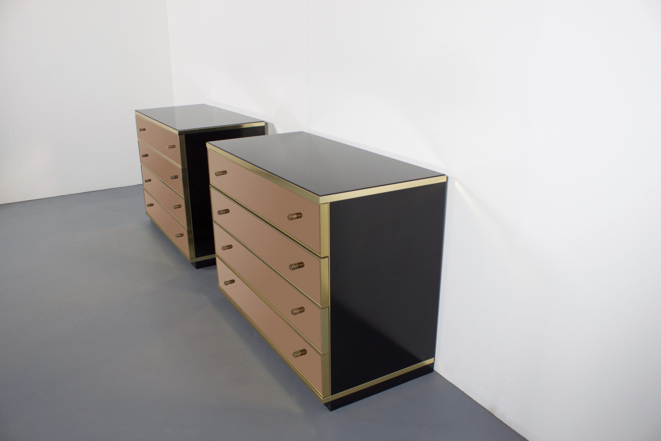 The sideboards have a glossy black glass top and lacquered black side panels with brass details.
