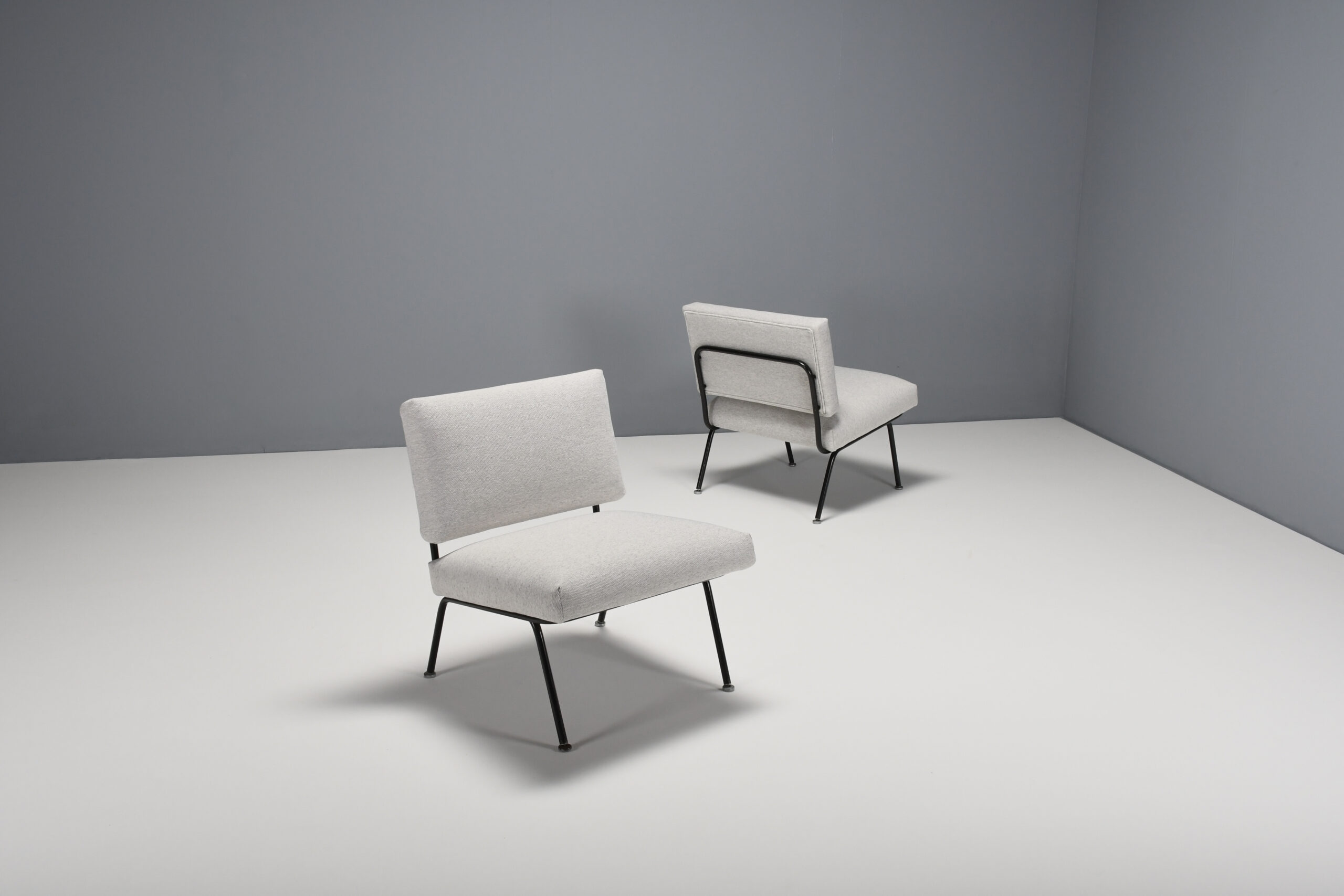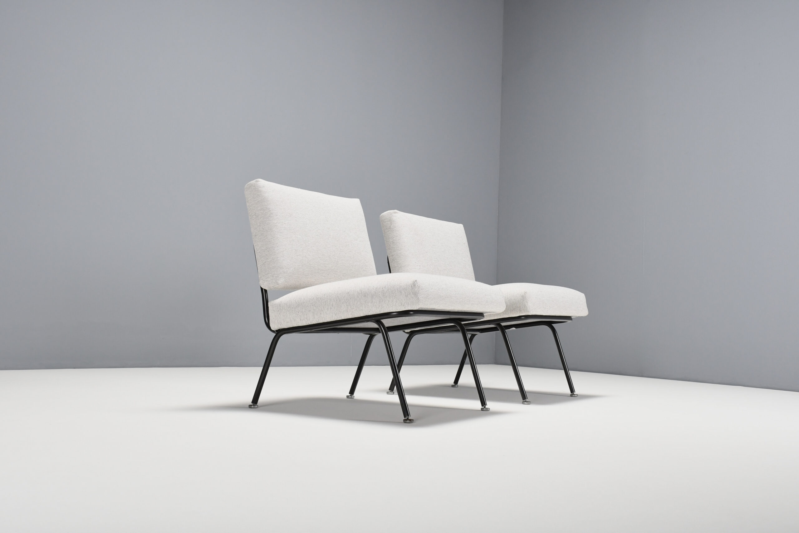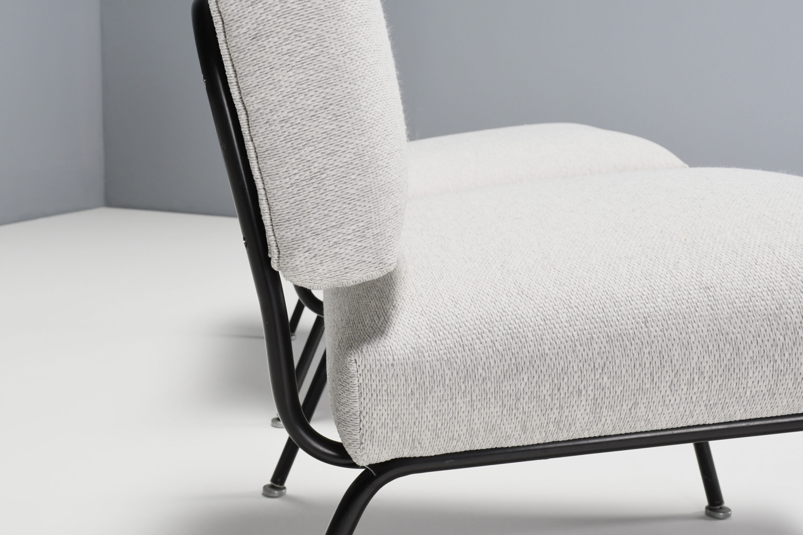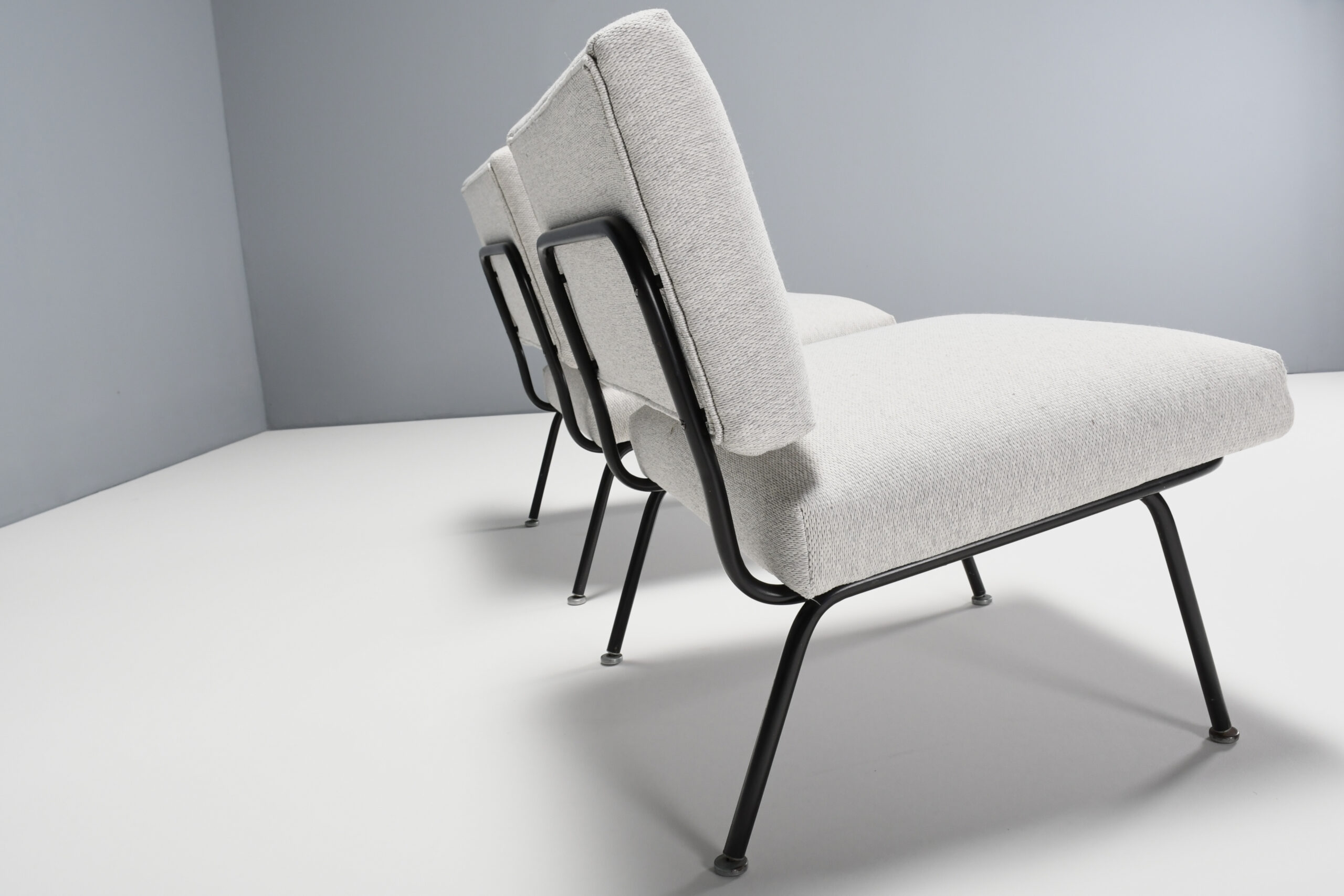 These minimalist lounge chairs have a black lacquered tubular frame with the original aluminum glides.
