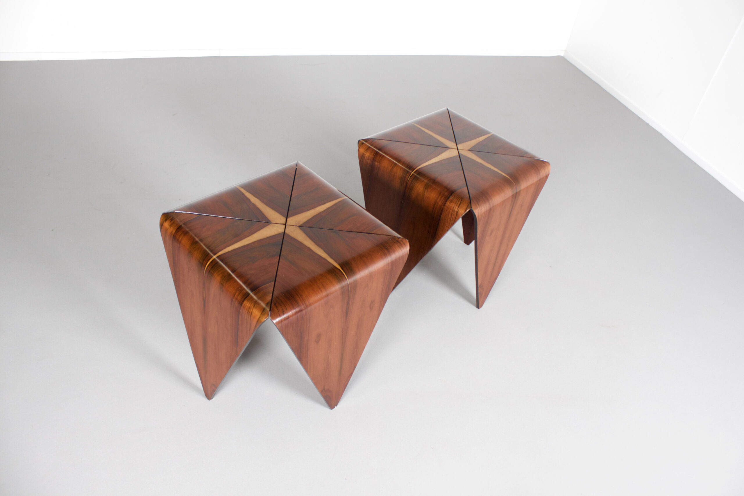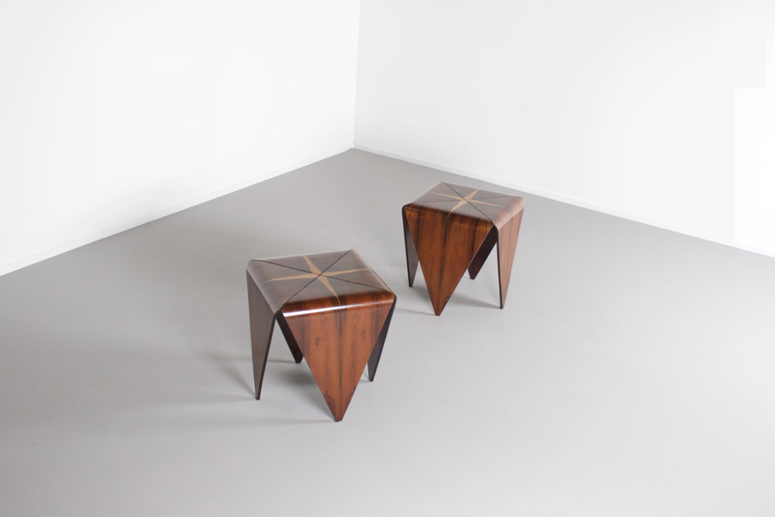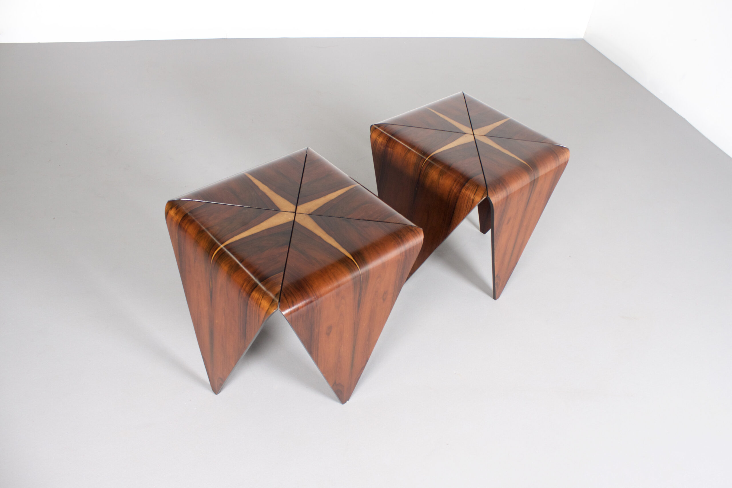 Impressive ‘Petalas’ side tables in very good condition. Designed by Jorge Zalszupin. Manufactured by his own company L’Atelier, Brazil, 1959. The ‘Petalas’ tables are inspired by the folded paper structures used with Origami. The tables are formed by four separate petals of Brazilian Jacaranda Rosewood and they are held together by a black wooden square structure. The Jacaranda wood has a warm colour and a beautiful grain. On the top of the tables the lighter cross shaped flames really stand out and make these tables unique. On the bottom both tables are marked (See Image) Jorge Zalszupin (1922-) coffee table model “Petalas” Manufactured by L’Atelier Brazil, 1960s Jacaranda, iron structure Measurements 140 cm diameter x 32 cm height 55.11 in diameter x 12.59 in height Literature Maria Cecilia Loschiavo dos Santos, Jorge Zalszupin, Design Moderno no Brasil, Éditions Olhares, São Paulo 2014 Provenance Private collection, Sao Paulo Biography Jorge Zalszupin a native of Warsaw, Poland, studied architecture at Bucharest’s Ecole des Beaux Arts. While working as an architect in Paris, he found inspiration in articles about Brazilians Oscar Niemeyer and Roberto Burle Marx and immigrated to Brazil in 1949. There, he founded L’Atelier in 1959, which would become one of the most important furniture companies in Brazil. Pioneering use of plywood and chromed metal became the signature of L’Atelier furniture and enabled him to create sensual and elegant pieces that stand as timeless signatures of the Brazilian modernist movement. The company also had an important role in the introduction on the Brazilian market of injection-molded plastic objects.