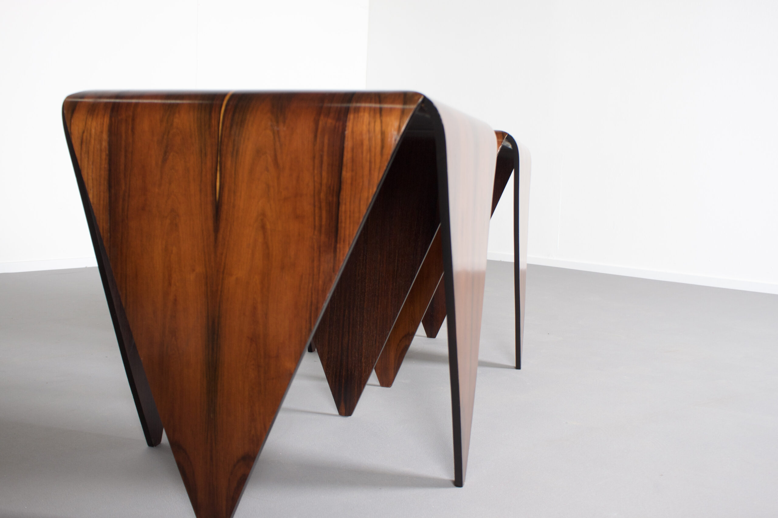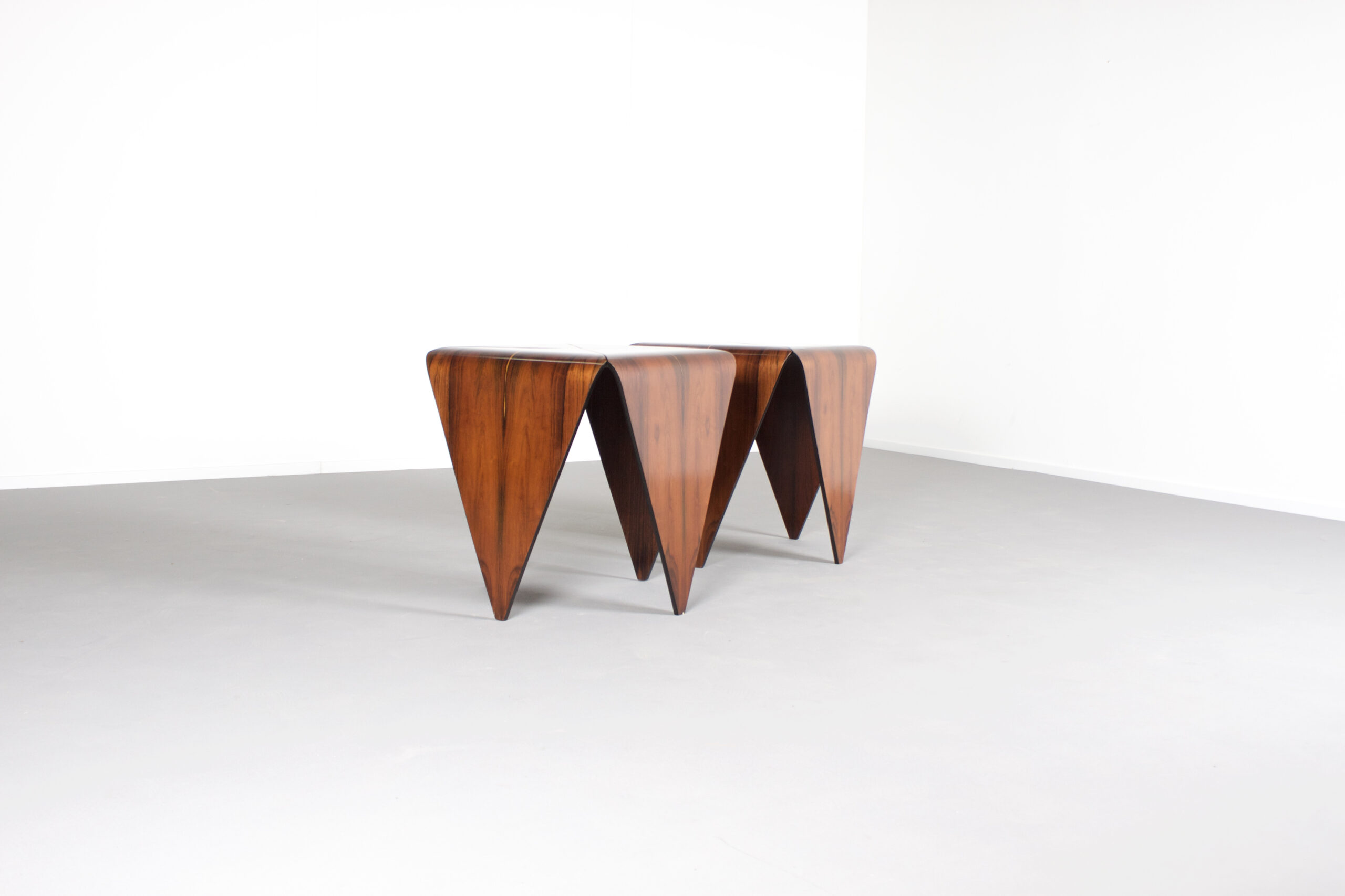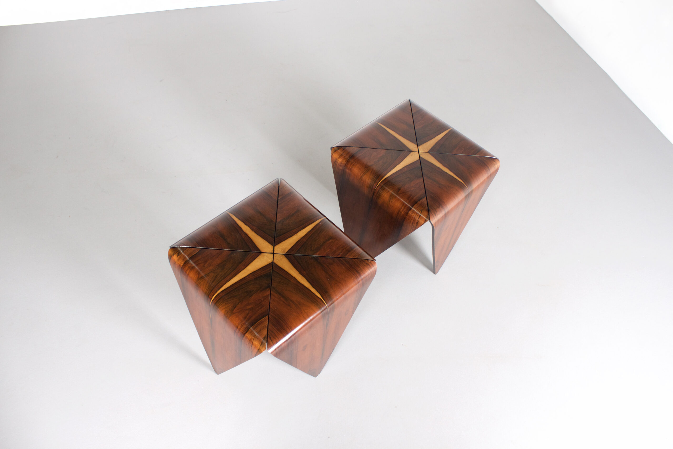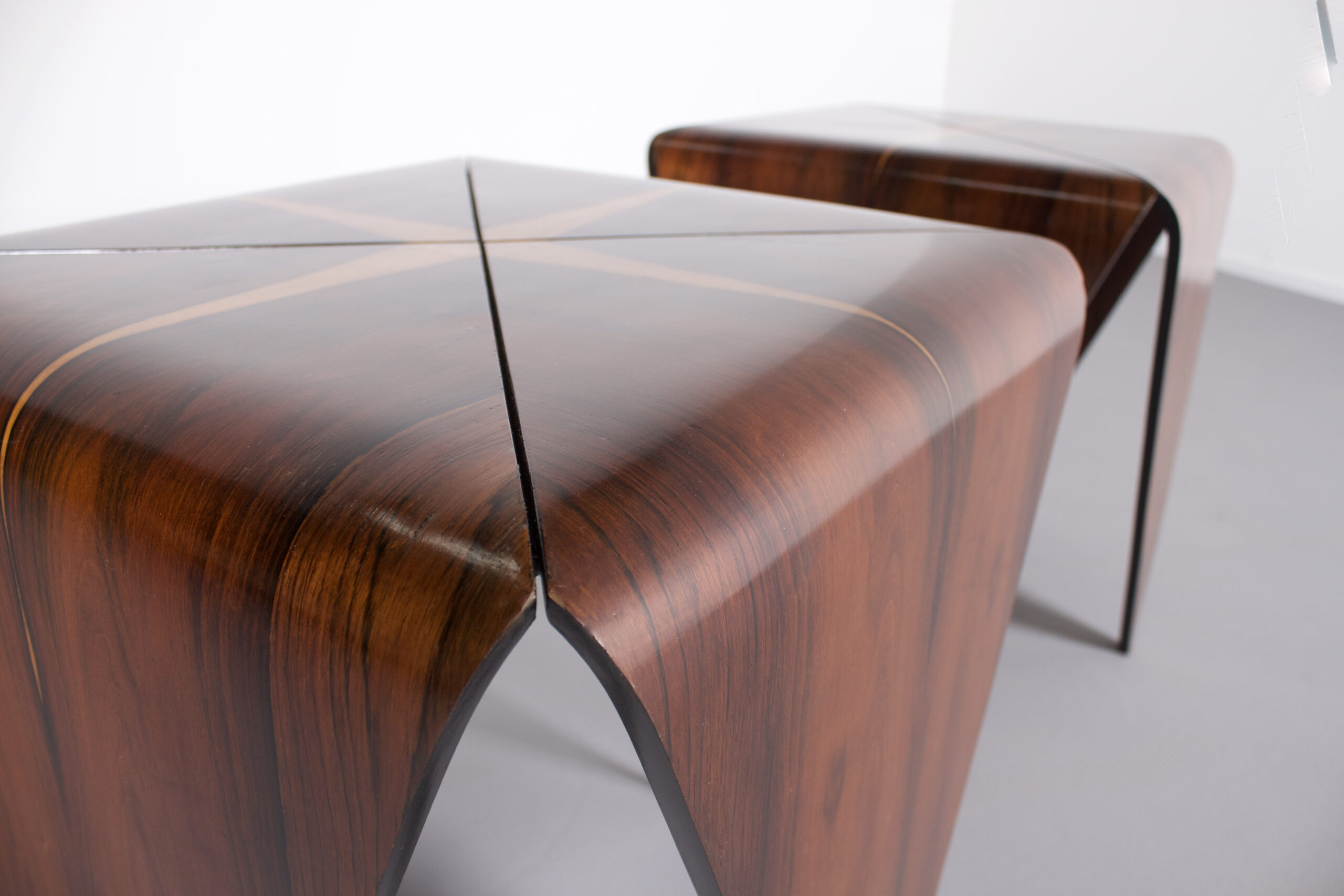 Impressive ‘Petalas’ side tables in very good condition. Designed by Jorge Zalszupin. Manufactured by his own company L’Atelier, Brazil, 1959. The ‘Petalas’ tables are inspired by the folded paper structures used with Origami. The tables are formed by four separate petals of Brazilian Jacaranda Rosewood and they are held together by a black wooden square structure. The Jacaranda wood has a warm colour and a beautiful grain. On the top of the tables the lighter cross shaped flames really stand out and make these tables unique. On the bottom both tables are marked (See Image) Jorge Zalszupin (1922-) coffee table model “Petalas” Manufactured by L’Atelier Brazil, 1960s Jacaranda, iron structure Measurements 140 cm diameter x 32 cm height 55.11 in diameter x 12.59 in height Literature Maria Cecilia Loschiavo dos Santos, Jorge Zalszupin, Design Moderno no Brasil, Éditions Olhares, São Paulo 2014 Provenance Private collection, Sao Paulo Biography Jorge Zalszupin a native of Warsaw, Poland, studied architecture at Bucharest’s Ecole des Beaux Arts. While working as an architect in Paris, he found inspiration in articles about Brazilians Oscar Niemeyer and Roberto Burle Marx and immigrated to Brazil in 1949. There, he founded L’Atelier in 1959, which would become one of the most important furniture companies in Brazil. Pioneering use of plywood and chromed metal became the signature of L’Atelier furniture and enabled him to create sensual and elegant pieces that stand as timeless signatures of the Brazilian modernist movement. The company also had an important role in the introduction on the Brazilian market of injection-molded plastic objects.
