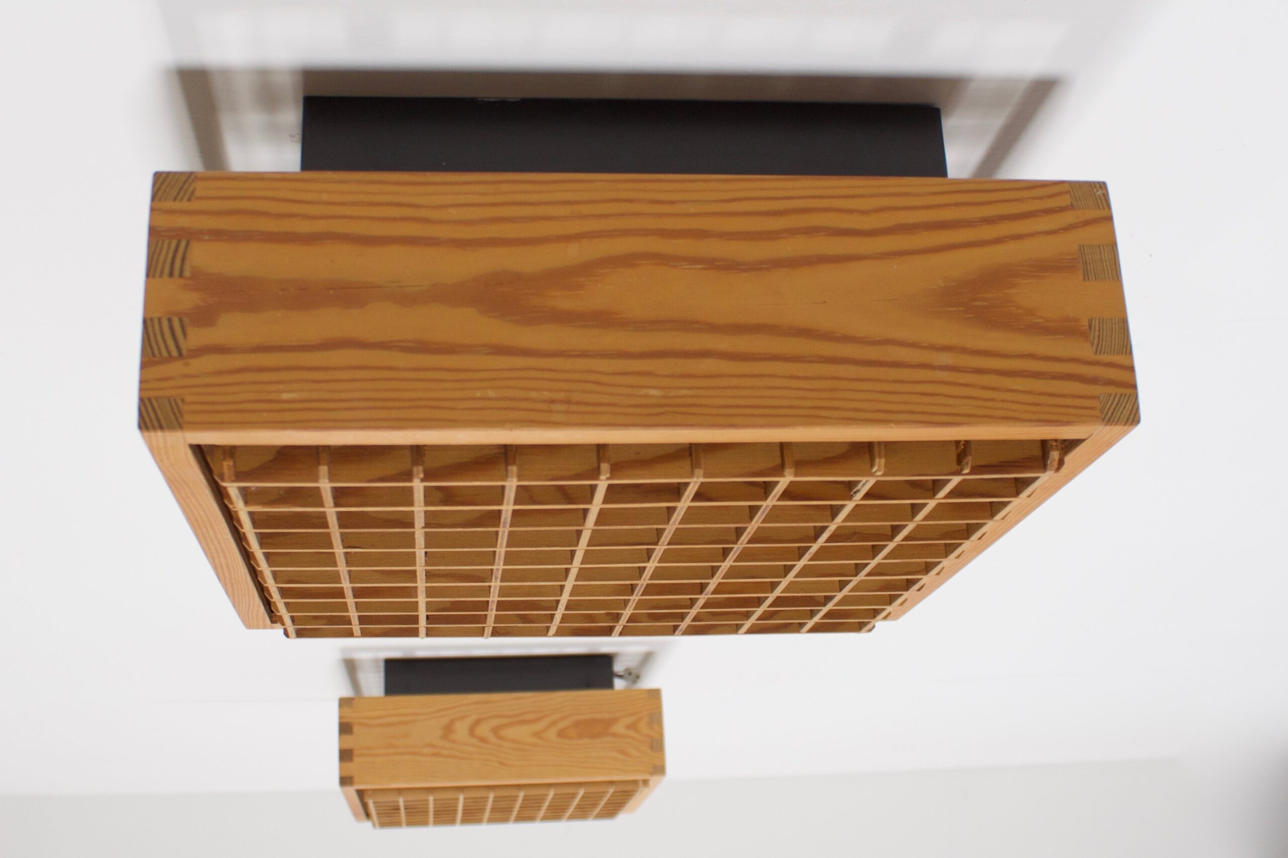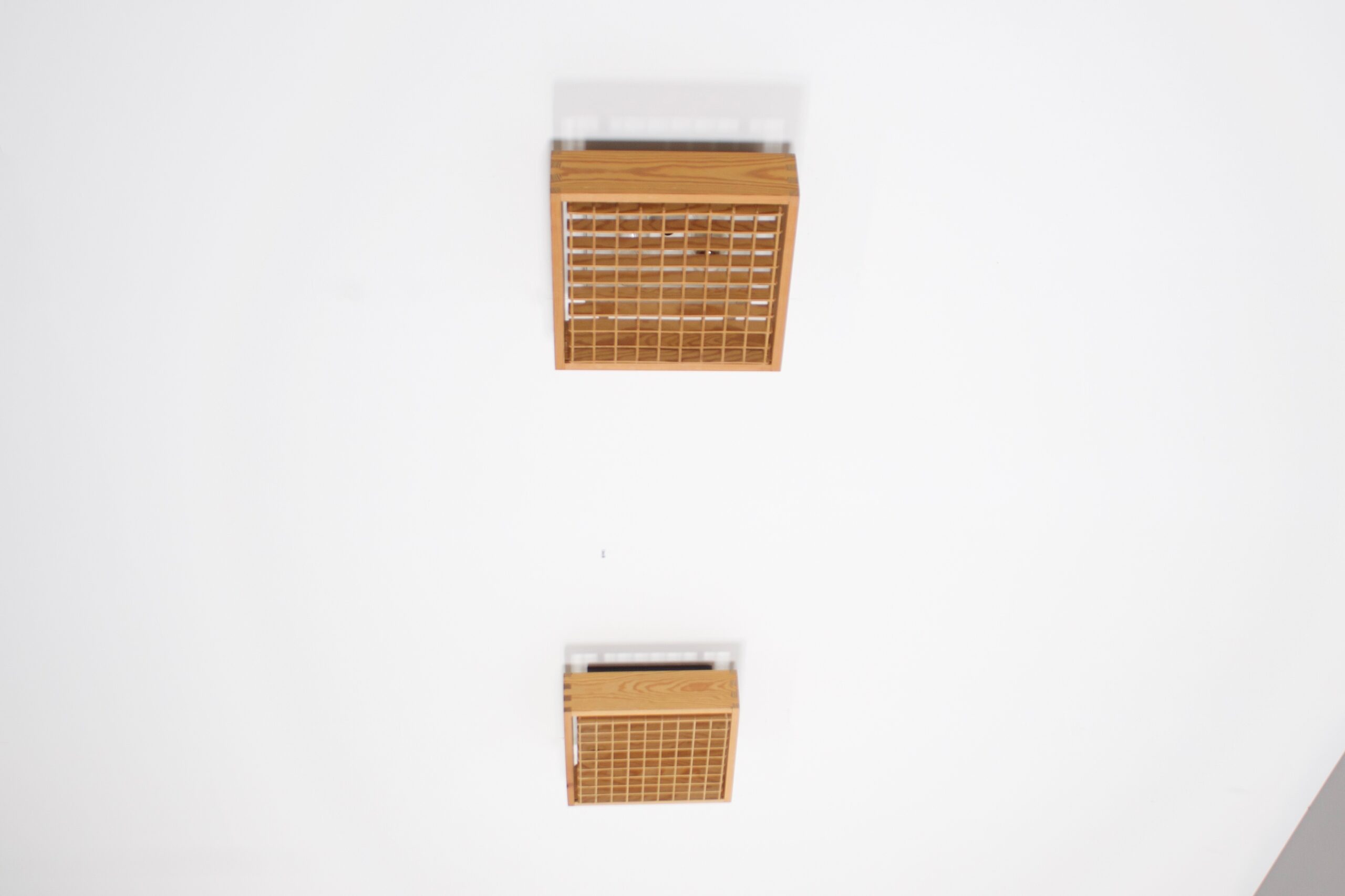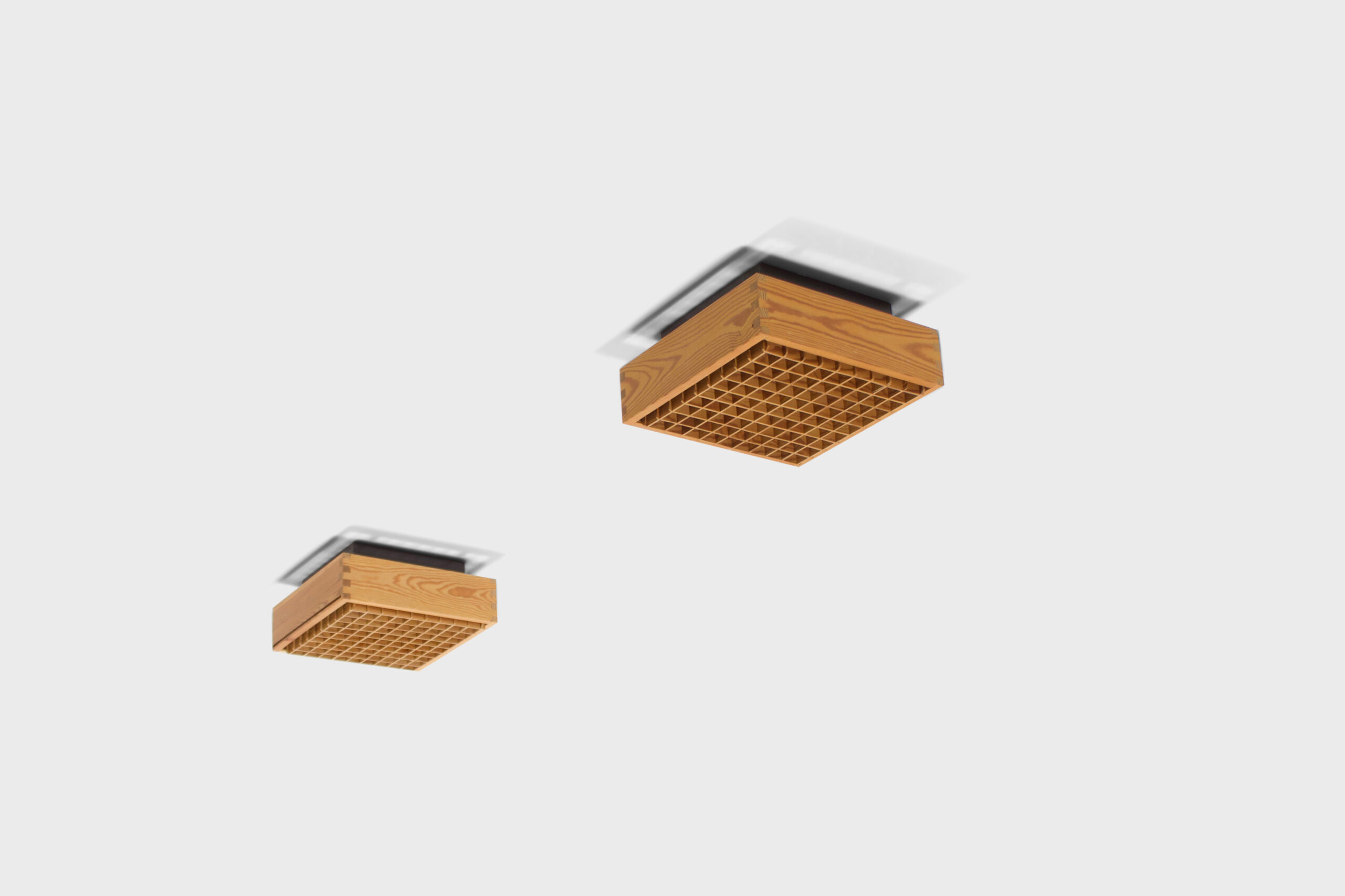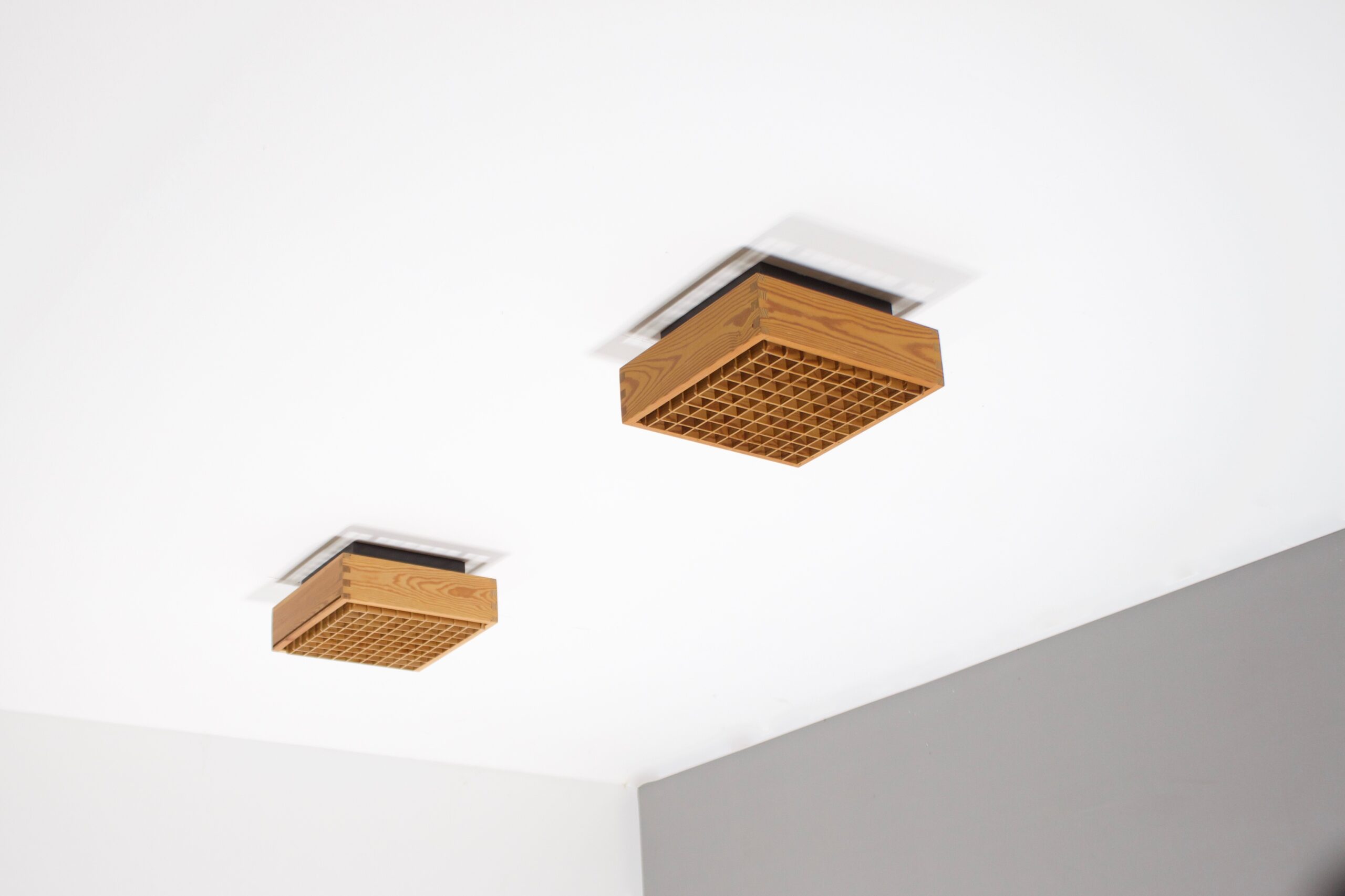 Set of square Danish Ceiling Lights in excellent condition. The lamps are attached to the ceiling with a steel base which holds two sockets. The pice body of the lamps is made of solid pine wood which is connected by beautiful visible joints on each corner. The diffuser has a wooden grid containing 65 squares. In the manner of Ate van Apeldoorn and Charlotte Perriand. Can also be used as sconces.