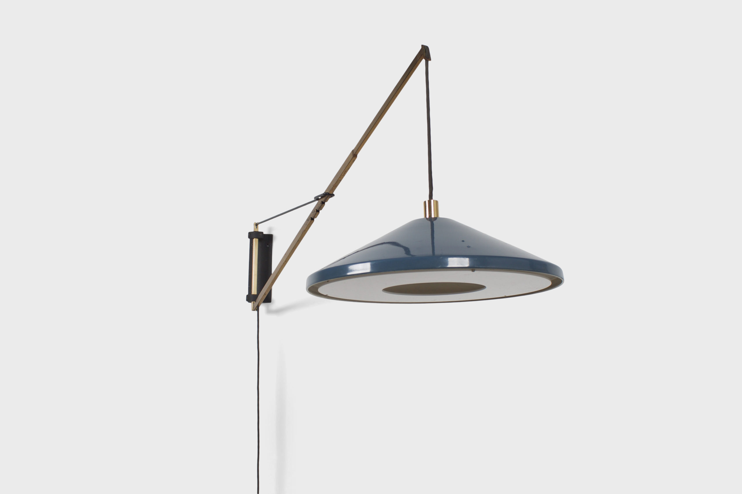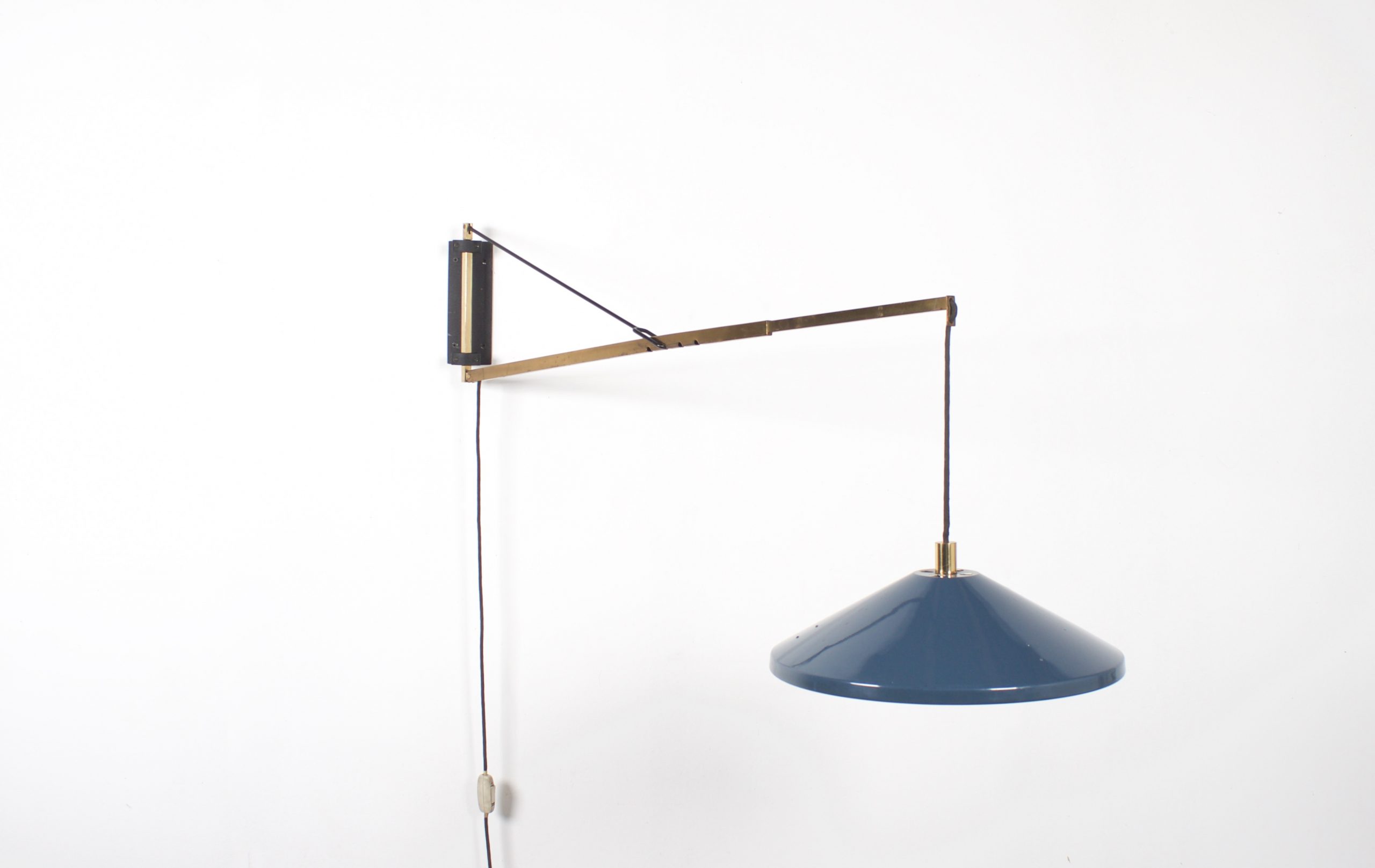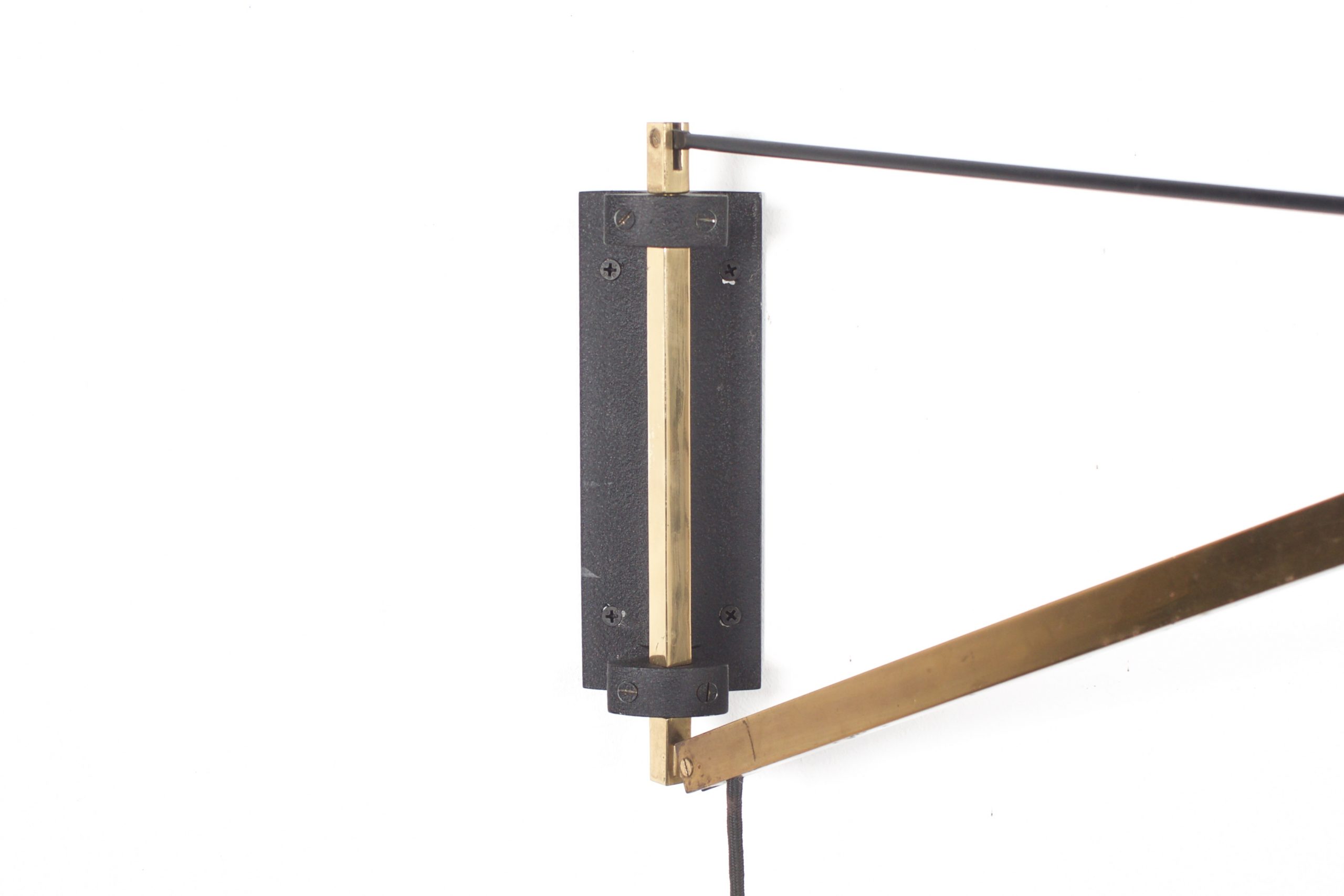 The brass arm is connected to a cast iron wall mount and can swing from left to right.