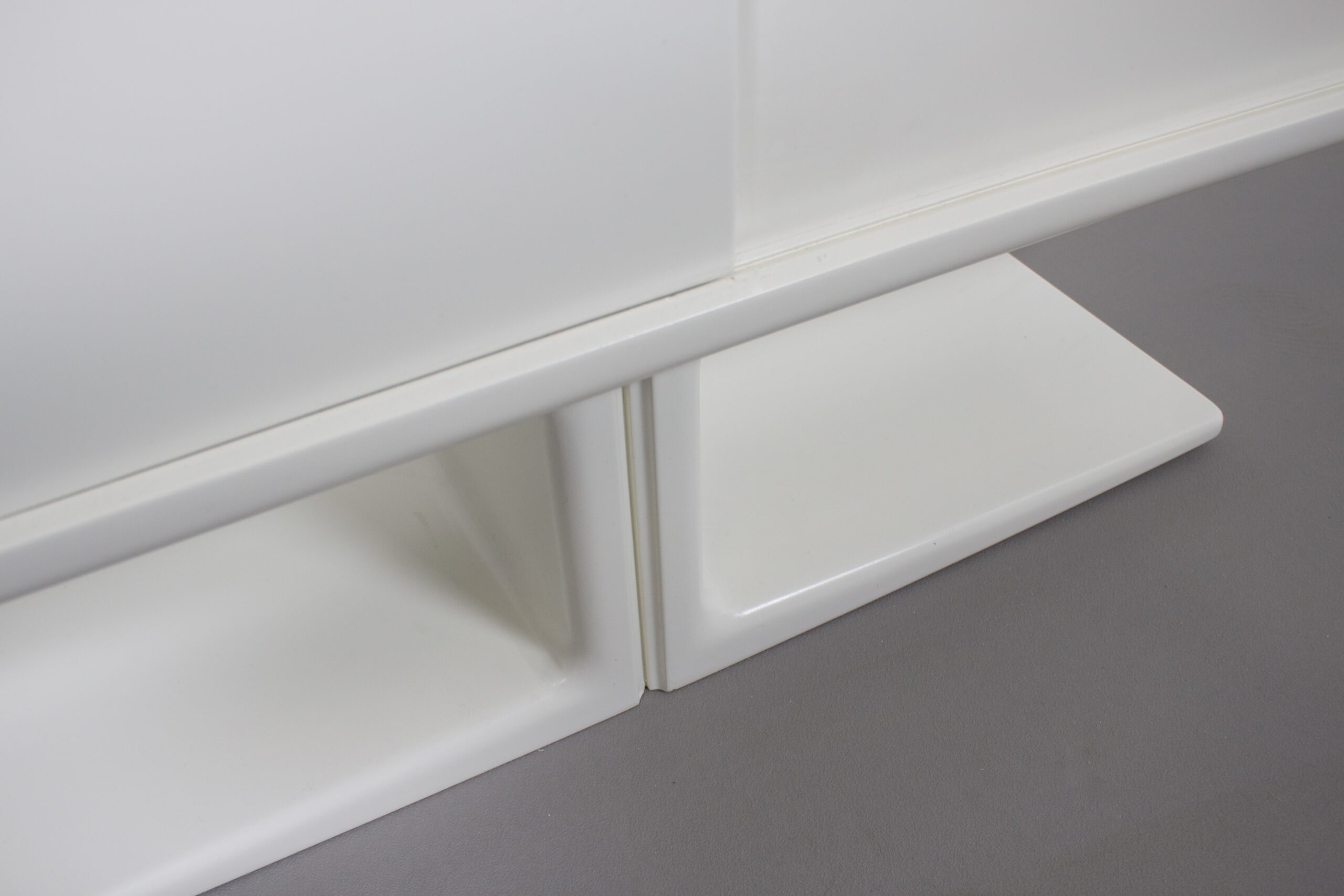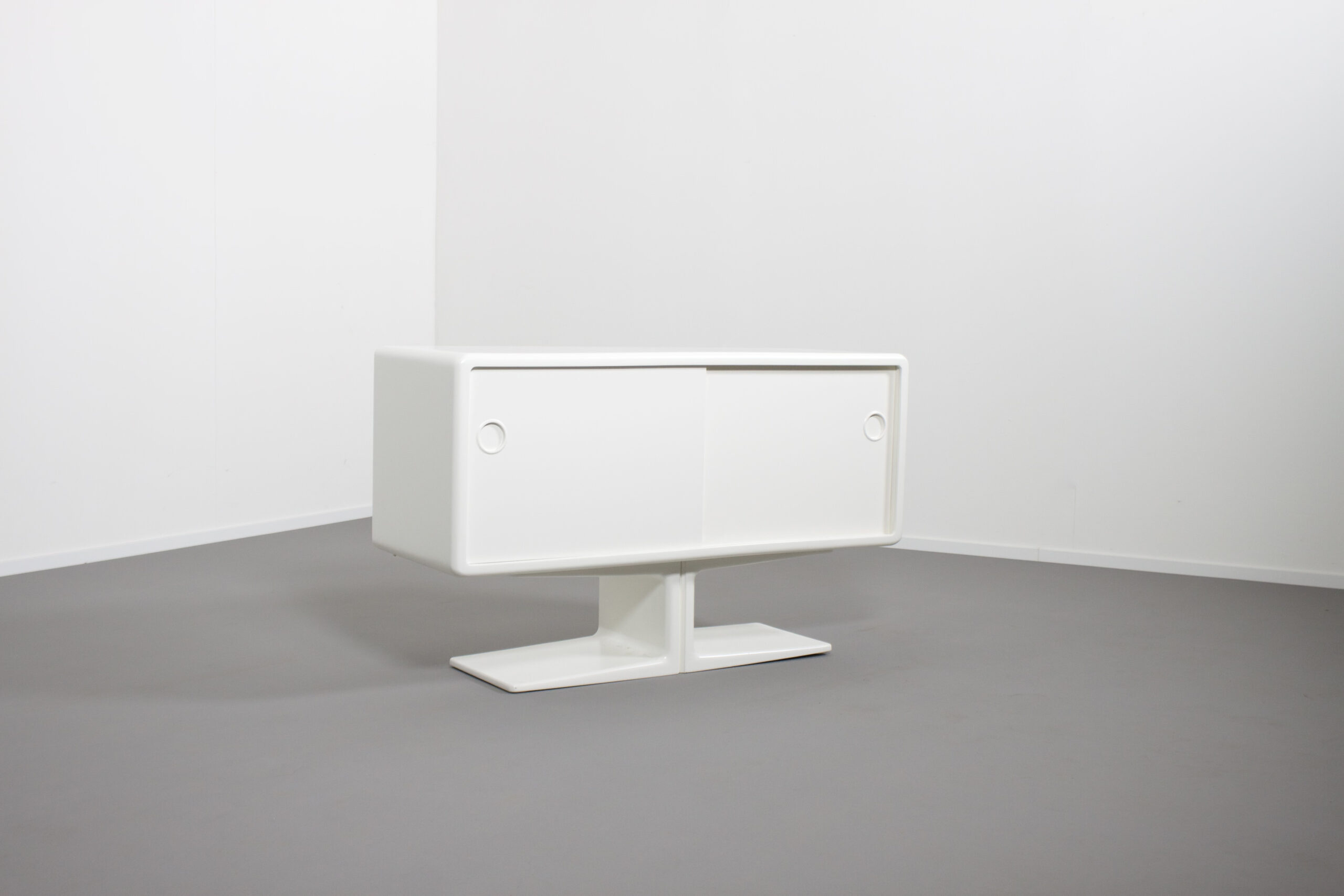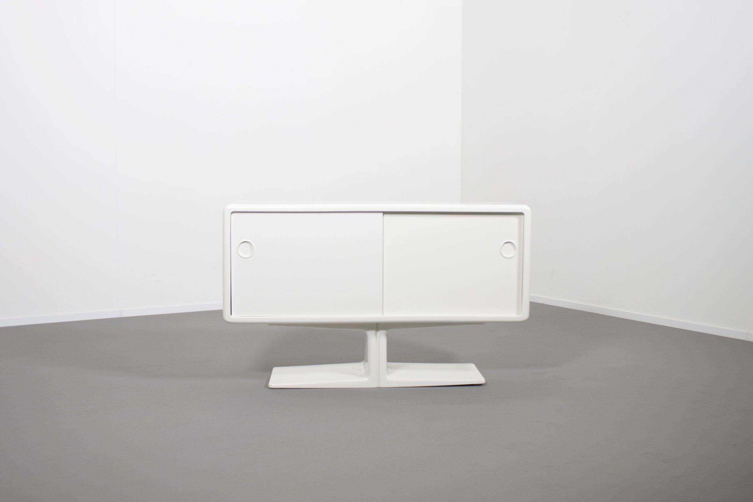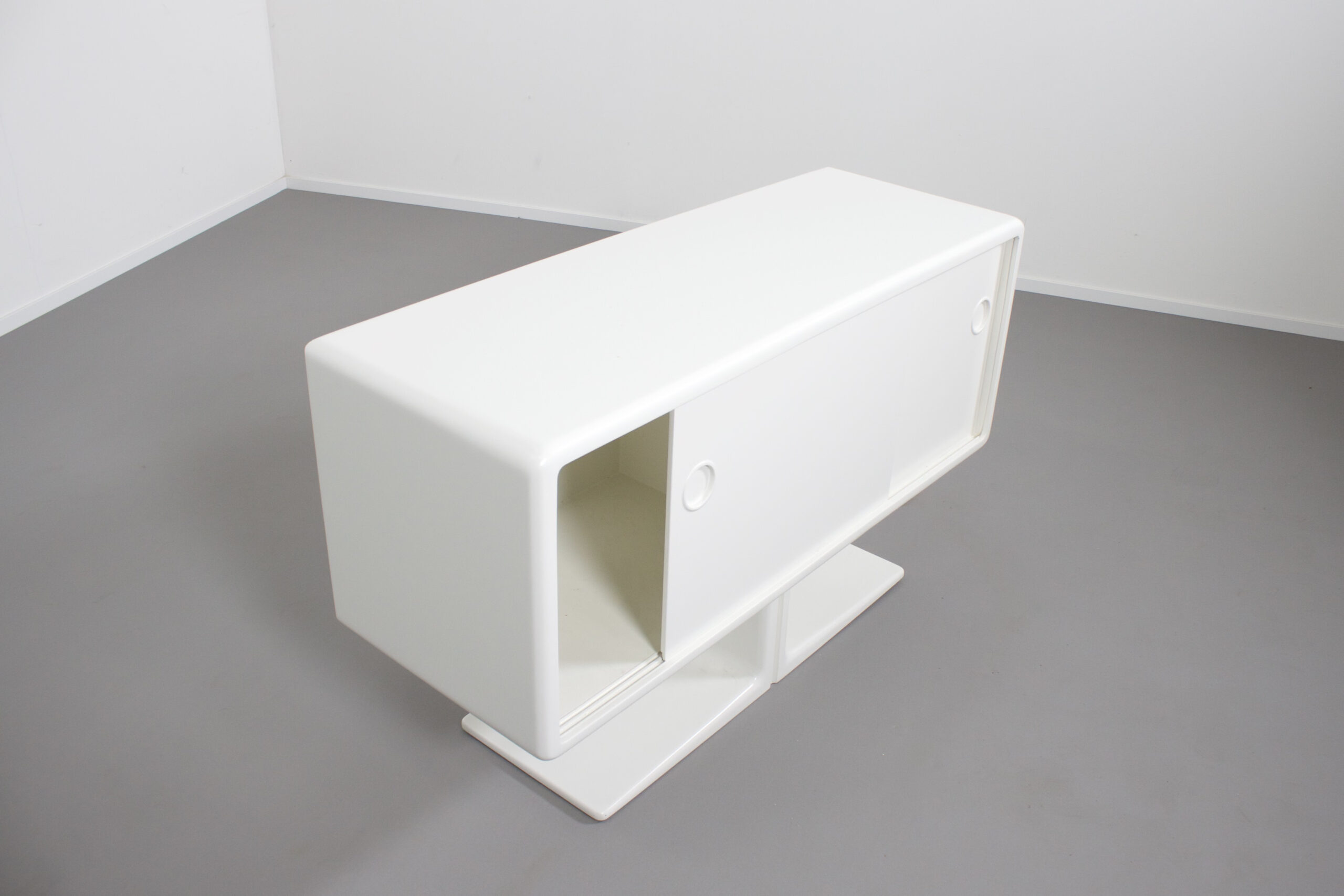 Beautiful Space Age cabinet by Ernest Igl for Wilhelm Werndl Completely restored, in very good condition. Body made of molded fiberglass, lacquered white sliding doors made wood. All sides of the cabinet are finished so it can be used as a room divider. Czech modern designer Ernest Igl was born in 1920 in Prague. After graduating from the Munich Academy of Visual Arts, he founded the IGL Studio in Munich. After World War II, he worked as a graphic designer, illustrator, and Industrial designer. While information on Igl is limited, his 1970 Jet Desk has found renewed popularity in recent re-editions, and his original designs, such as the Jet and the curvaceous 1971 Hadi Desk and Chair, produced by German company Bayer AG, are coveted by collectors.