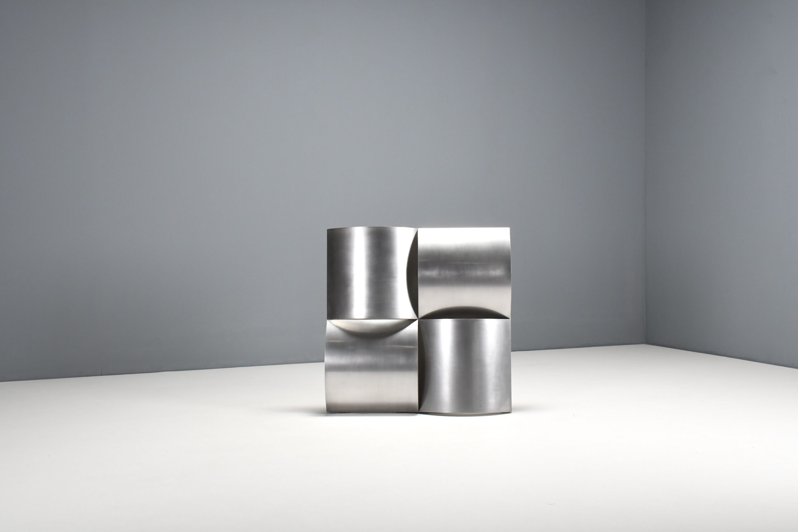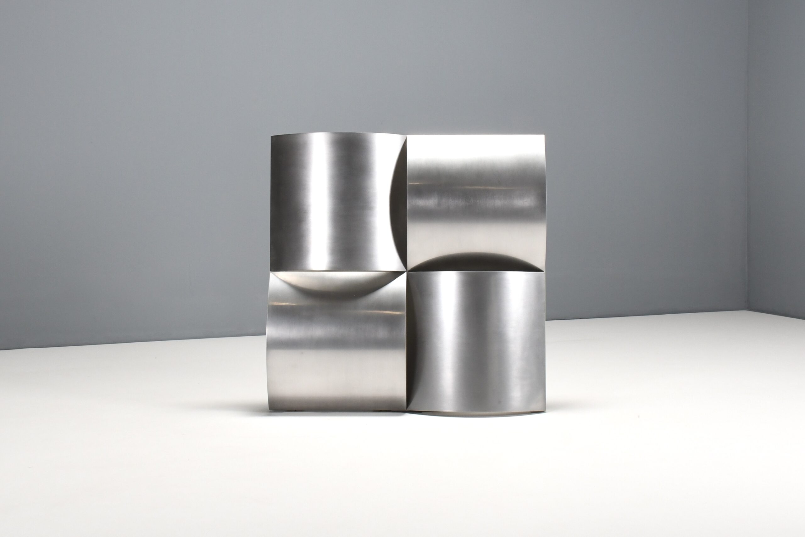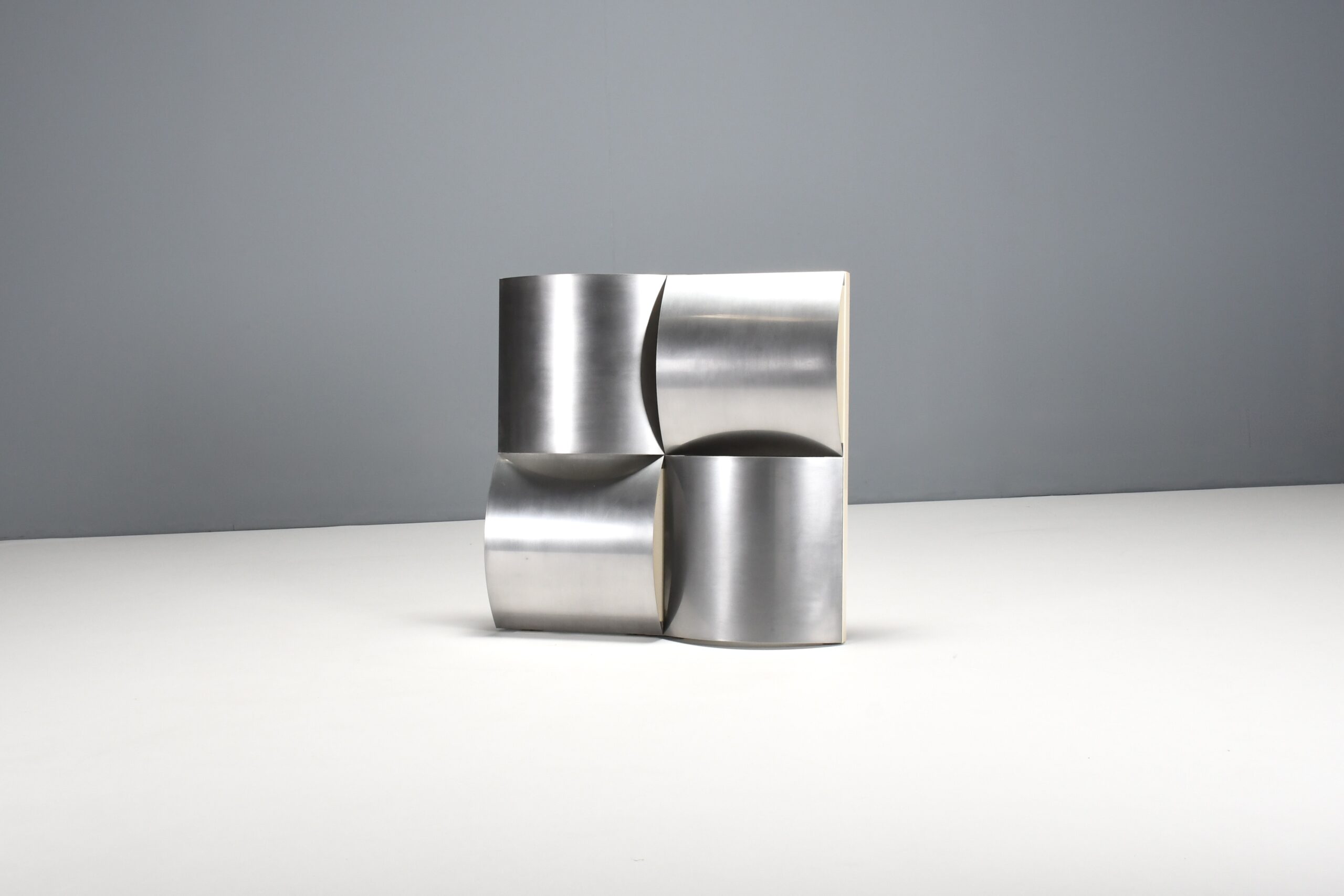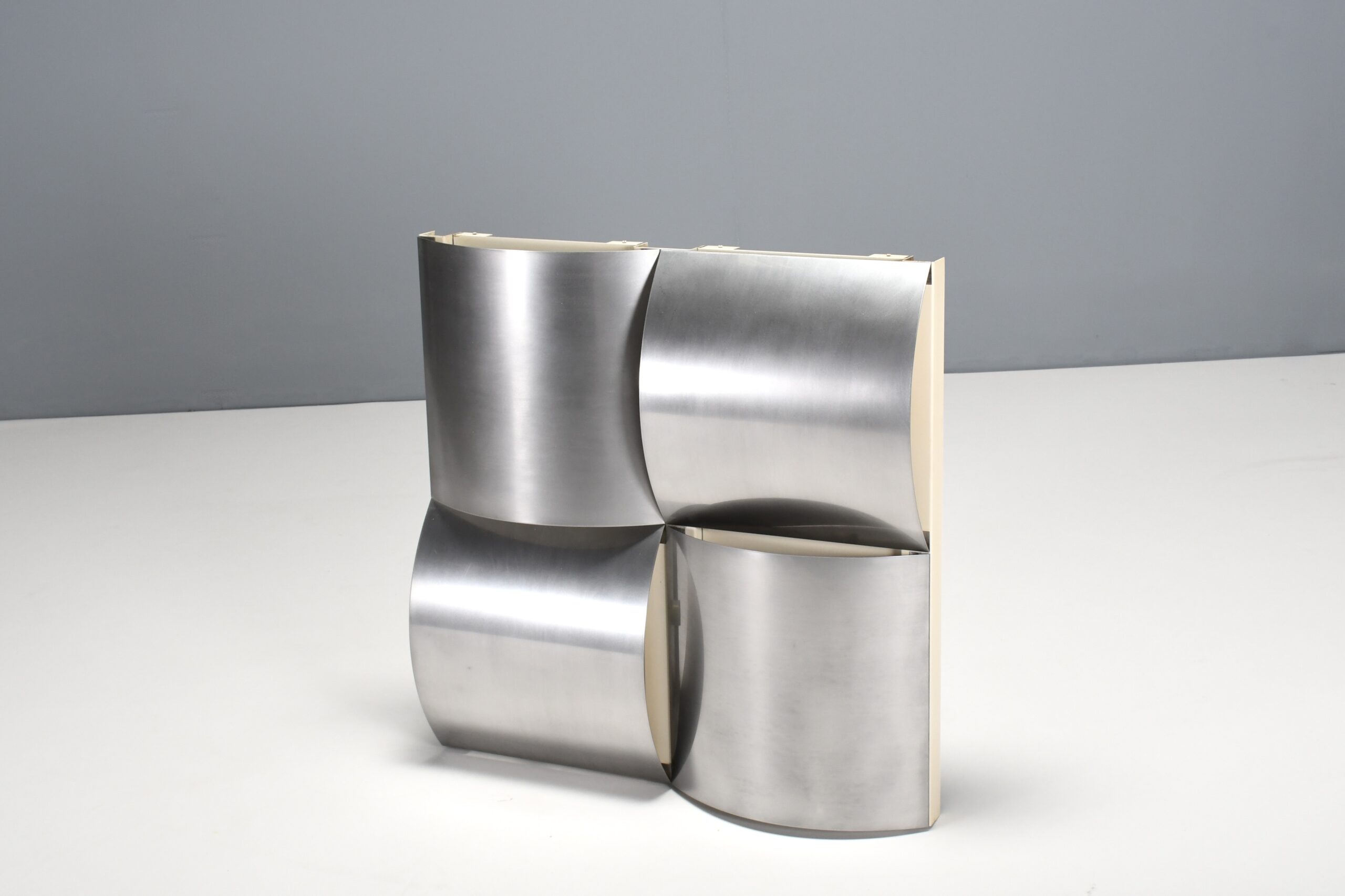 The lamp consists of a white lacquered structure that holds four bend panels made of polished stainless steel positioned in different directions.
