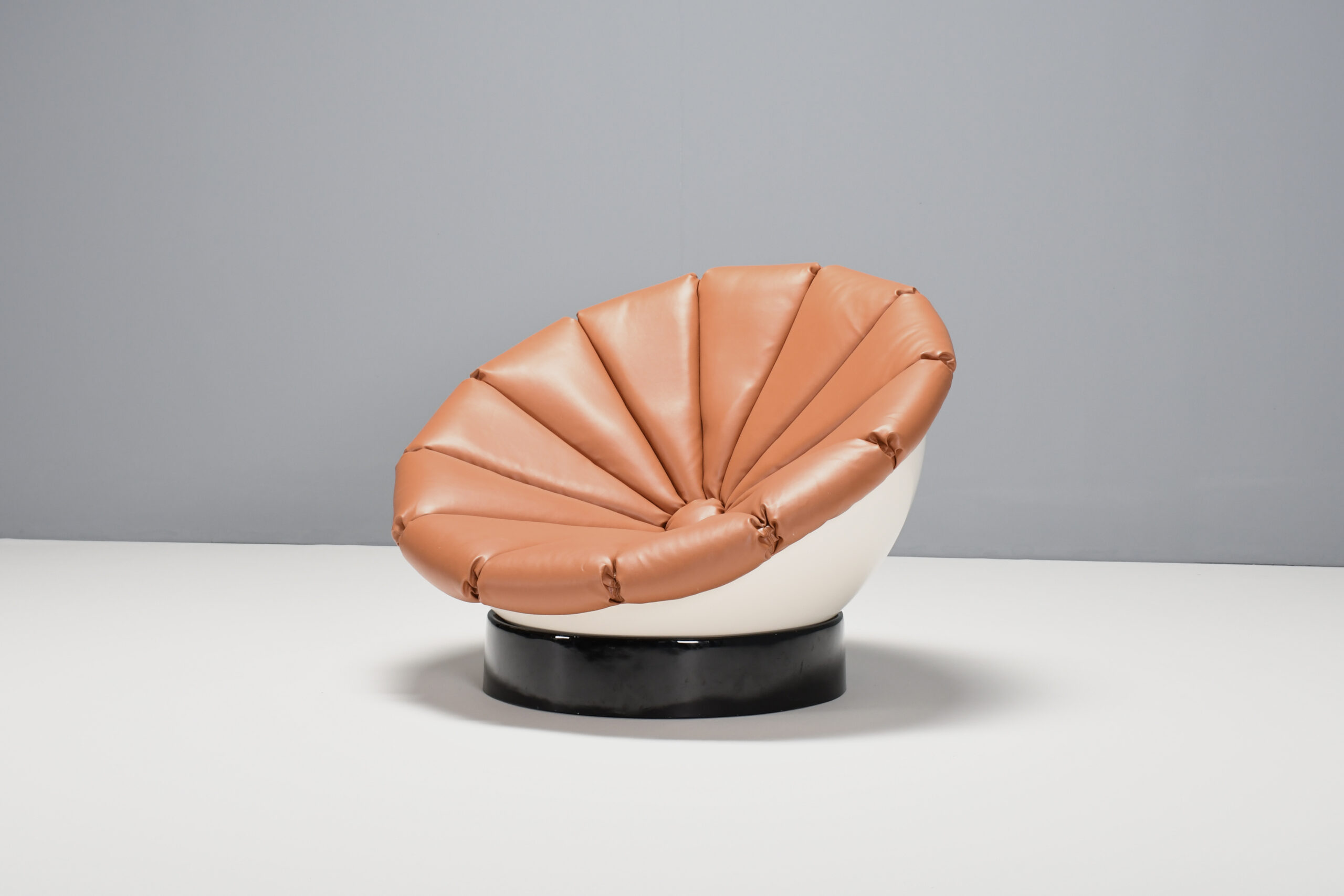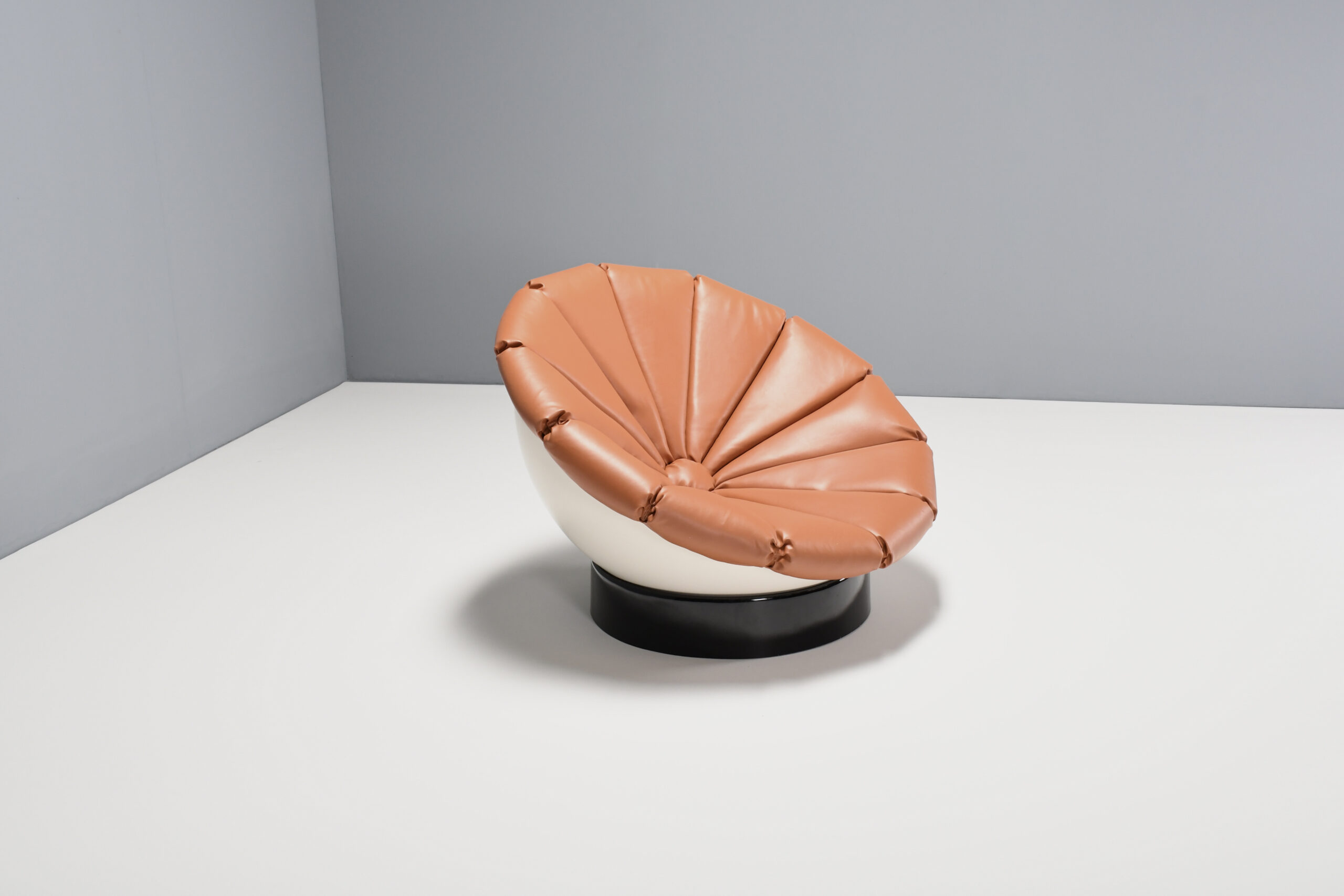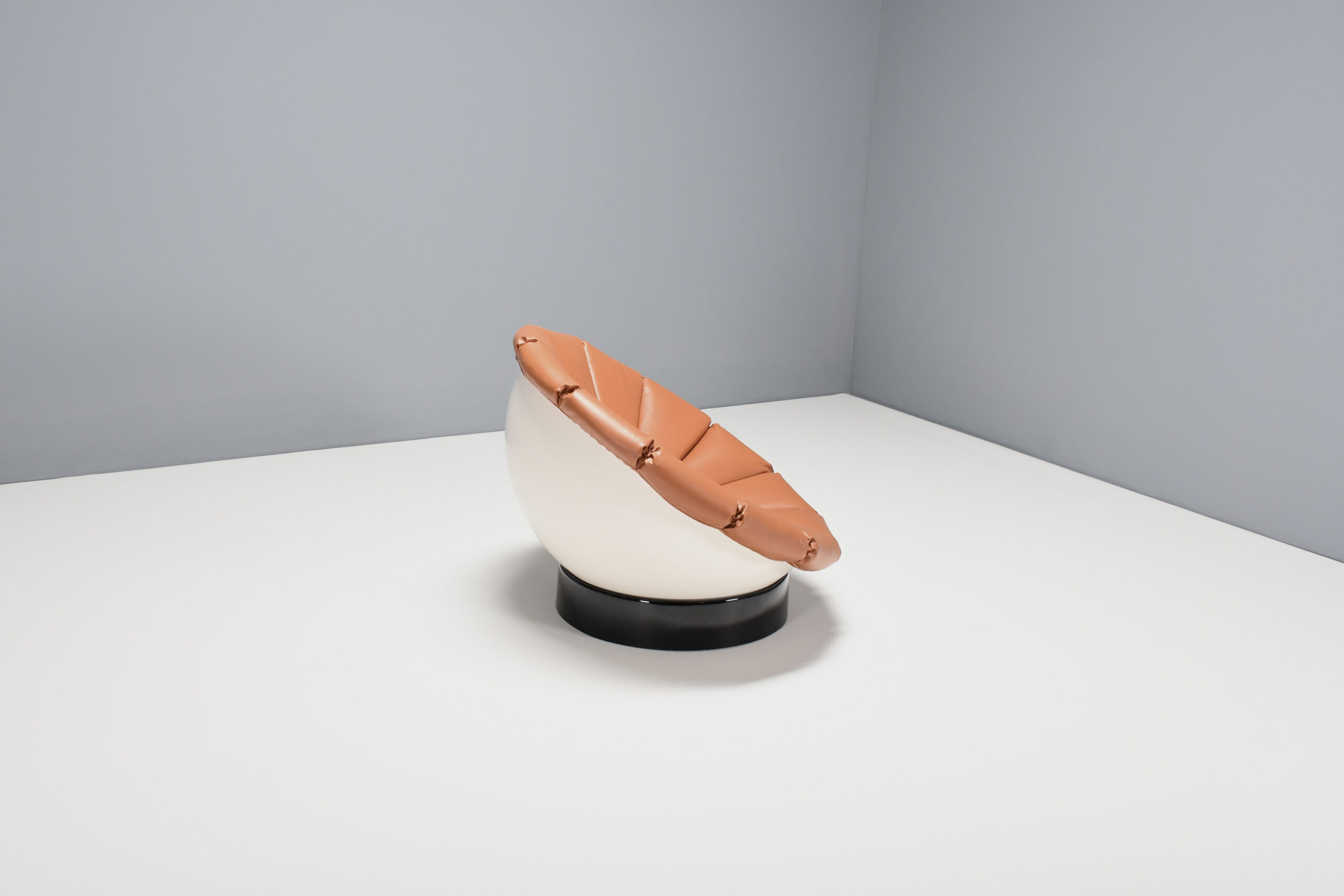 Beautiful Space Age ‘Girasole’ chair in excellent condition. Designed by Luciano Frigerio in the 1960s. The chair consists of a fiberglass half sphere which is lacquered white. The sphere rests on a black lacquered fiberglass ring which enables it to move in every direction and angle. The chair is reupholstered in a high quality faux leather in a cognac color. The upholstery is formed in the chape of a flower. That’s why the chair is called ‘Girasole’ which is Italian for sunflower.