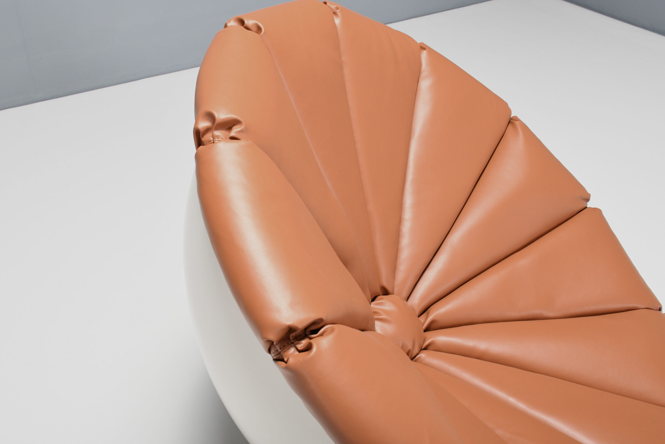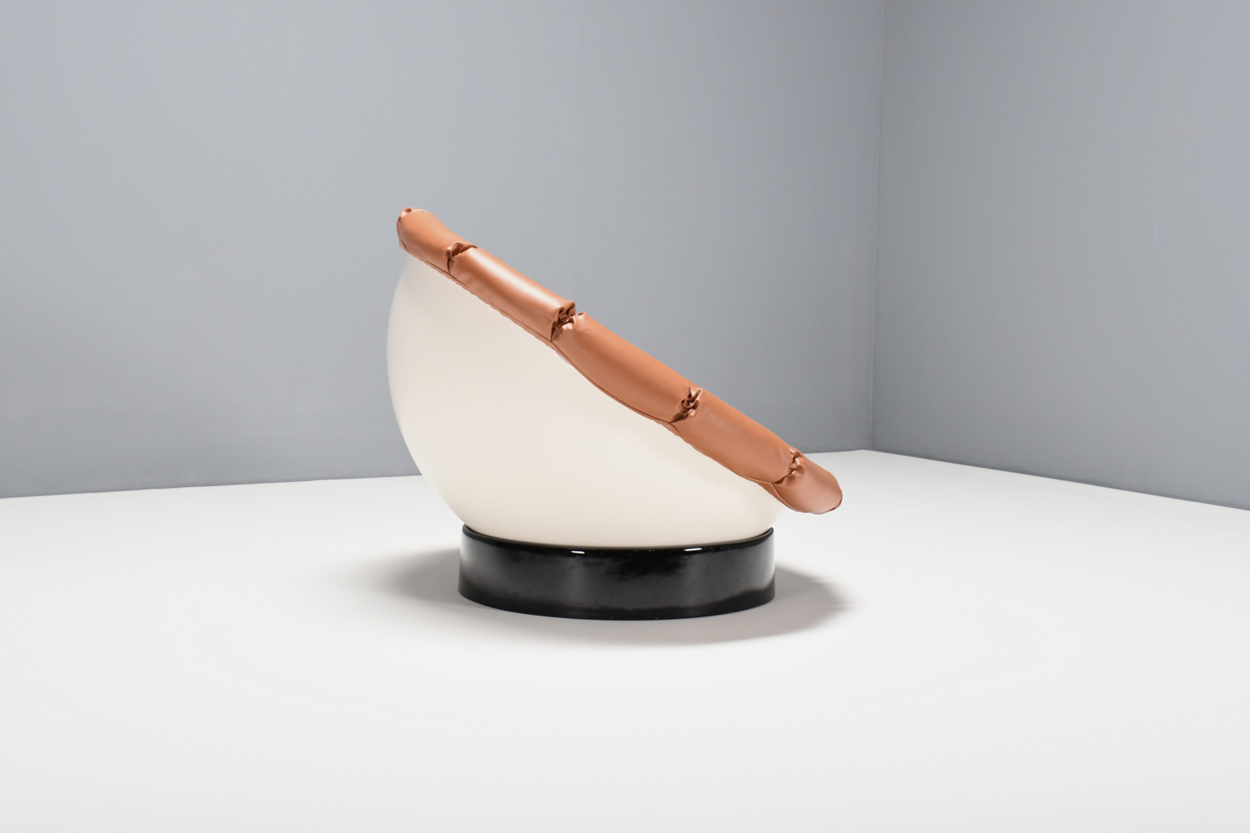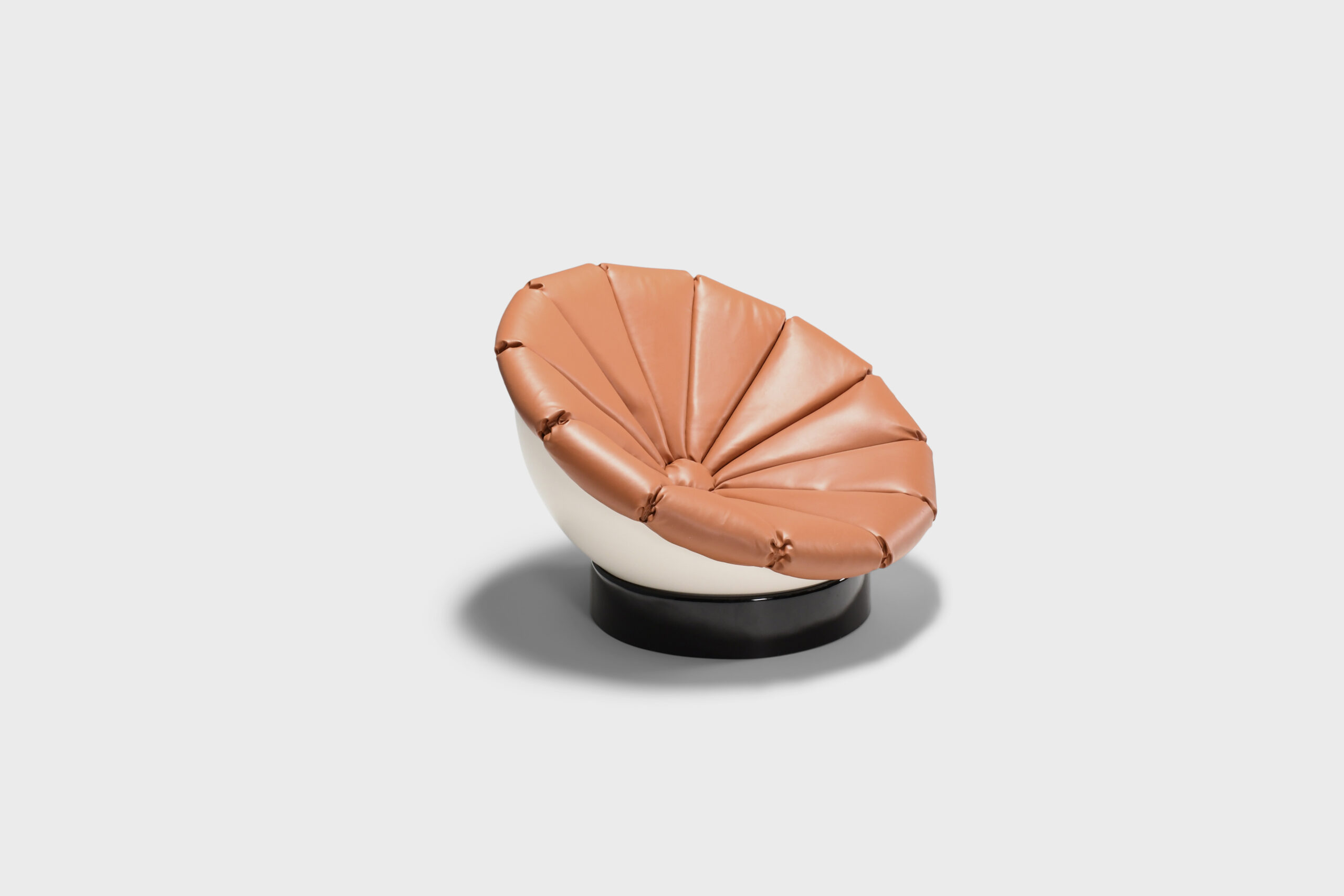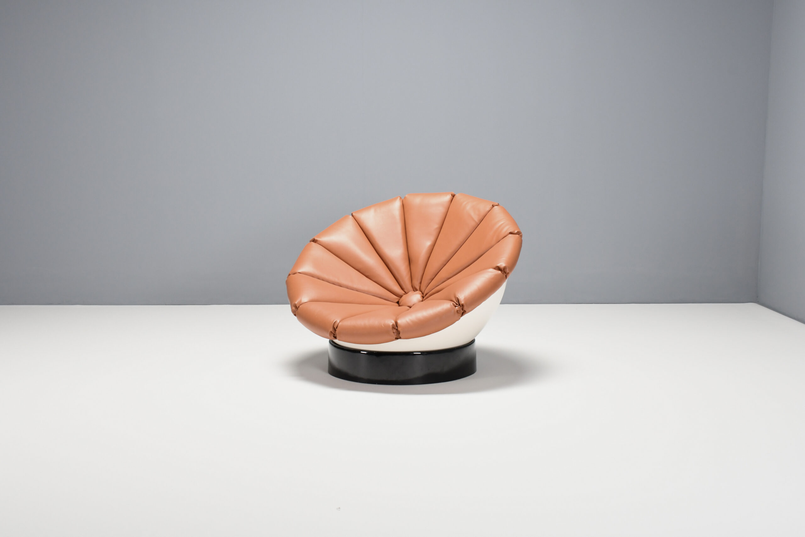 Beautiful Space Age ‘Girasole’ chair in excellent condition. Designed by Luciano Frigerio in the 1960s. The chair consists of a fiberglass half sphere which is lacquered white. The sphere rests on a black lacquered fiberglass ring which enables it to move in every direction and angle. The chair is reupholstered in a high quality faux leather in a cognac color. The upholstery is formed in the chape of a flower. That’s why the chair is called ‘Girasole’ which is Italian for sunflower.