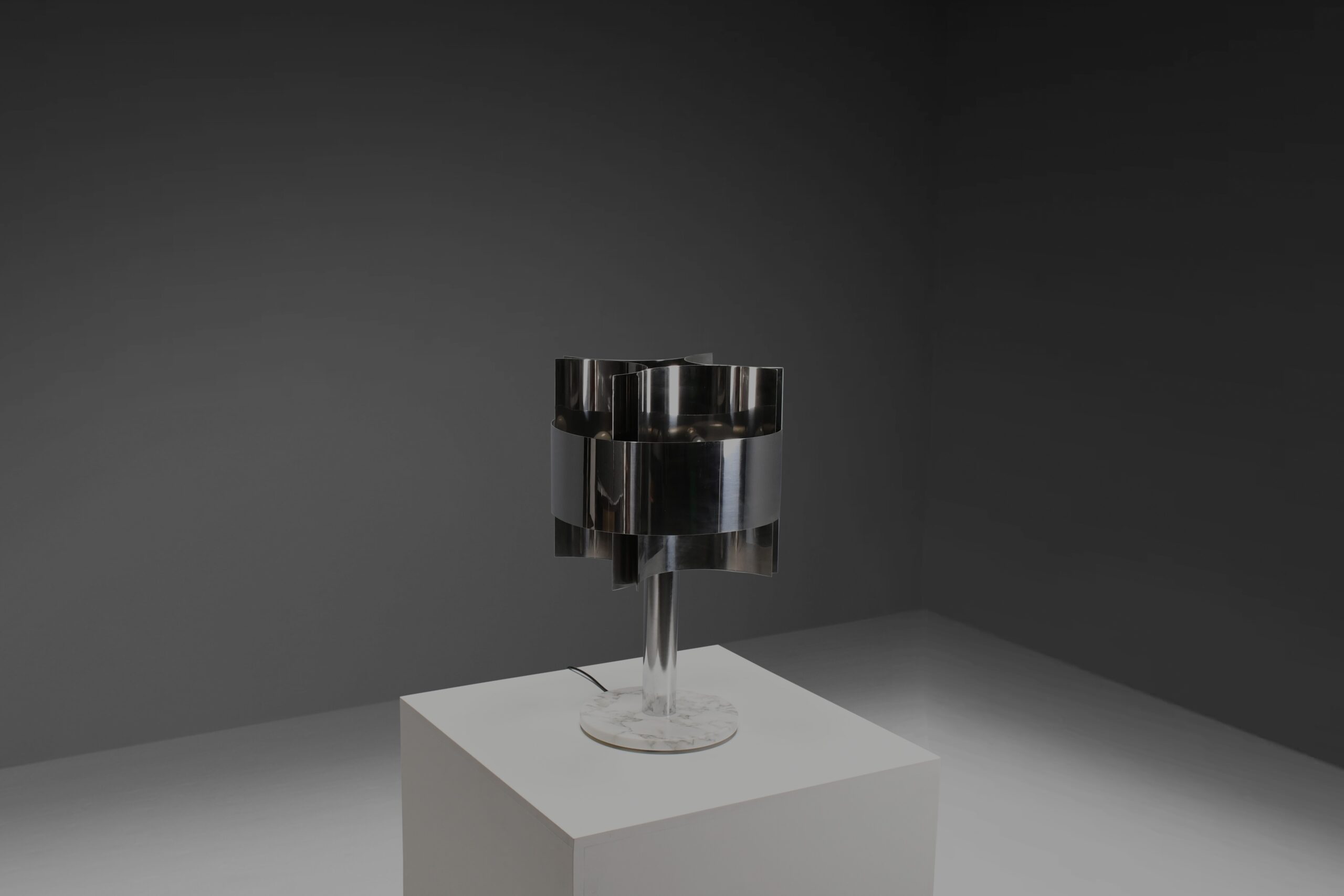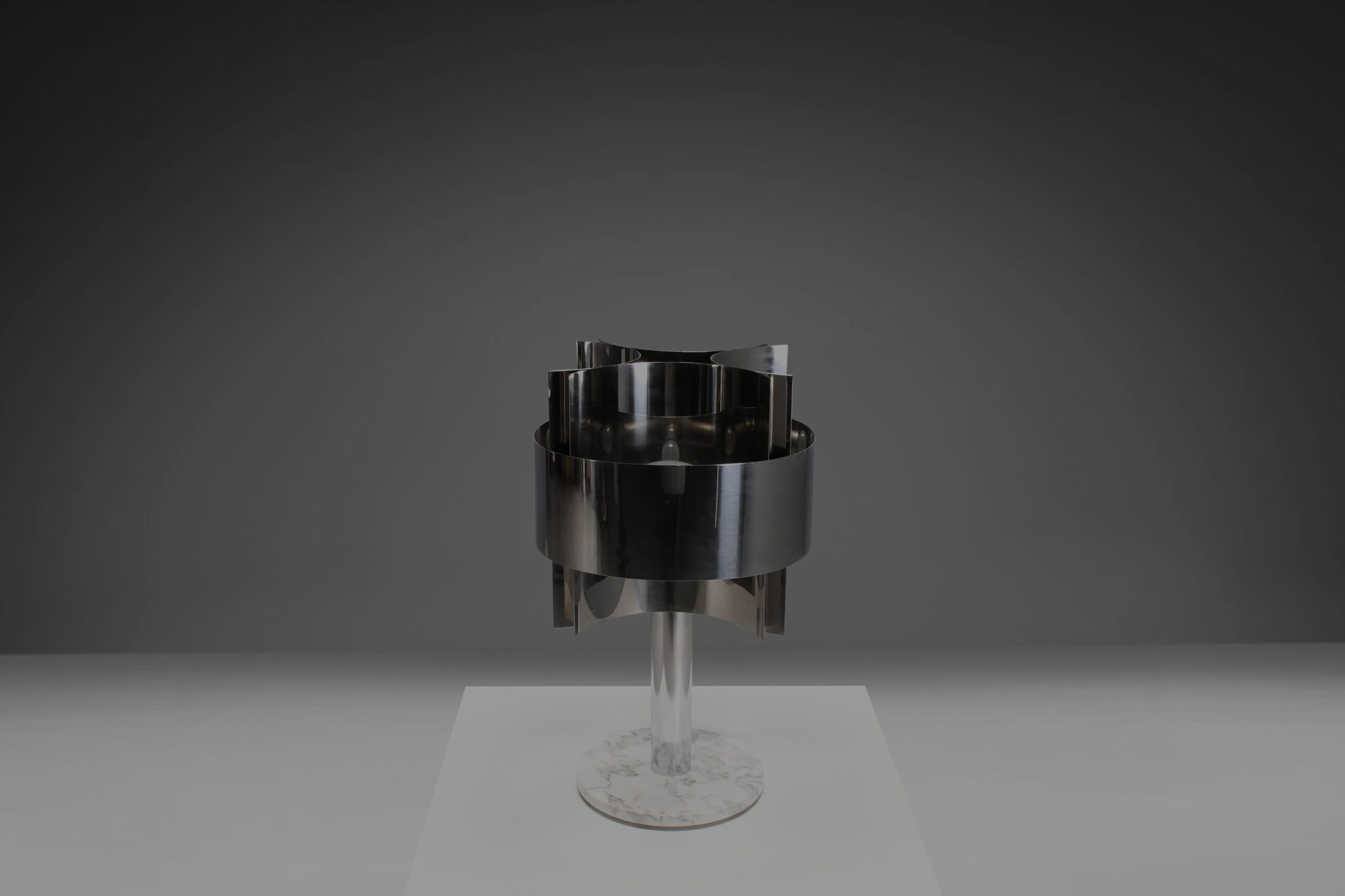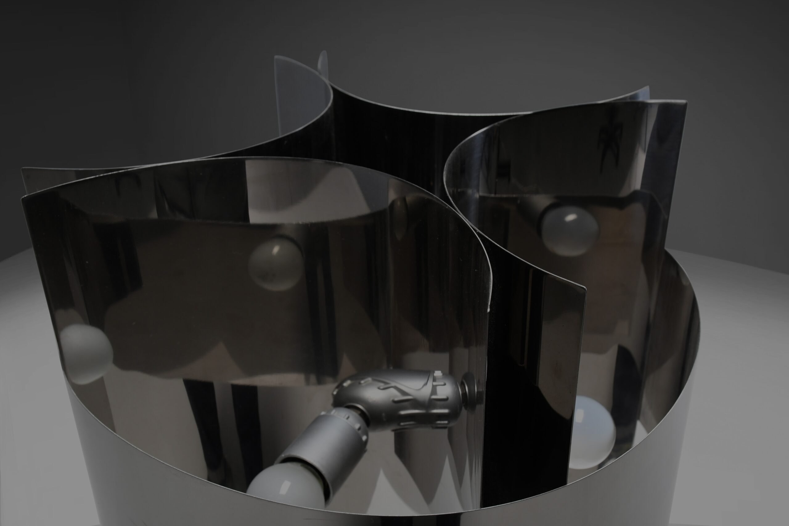 The unique design of the shade features curved sheets of chromed steel that create a striking, sculptural effect. The shade houses four light sockets, offering ample illumination.