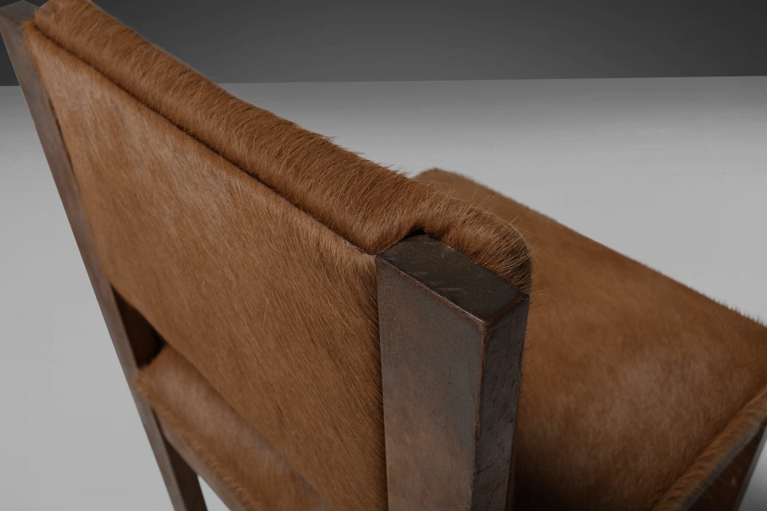 The cushions are reupholstered with a natural brown/beige cowhide which gives a very nice contrast with the dark wooden frame.