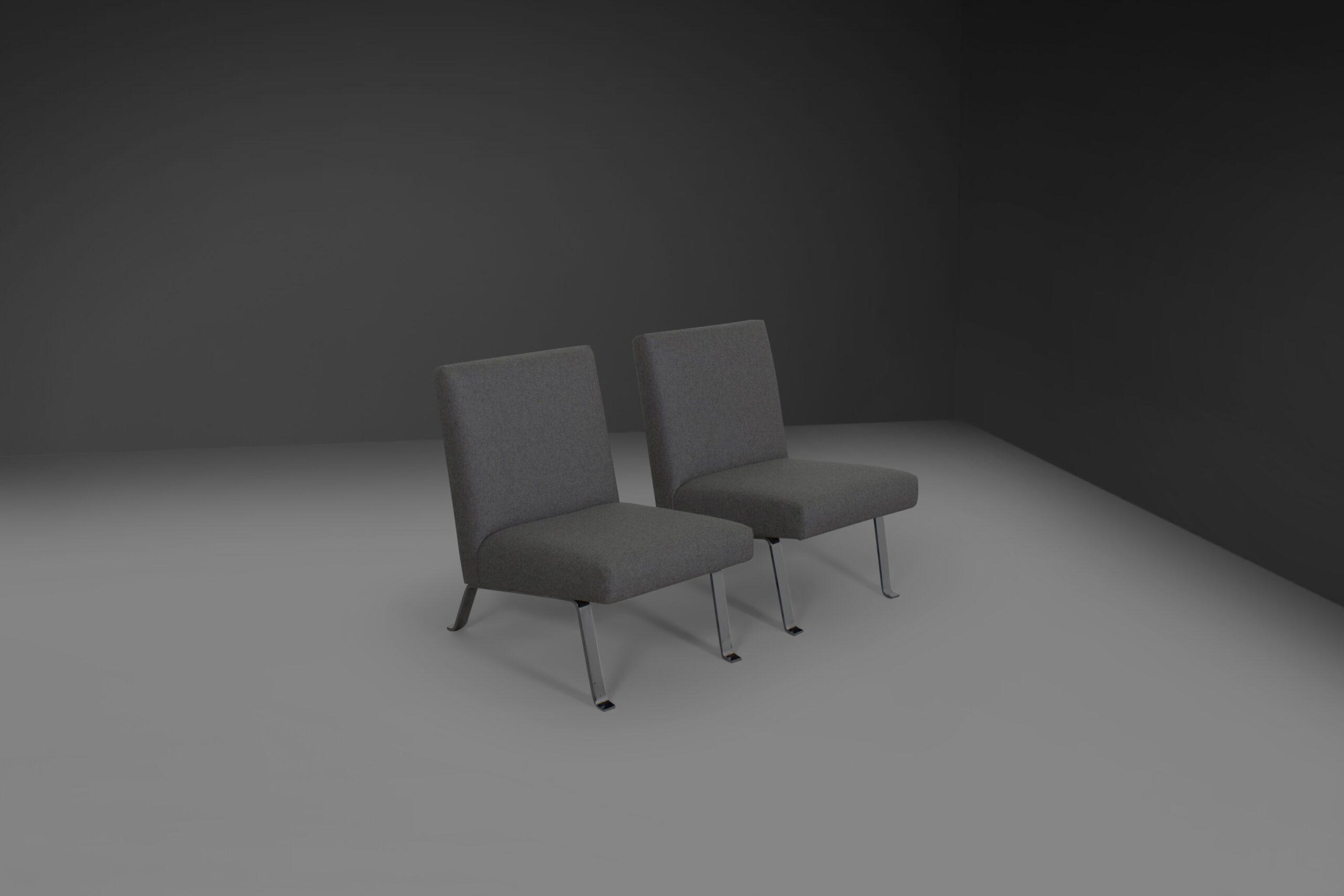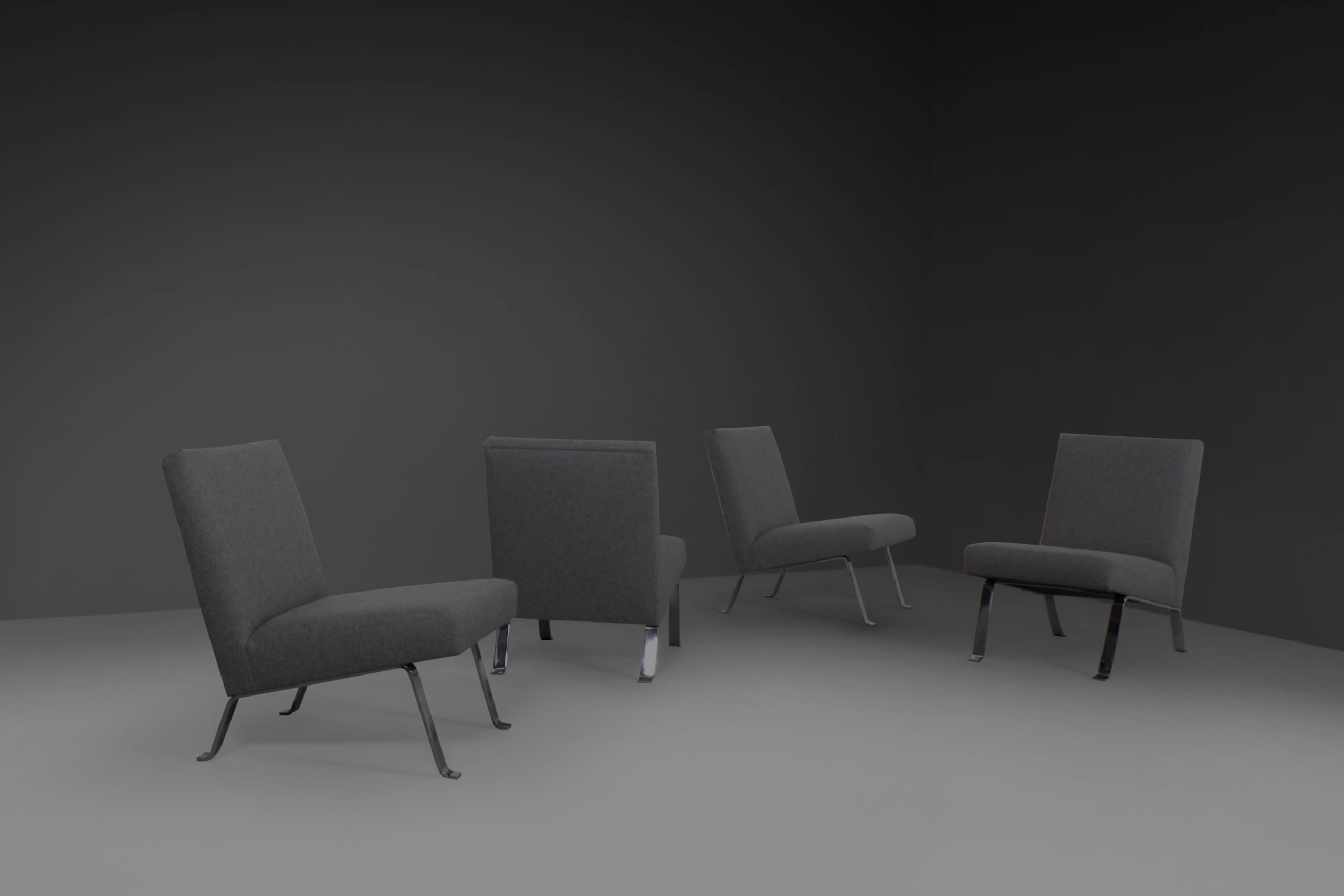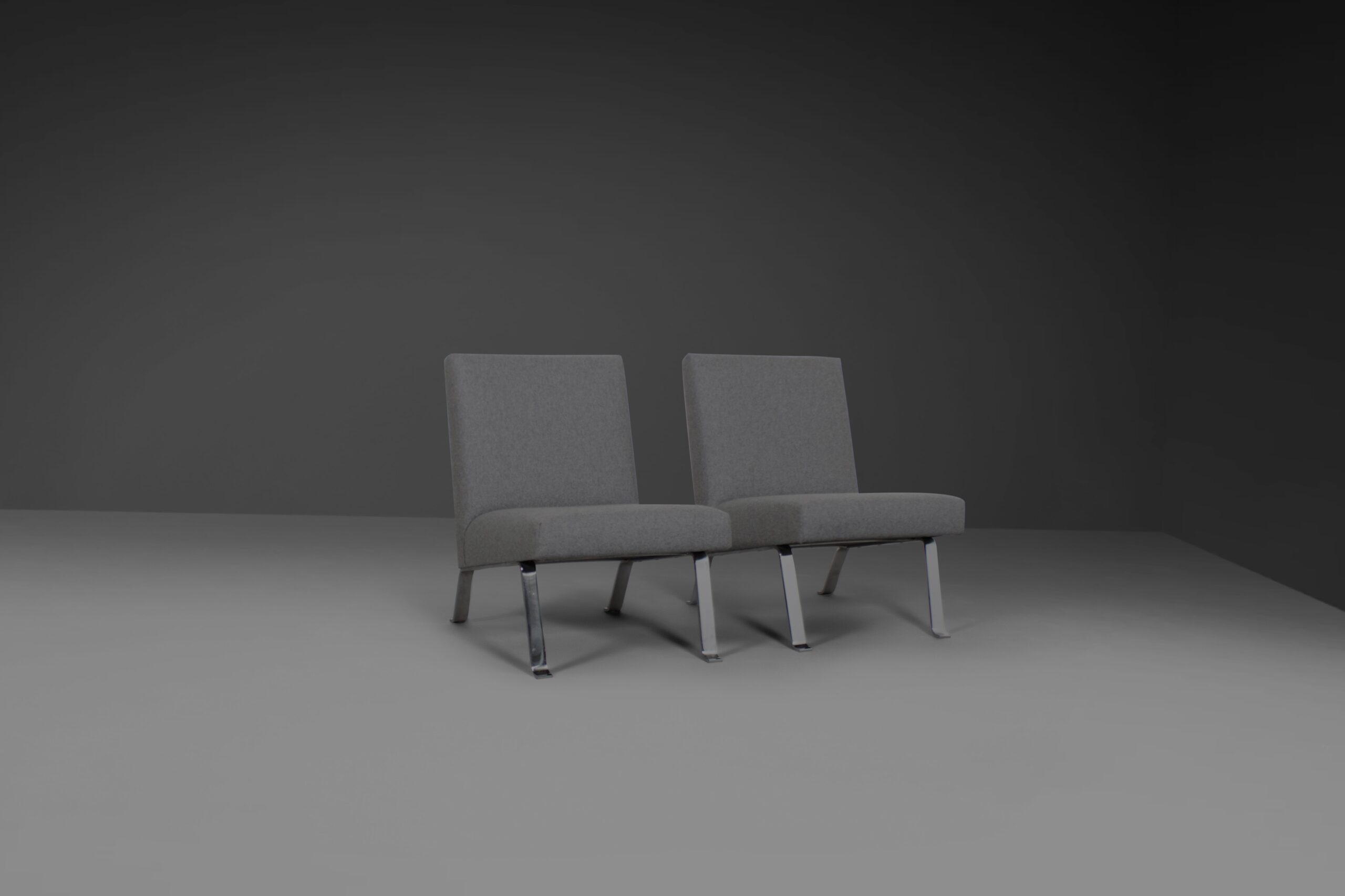 Set of four chairs in very good condition. Designed by Joseph Andre Motte in the 1950s. The chairs can be used separately but can also be combined to form a four-seat sofa. They are reupholstered in a grey woolen Divina Melange fabric. The heavy frame is made of chromed metal. The chairs can be ordered in pairs of two. The price is for a set of two.