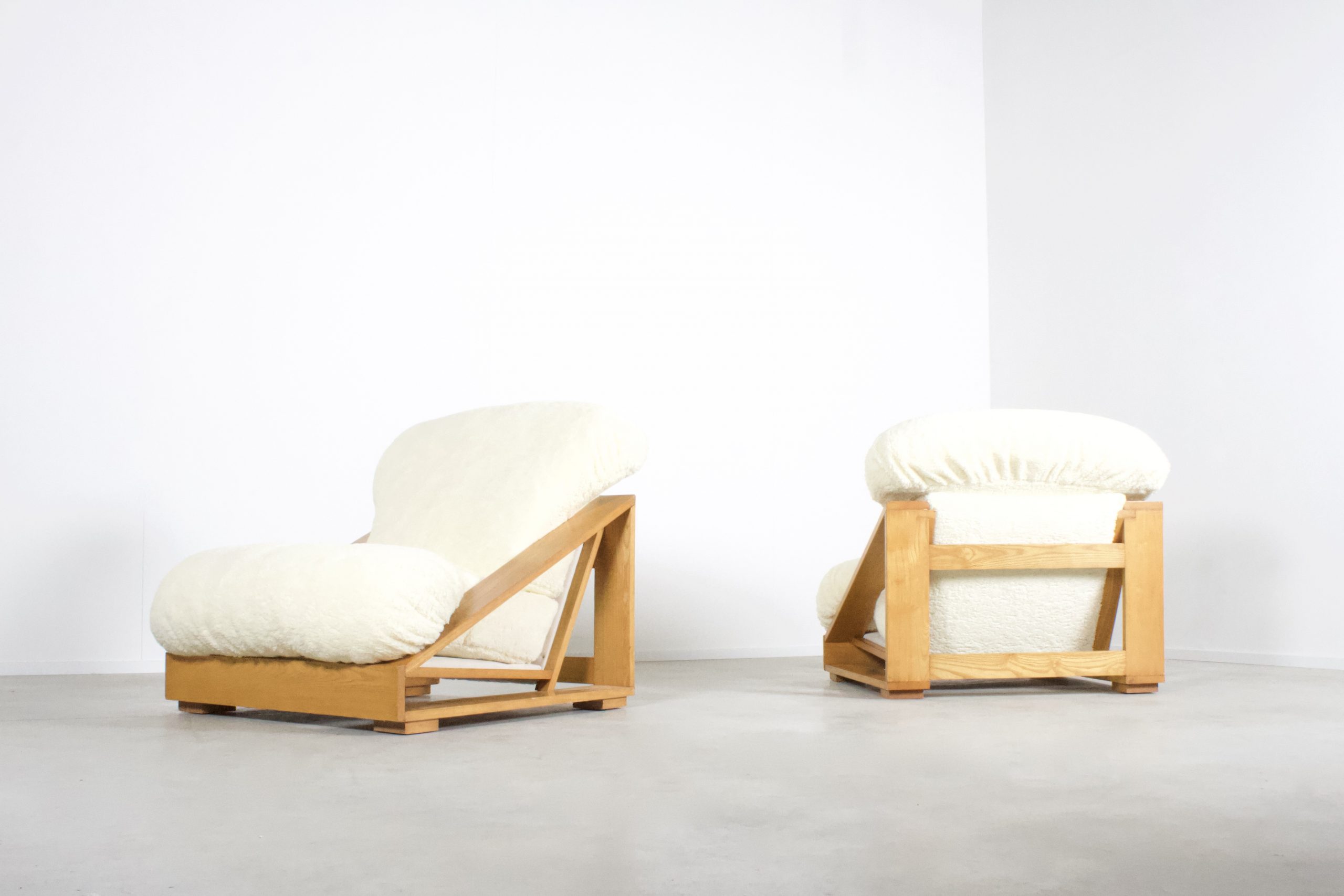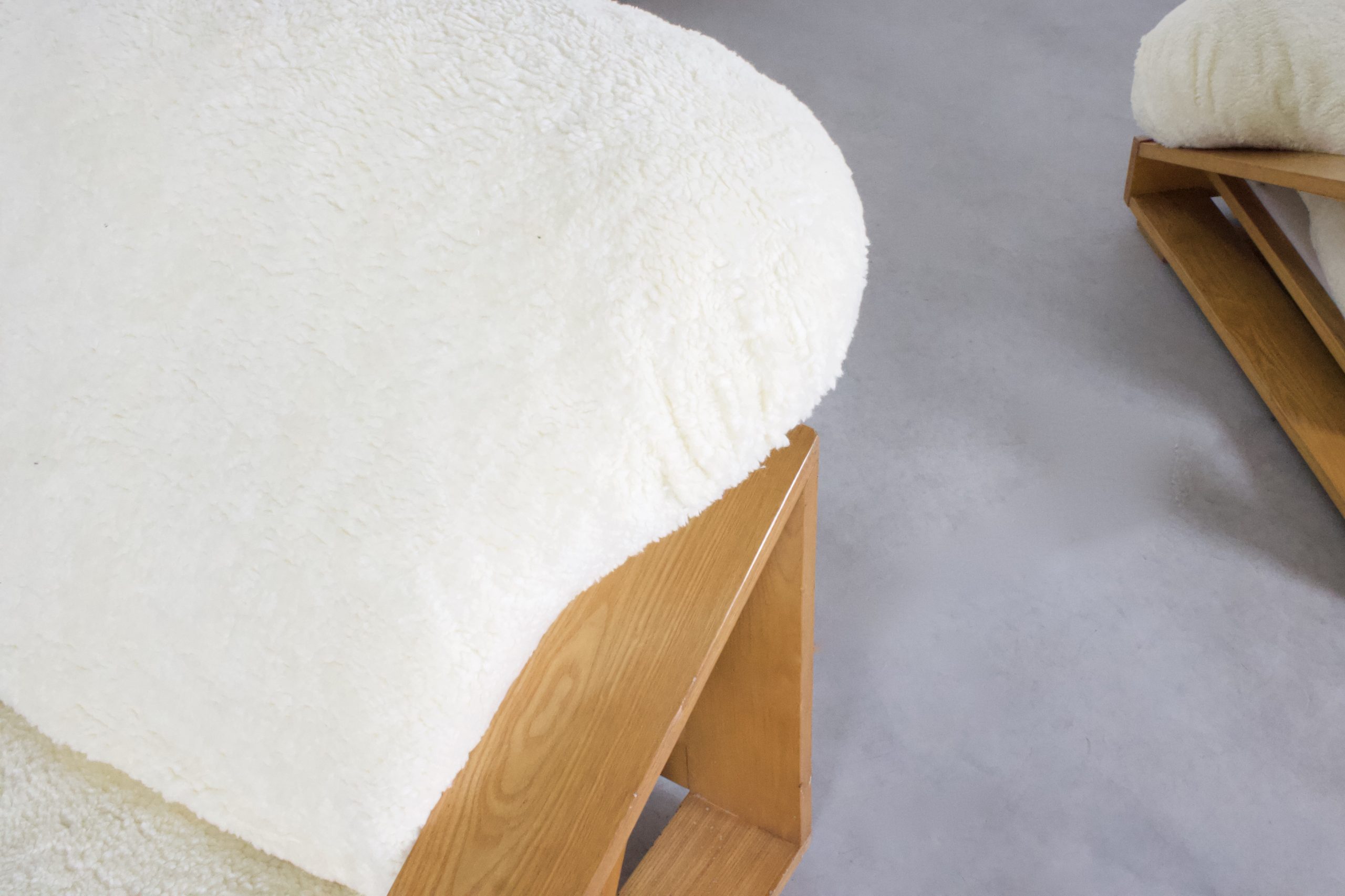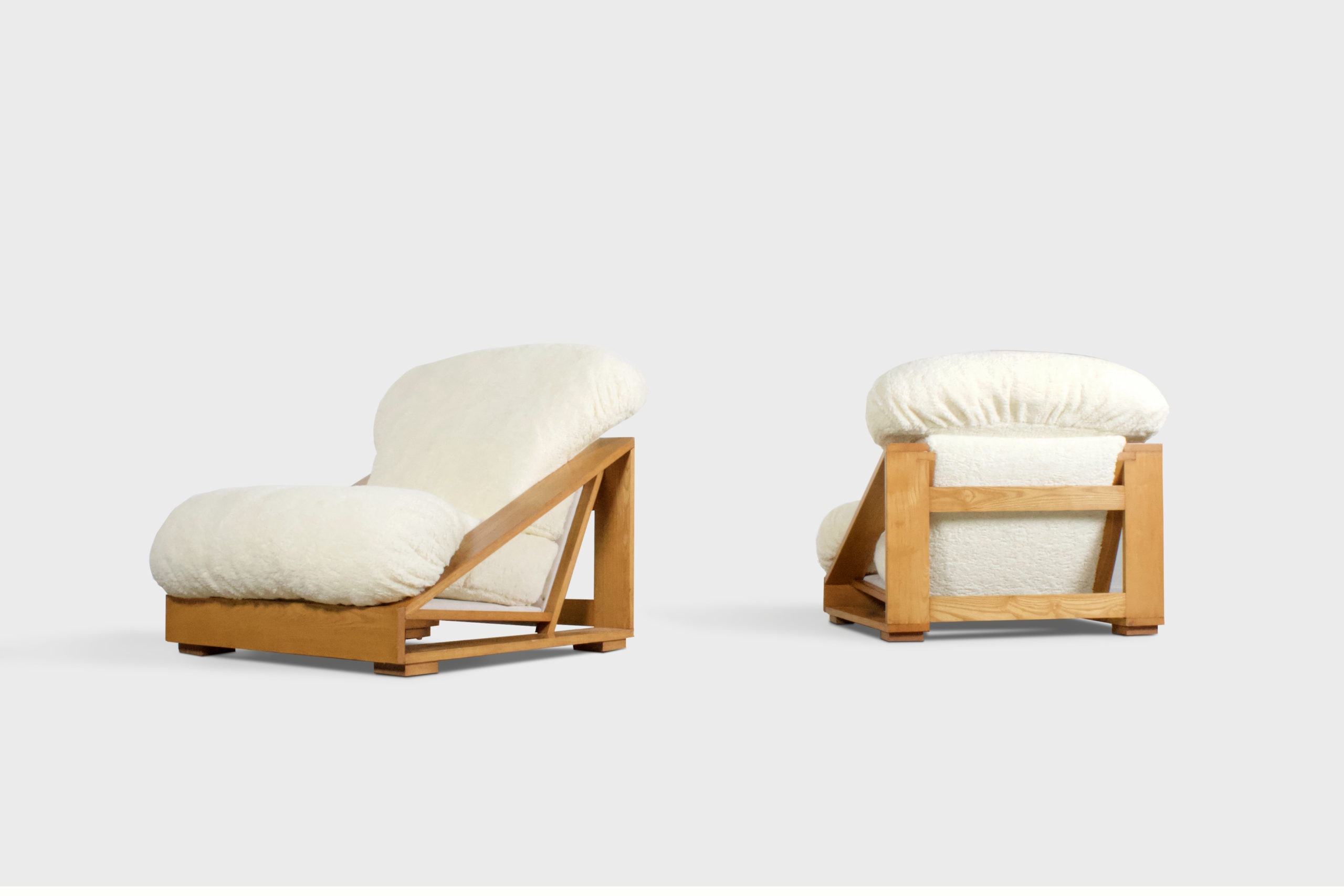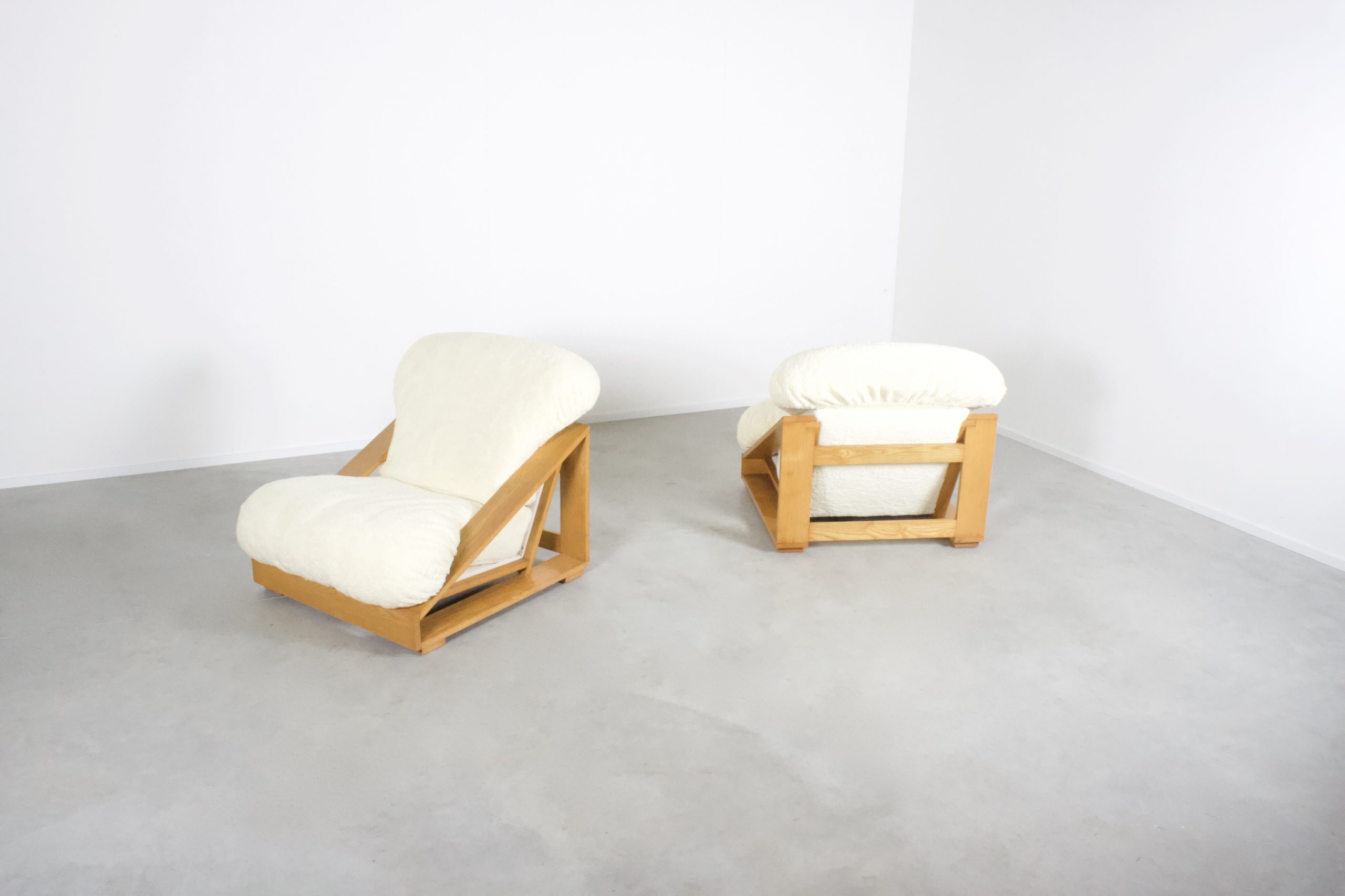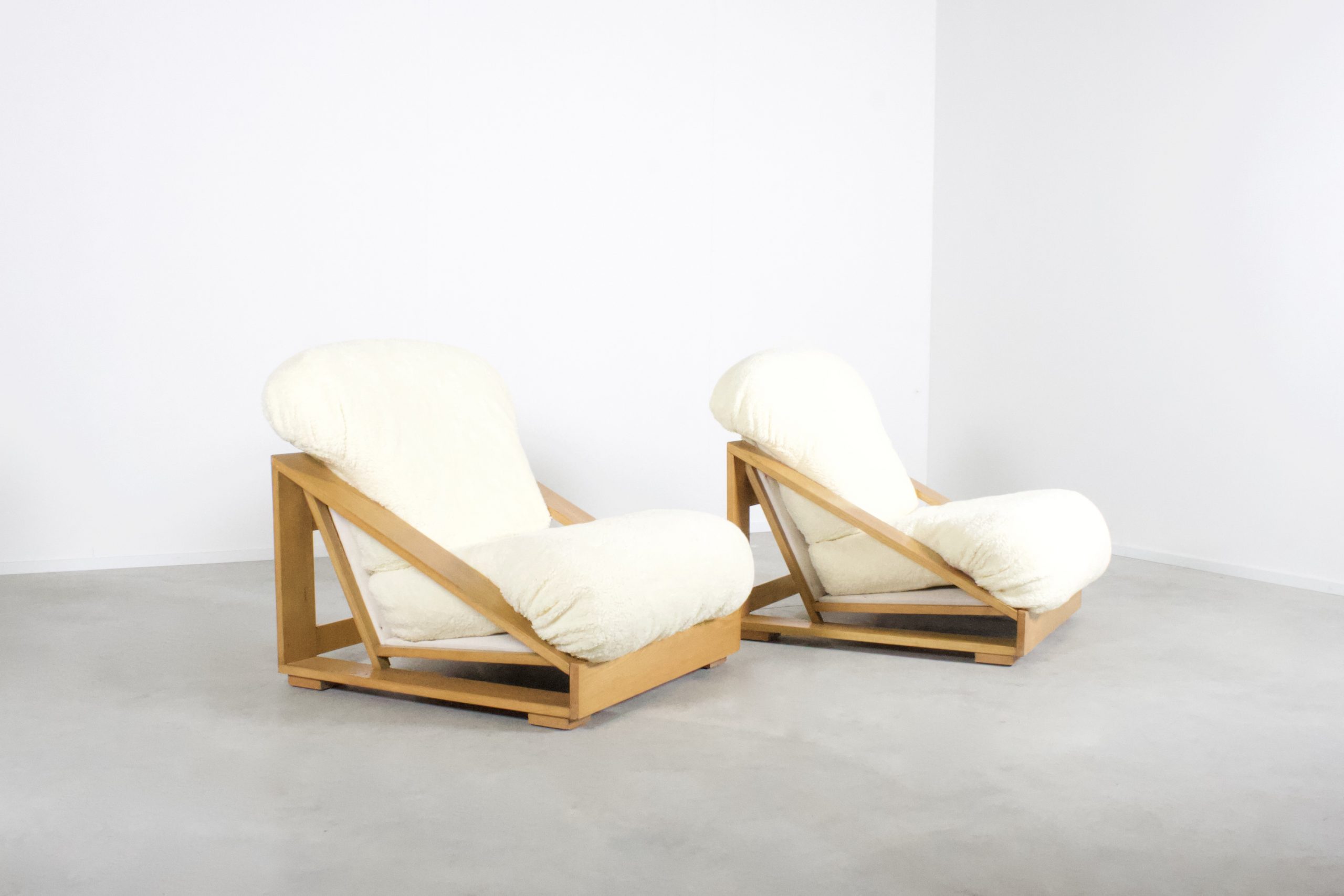 Impressive Italian lounge chairs in very good condition. Designed by Renato Toso and Roberto Pamio in Italy in the 1970s. Manufactured by Stilwood. The triangular shaped frame is made of pine wood. The soft cushions are upholstered in a ivory colored teddy fur fabric