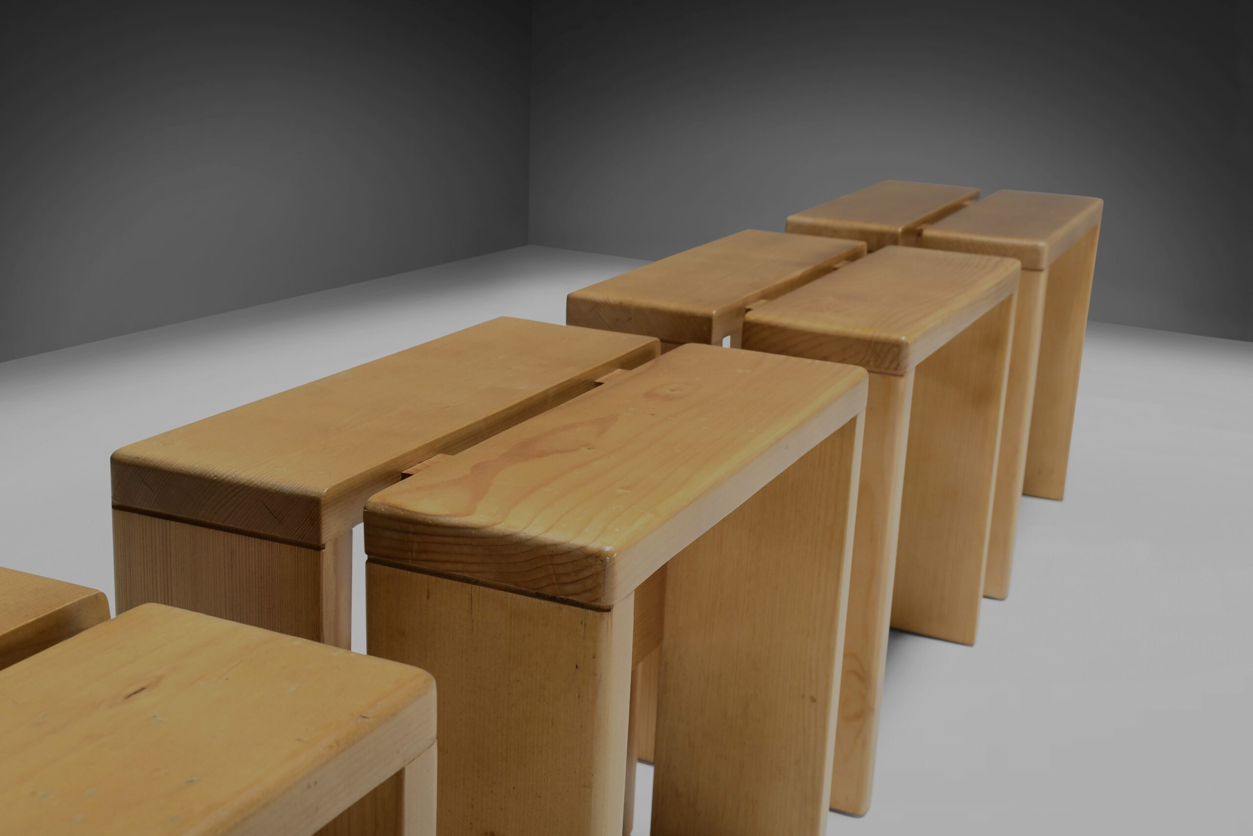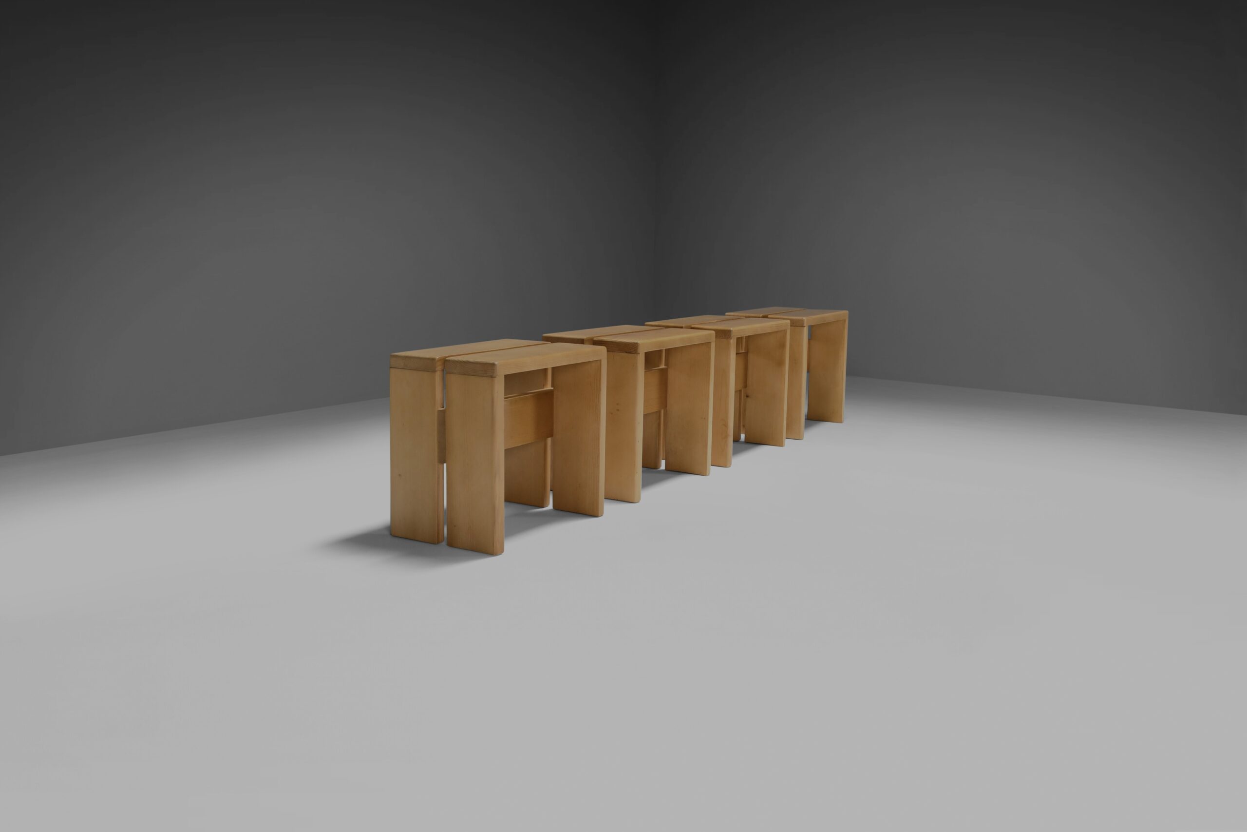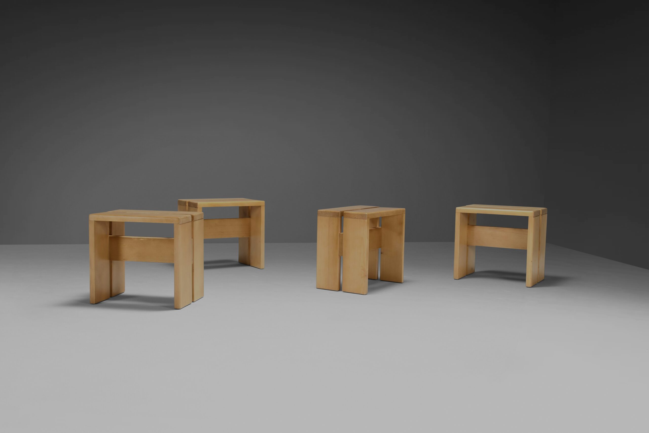 The stool are made of solid pine wood and have simple lines common with Perriand designs.