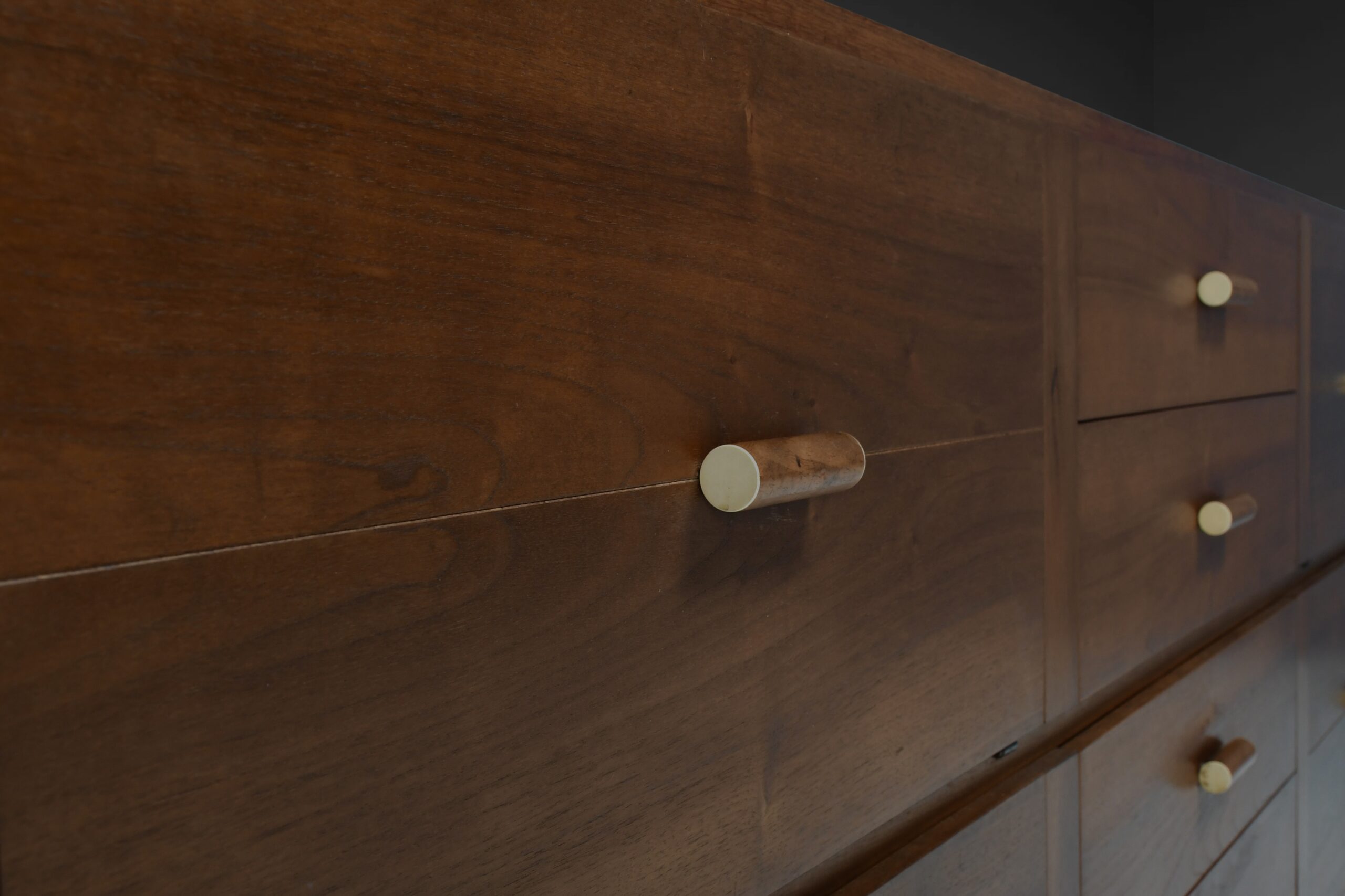 The sideboard is made from massive walnut and walnut veneer and has white accents on the round handles, it is very well made and of very heavy quality.