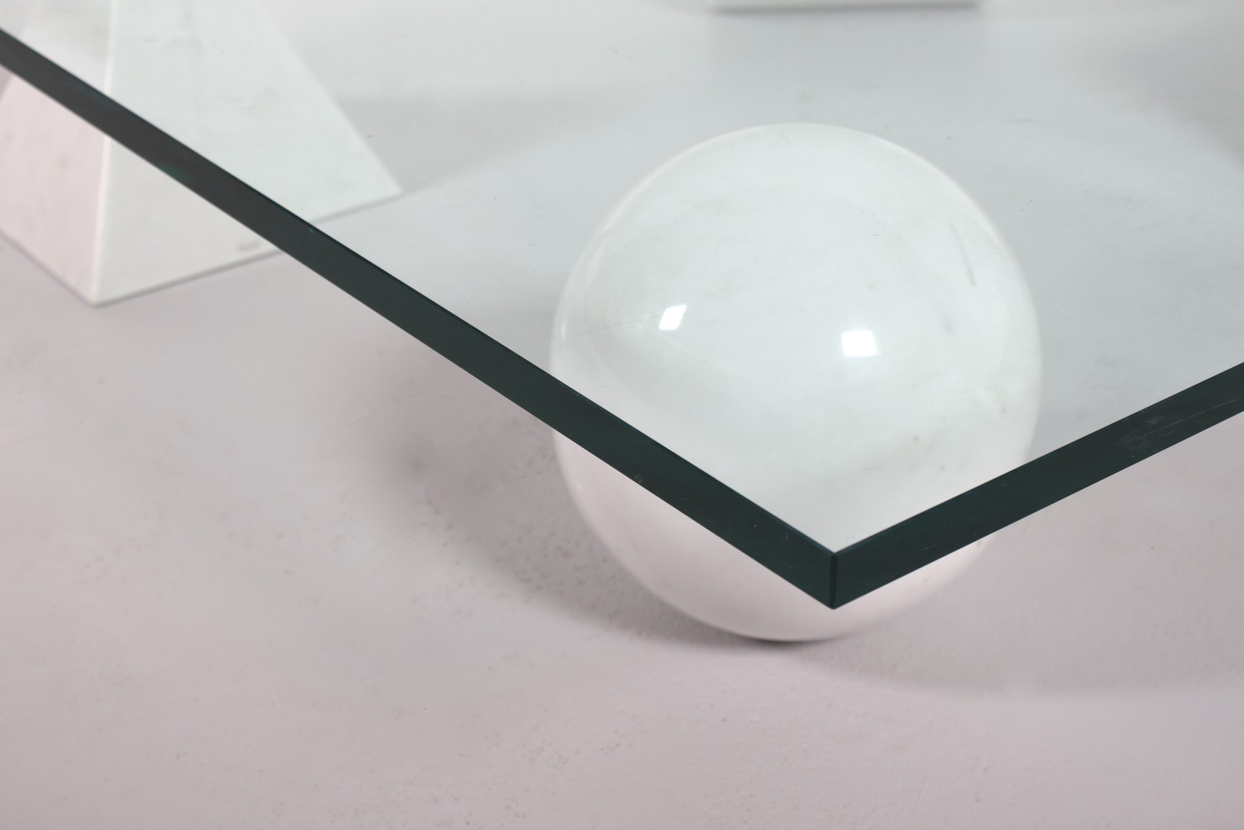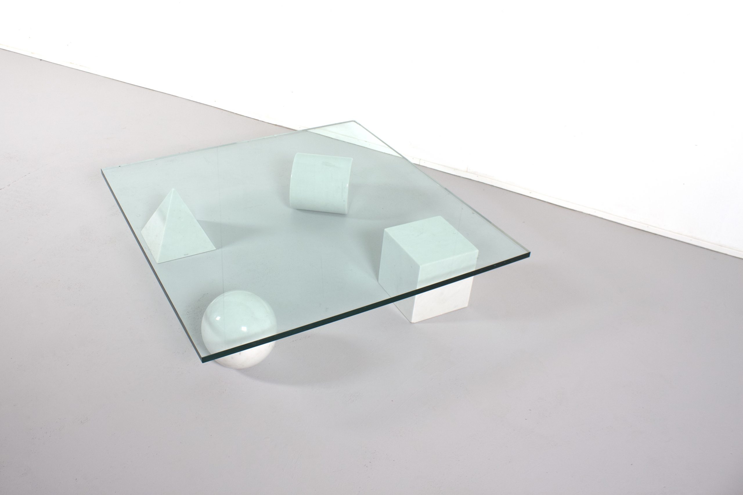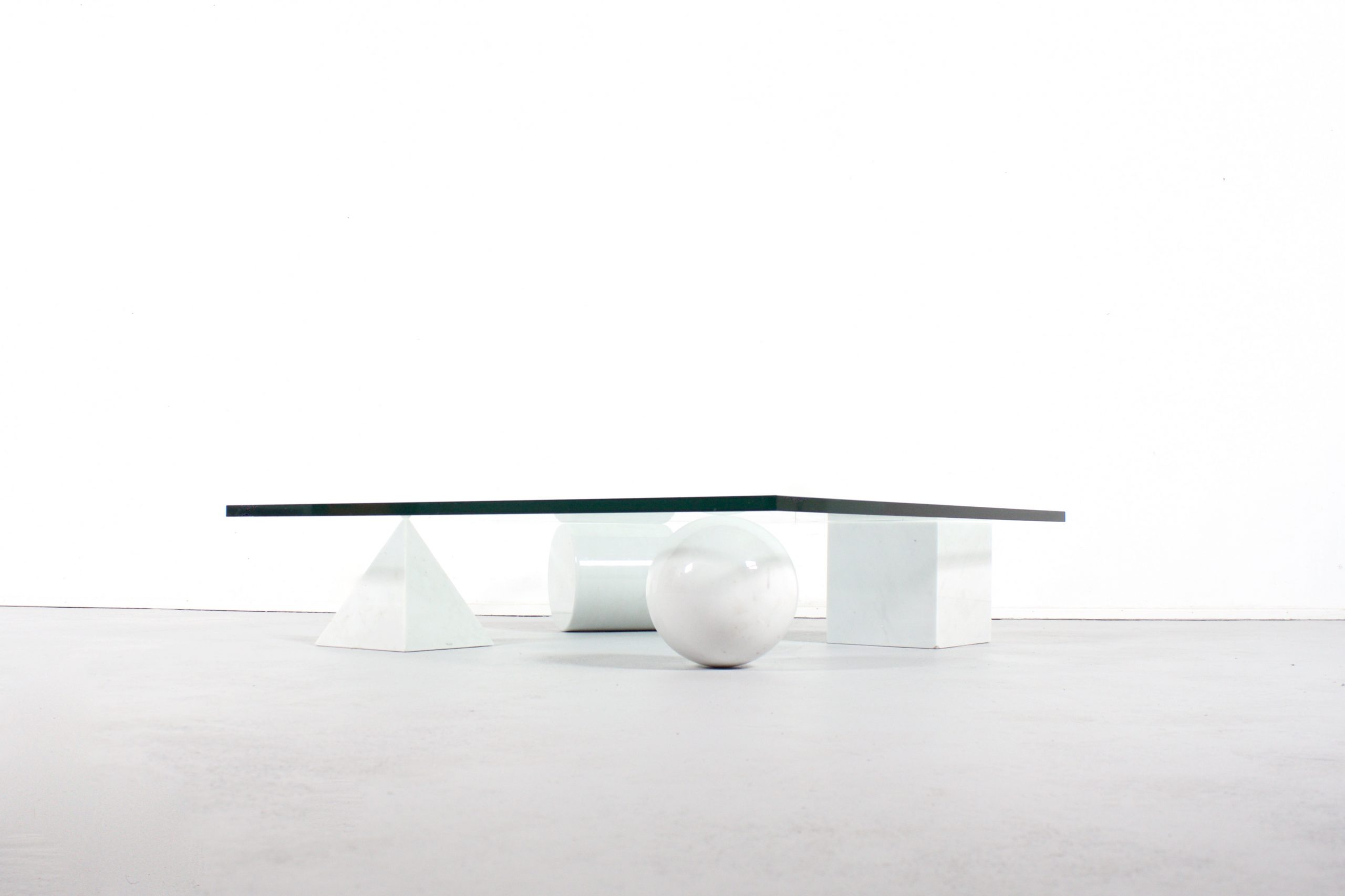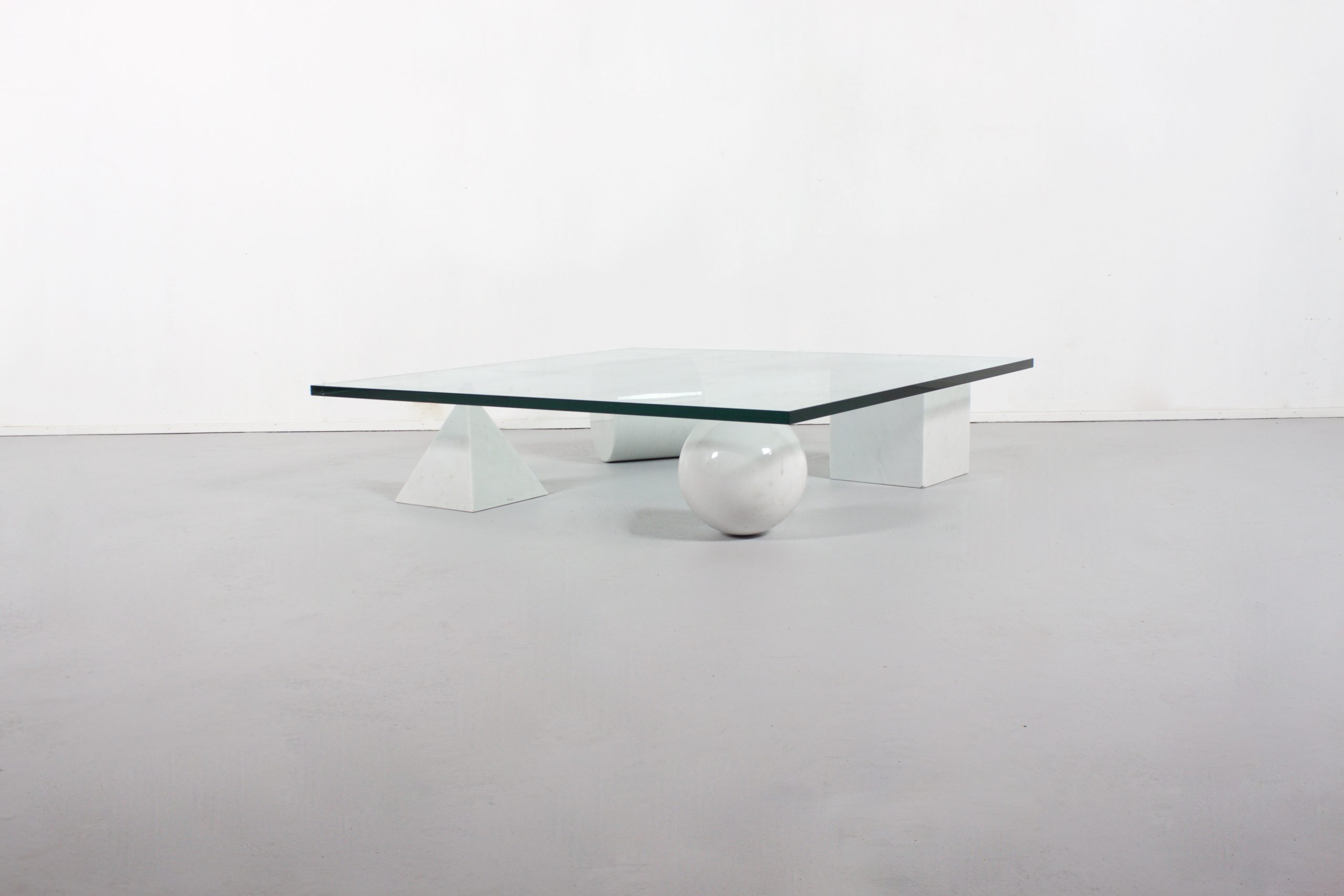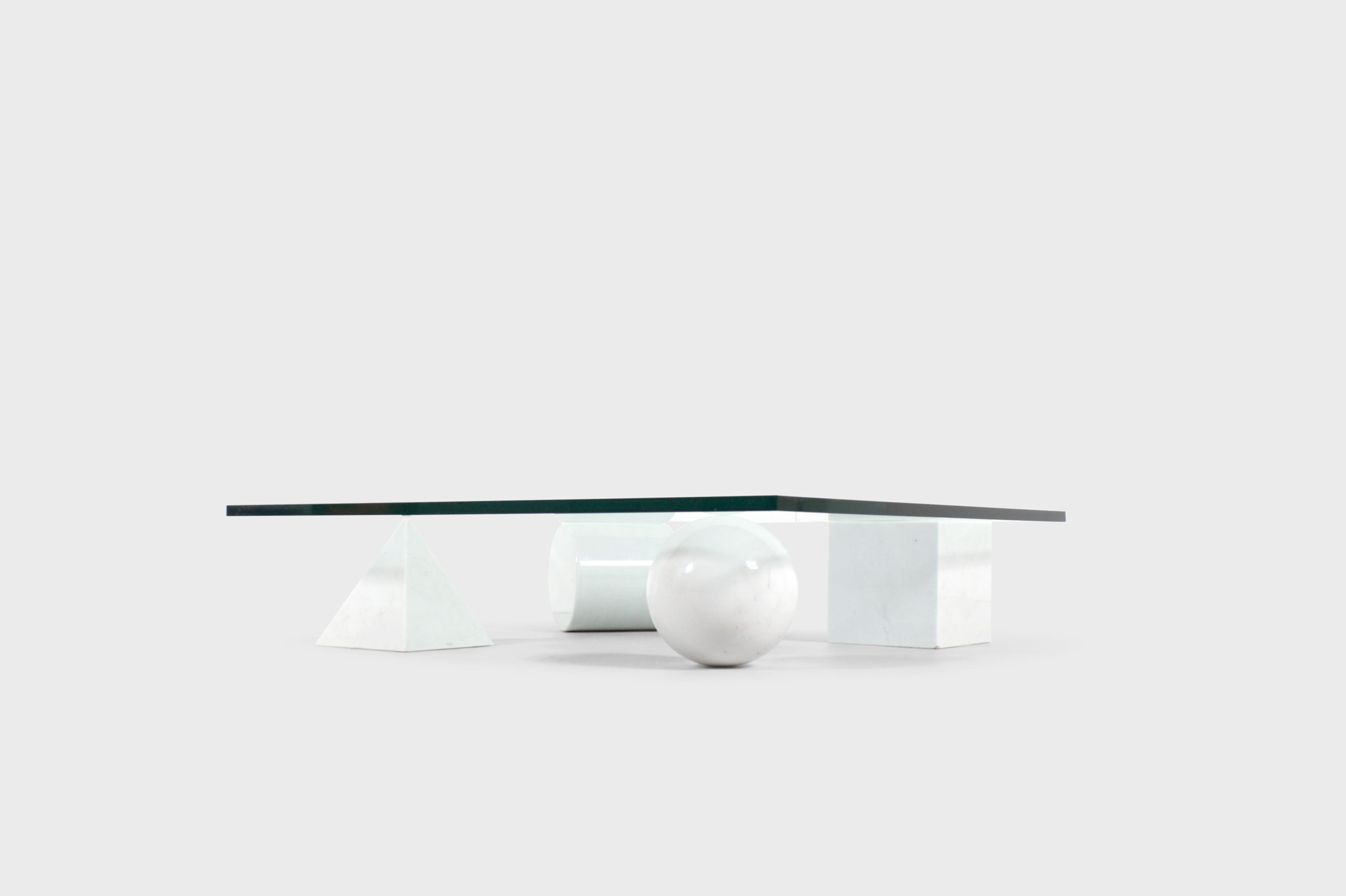 Impressive Metaphora coffee table in very good condition. This coffee table is designed by Massimo & Lella Vignelli in 1979. Four forms of the Euclidean geometry, the cube, the cylinder, the sphere and the pyramid, made of Carrara marble, represent the basis of the table. The marble forms support a thick clear glass top. The four elements are independent and can be positioned freely, without the table losing its own identity regardless the position of the elements it consists of.