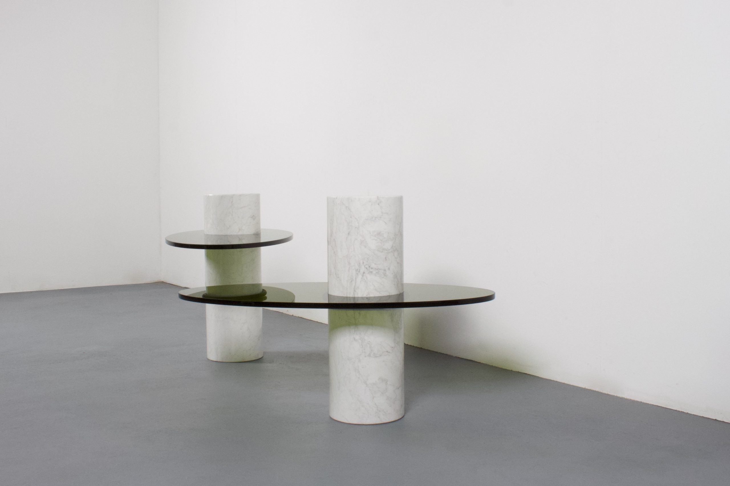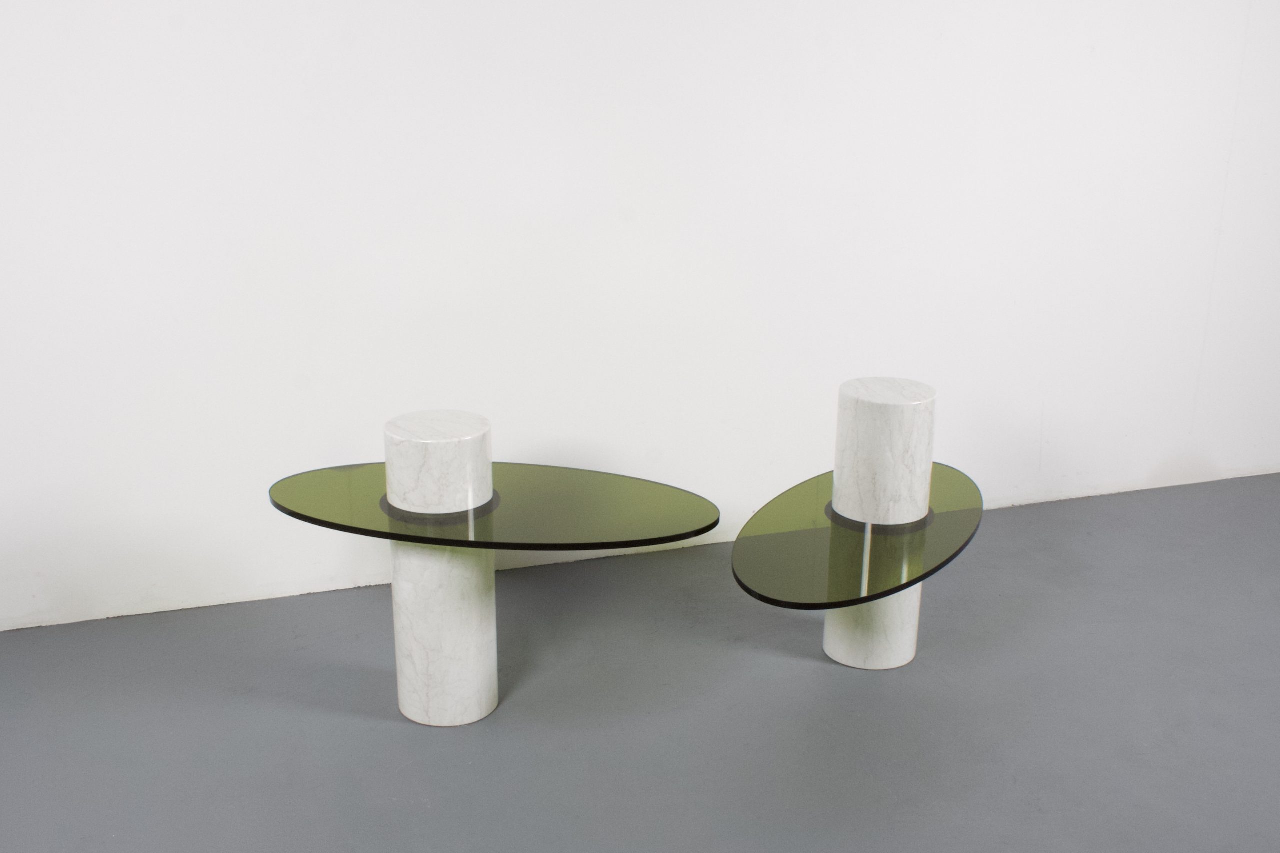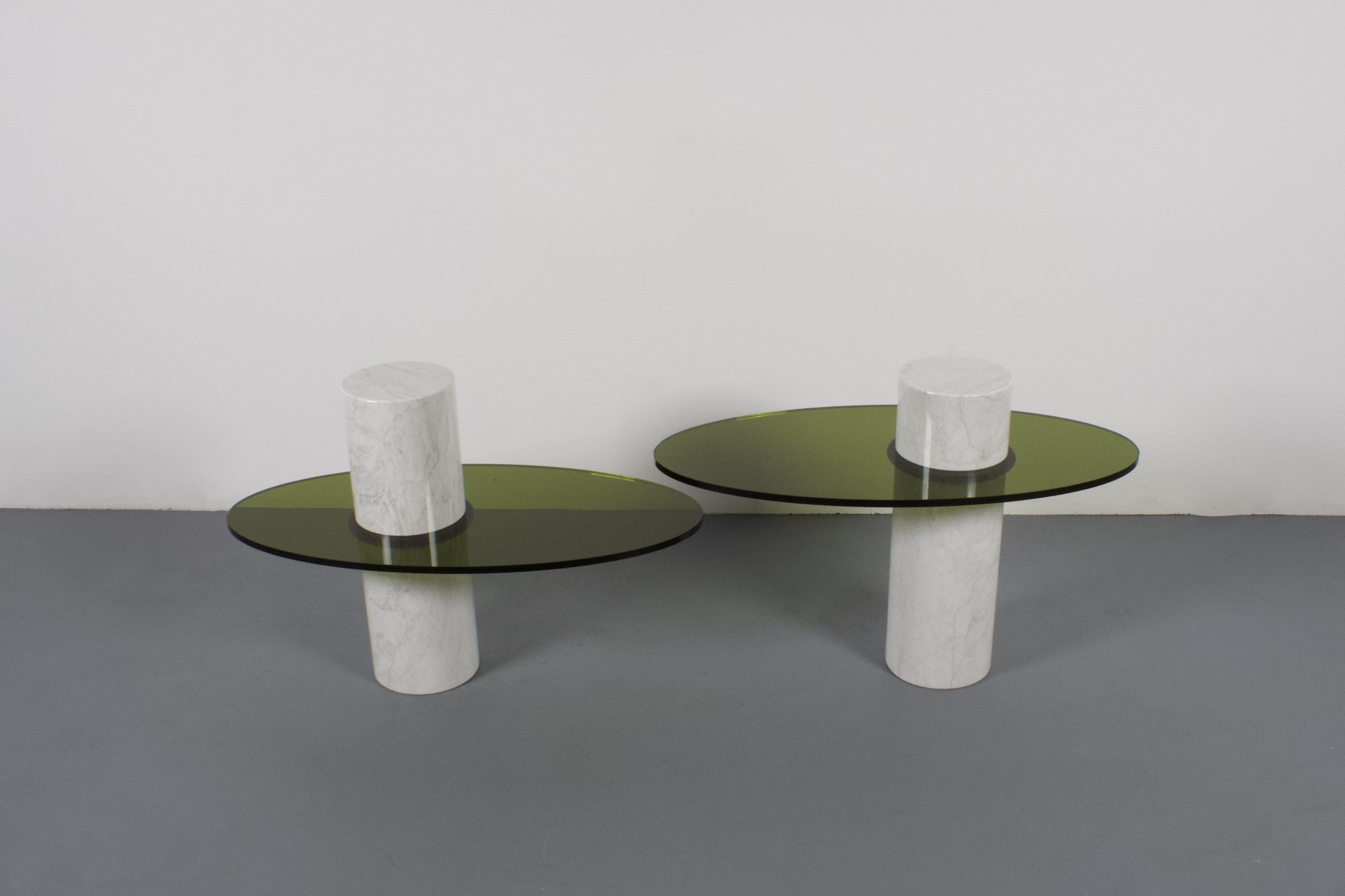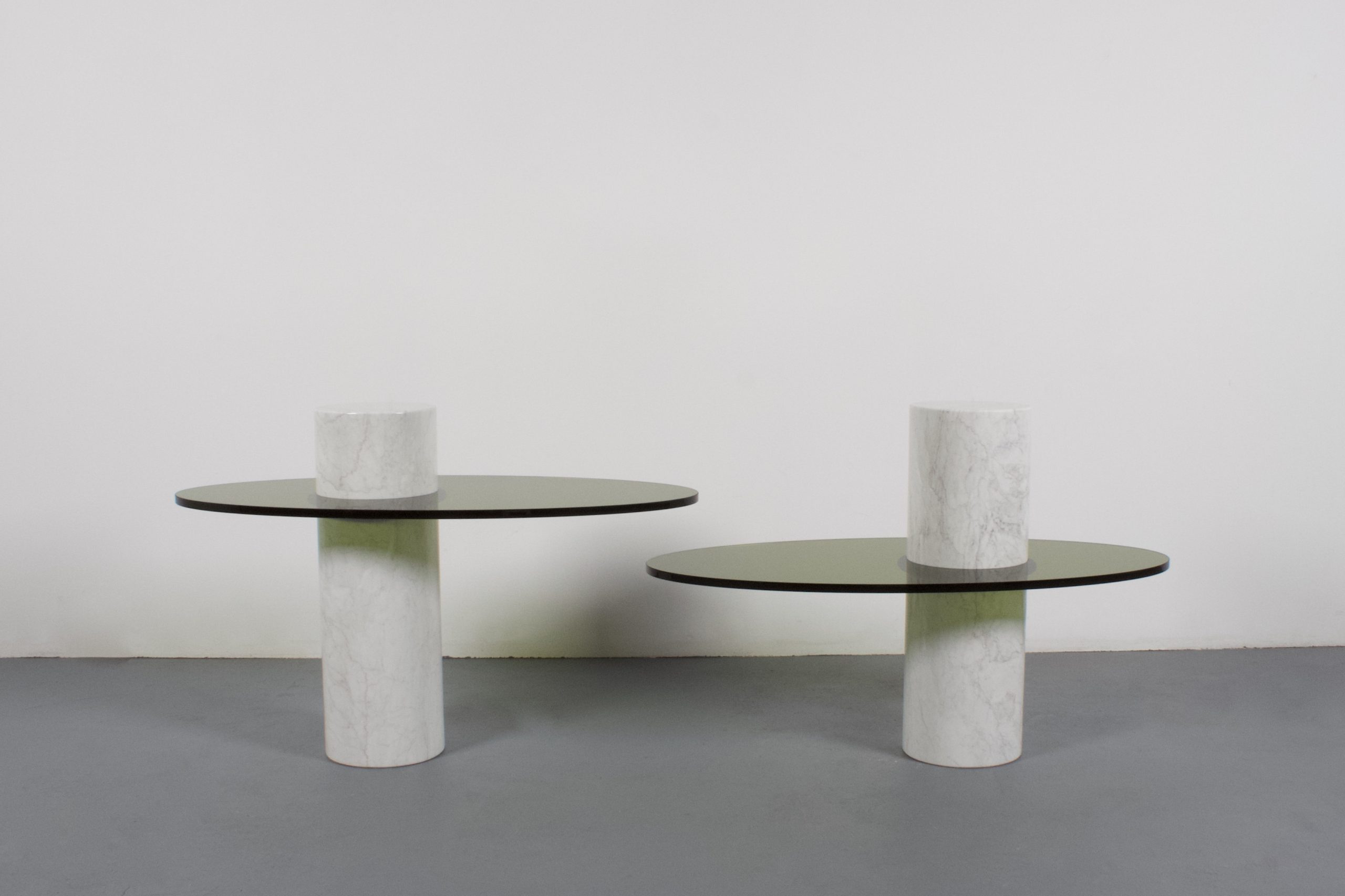These tables consist of a marble column which holds a Lucite top.