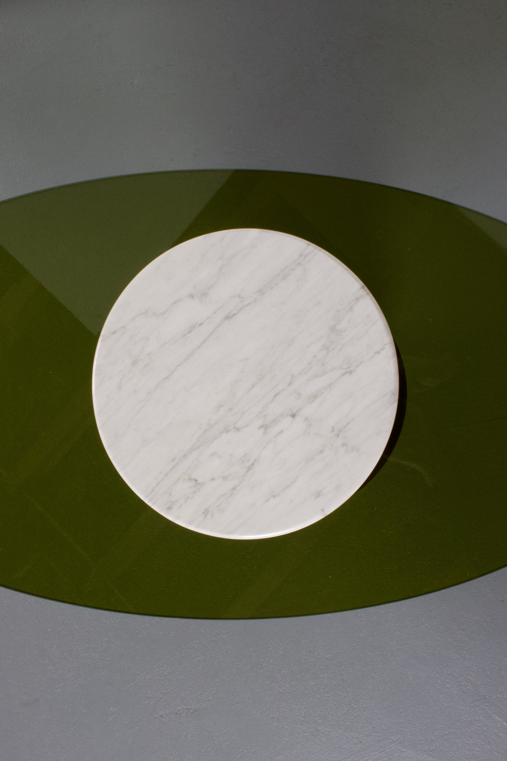 The oval top is made from a thick olive green Lucite.