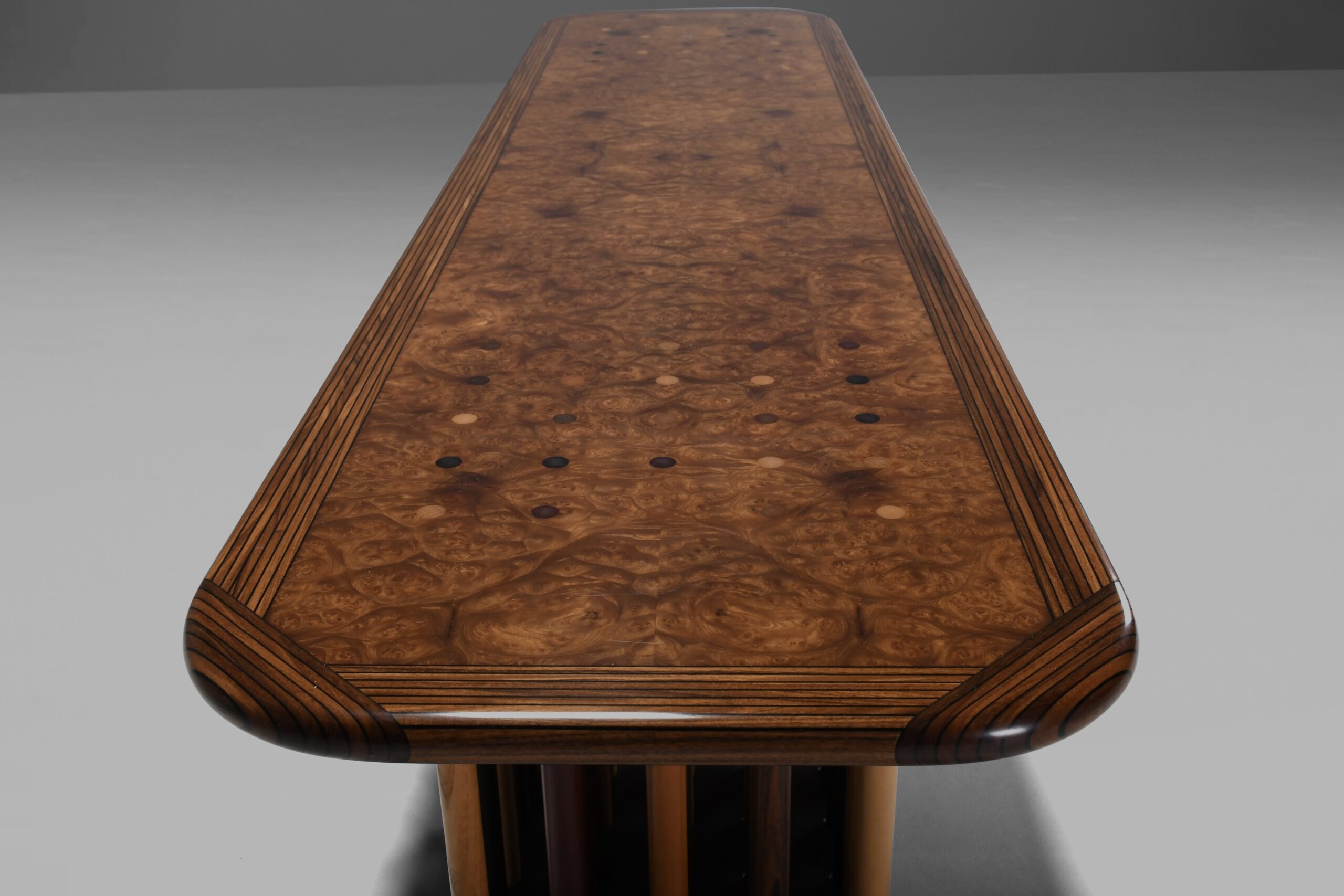 The inlayed burlwood veneer top showcases a harmonious blend of walnut, beech, and birch wood, creating a captivating interplay of colors and textures.