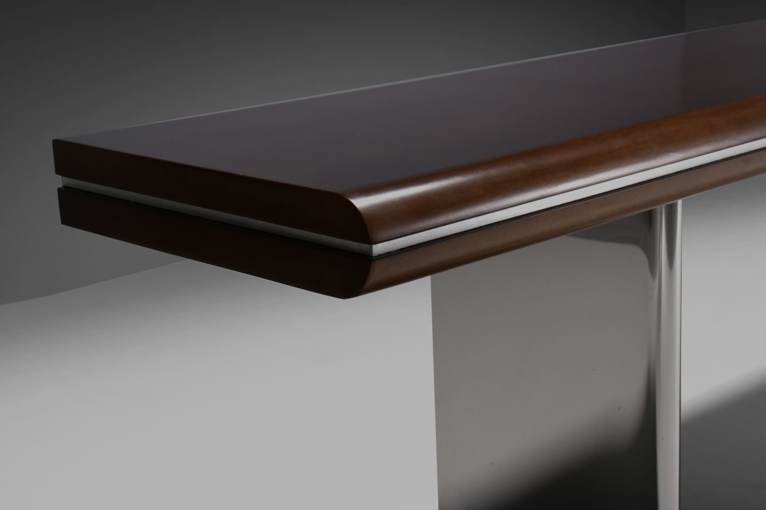 Beautiful console table in very good condition. Designed by Hans von Klier. Manufactured by Gruppo Skipper Italy in the 1970s. The top is made from beautiful massive mahogany which is separated by a chrome metal line. The two L-shaped legs are issued in stainless steel which is polished to a high gloss. This console is of a very high quality and the top has been refinished.