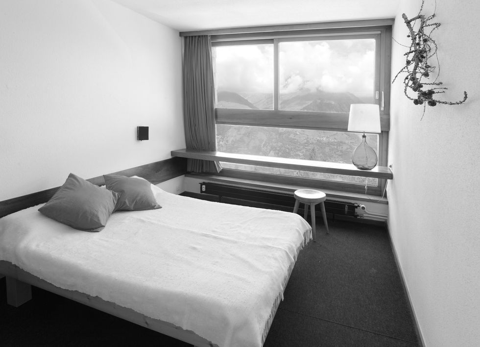Between 1969 and 1976 another three buildings were finished, including Le Versant Sud (pictured below), designed by Regairaz and Rey-Mille to accommodate 232 rooms. Meanwhile, Belles-Challes and Lauzières (video below) raised the resort to 17 floors, which has remained the largest structure of Les Arcs. Kitchens and bathrooms for the complex were prefabricated under Perriand, making them easy to mount via crane on such steep hills. Colors here are bright and vibrant, while the remaining environments have been articulated with a standard chalet palette: pine wood for furnishings and leather for select finishes. Minimalism of the spaces pushes guests to look beyond, admiring the surrounding mountains with each room featuring views onto the Alps. Contrary to standard practice at the time, the kitchen was left open with a bar top counter giving onto the living area. In this way, the kitchen wasn’t trapped behind closed doors, but instead became the center of the home — a solution so before its time, that some of the first guests were upset by the new layout.